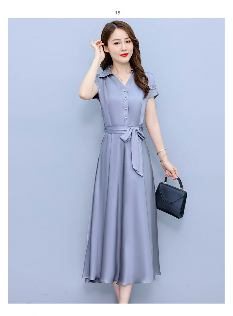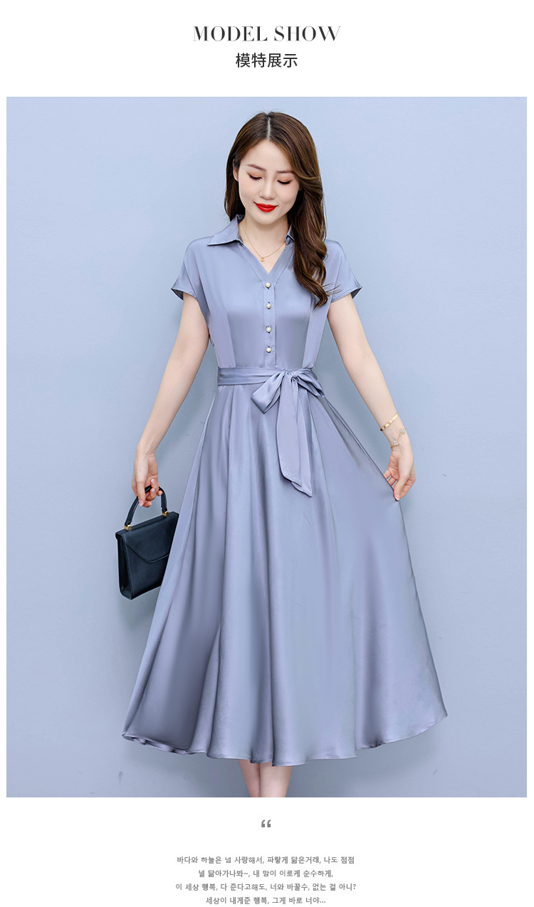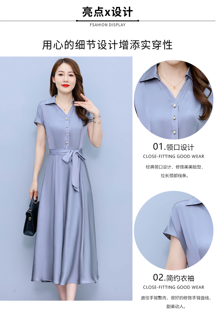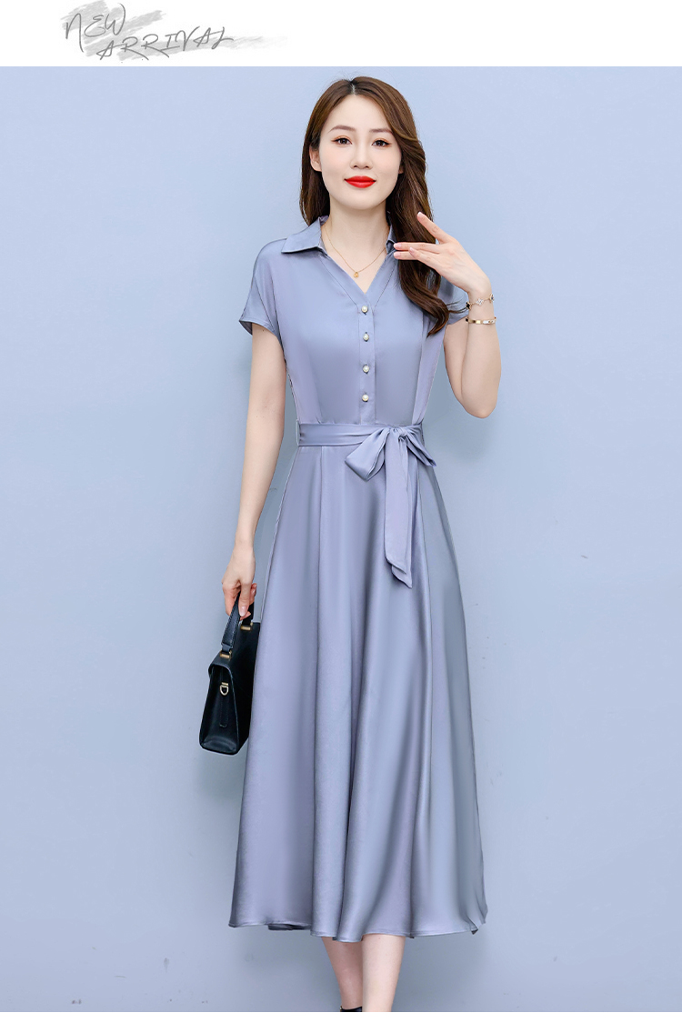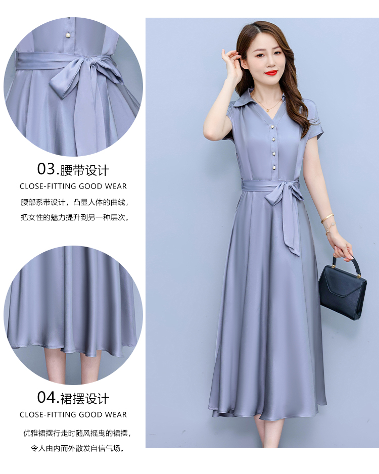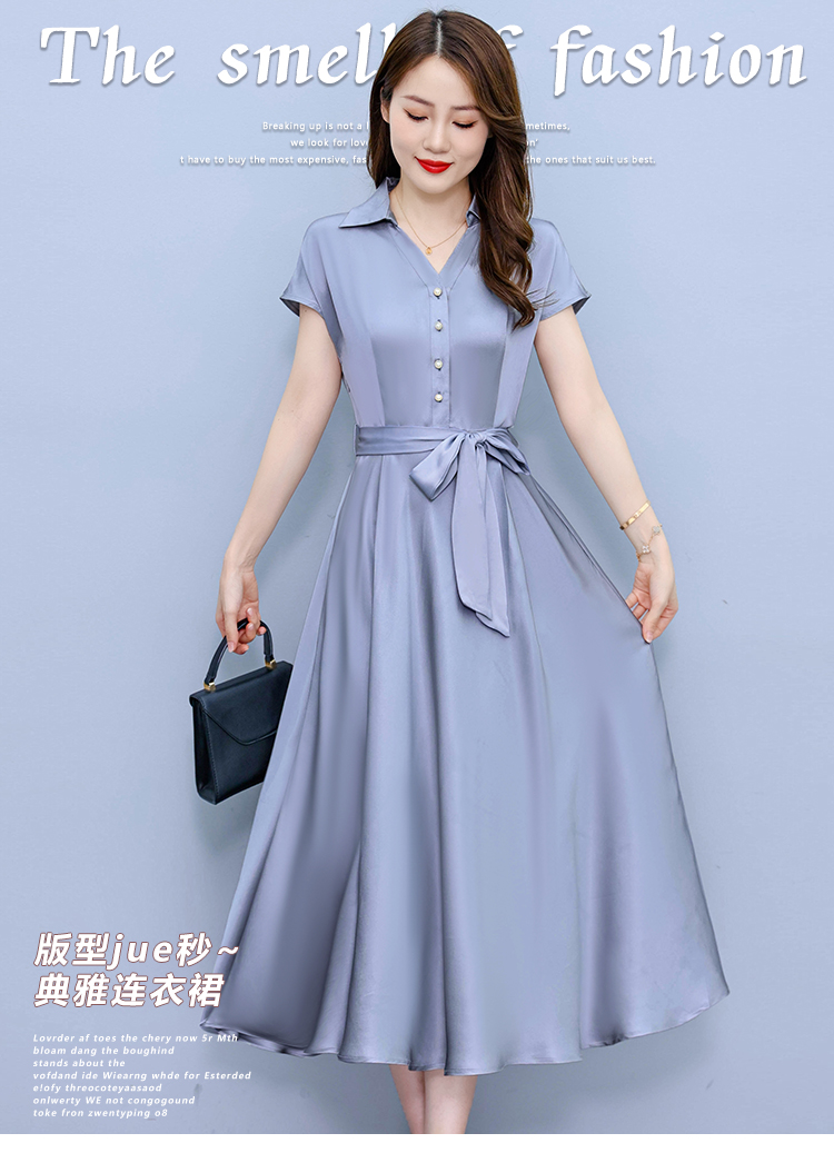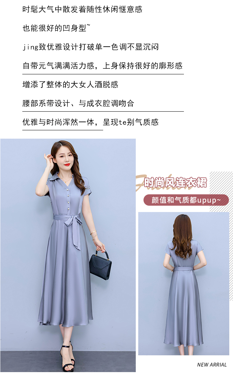 RY2527# 实拍醋酸缎面短袖连衣裙气质显瘦2026夏季洋气遮肚纯色女装