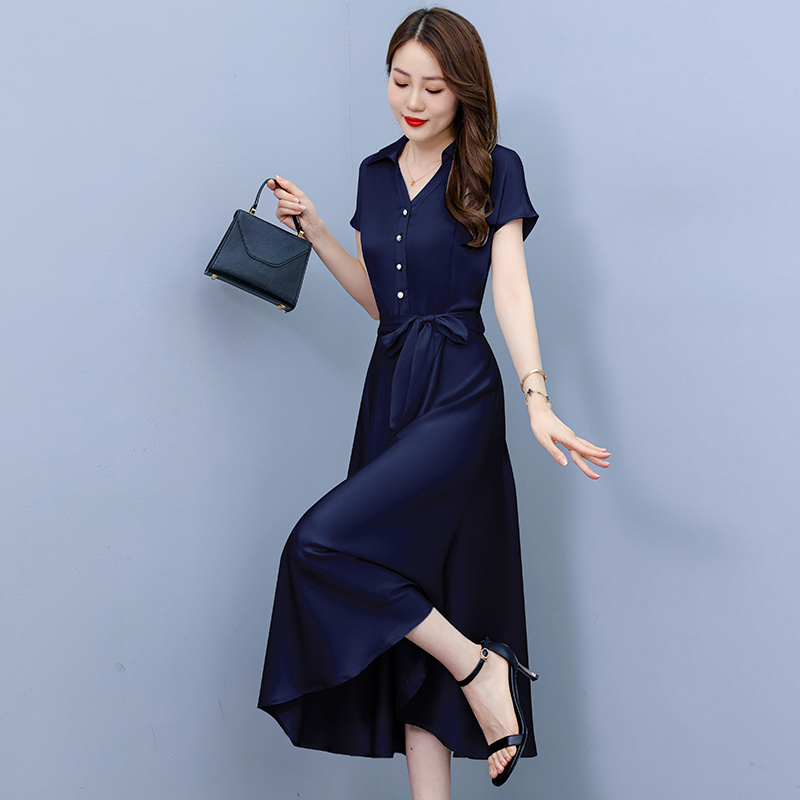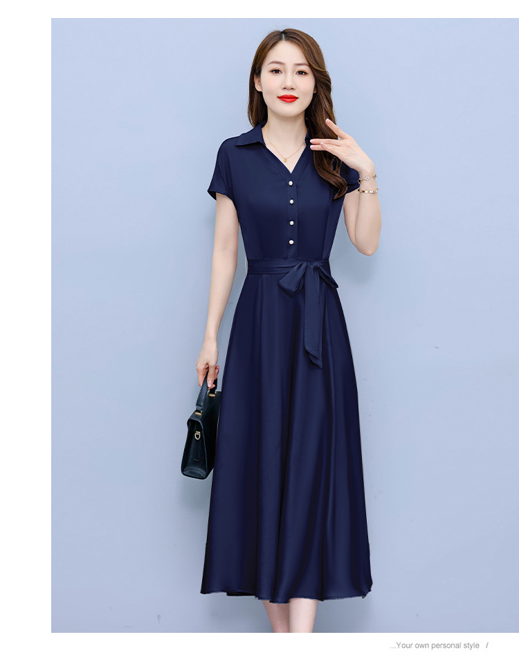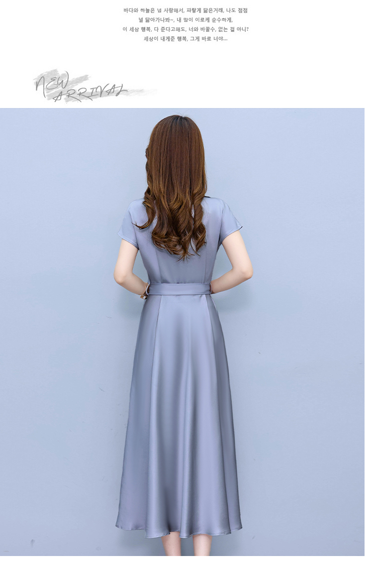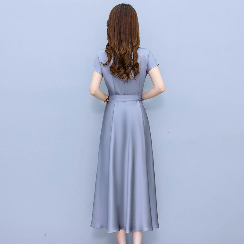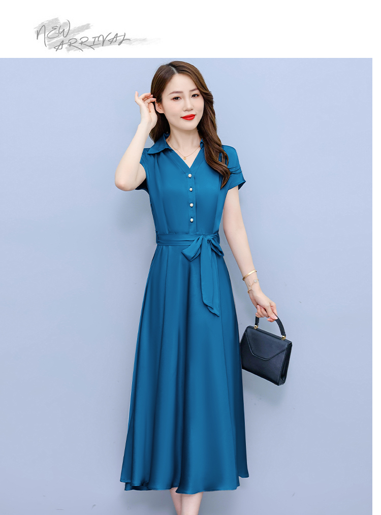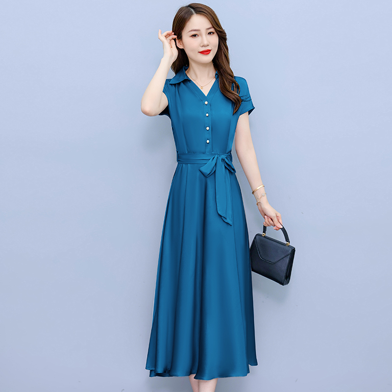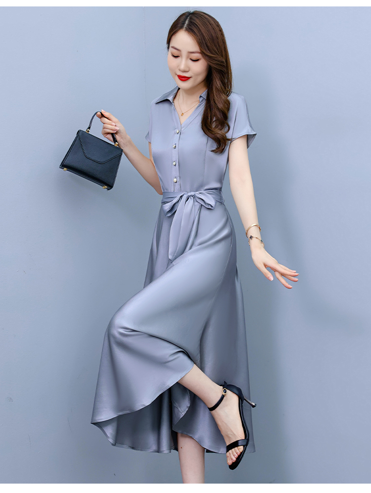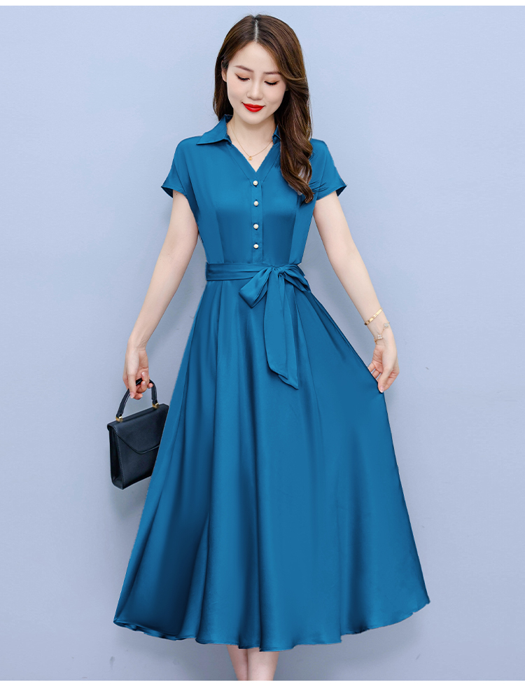 RY2527# 实拍醋酸缎面短袖连衣裙气质显瘦2026夏季洋气遮肚纯色女装