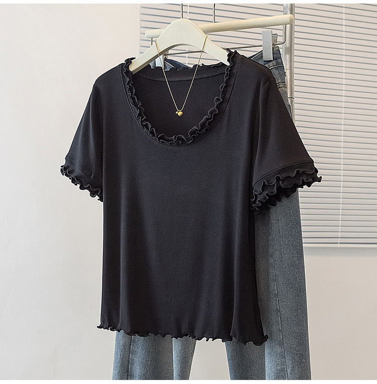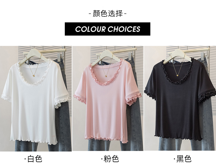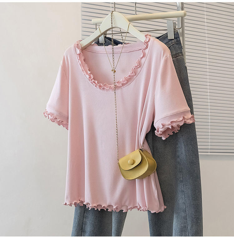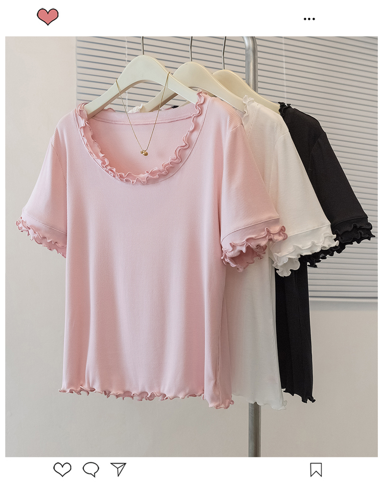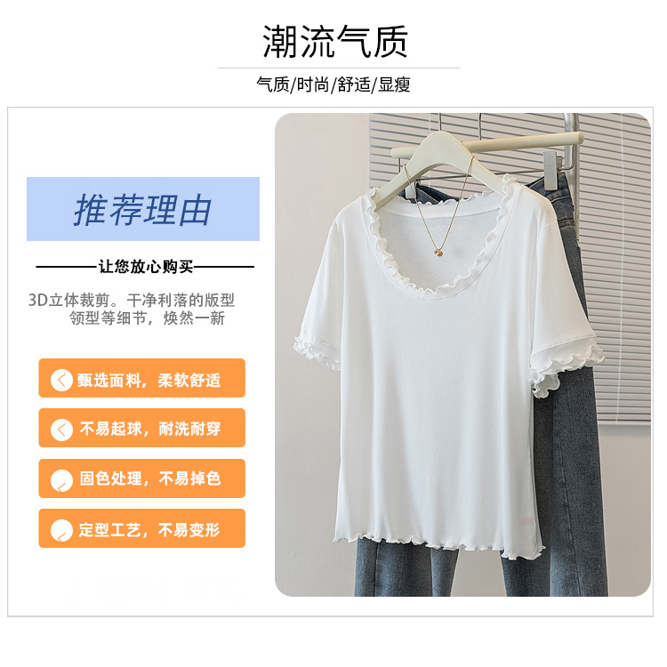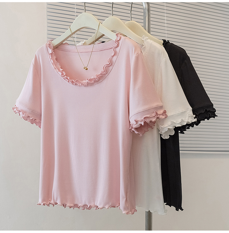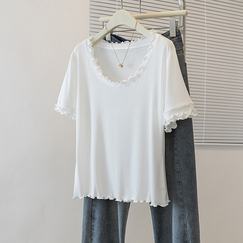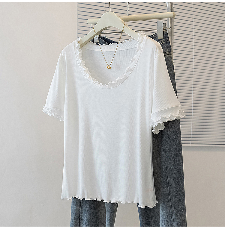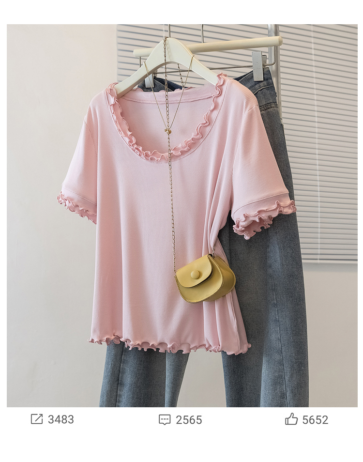 RY2554# 实拍大码正肩短袖T恤女木耳边U领修身显瘦夏季新款韩系简约上衣潮