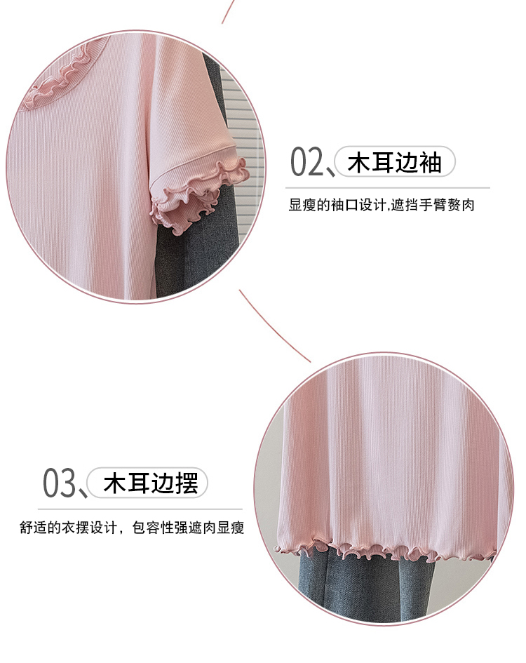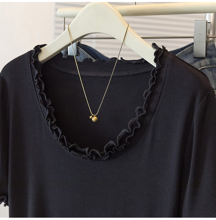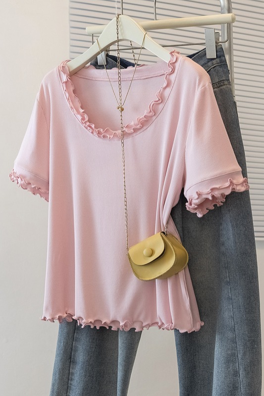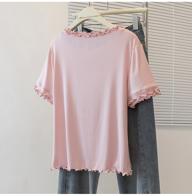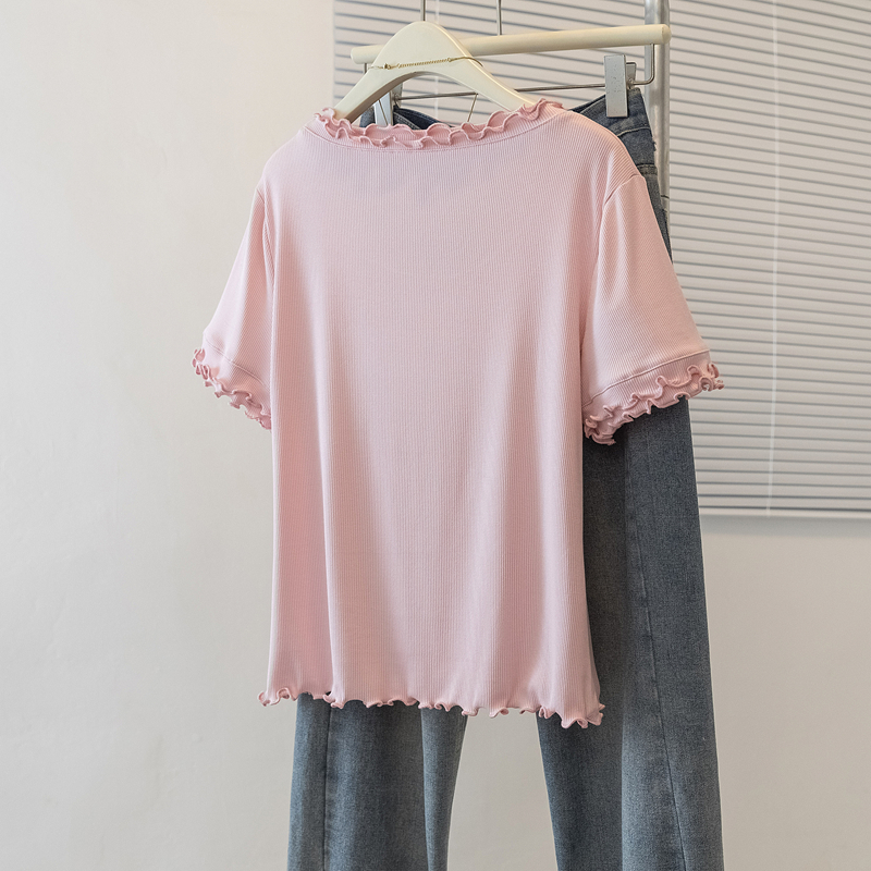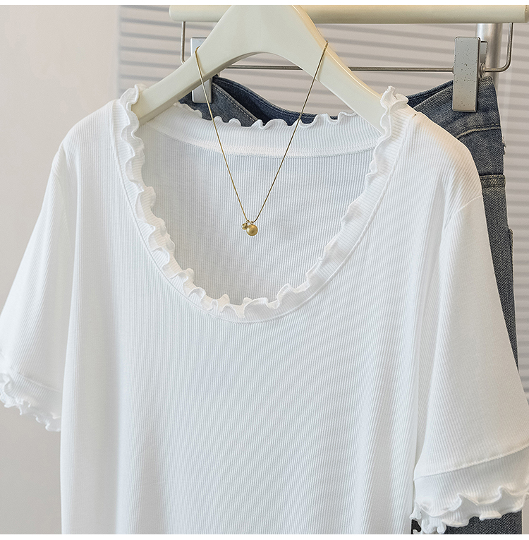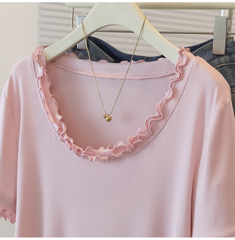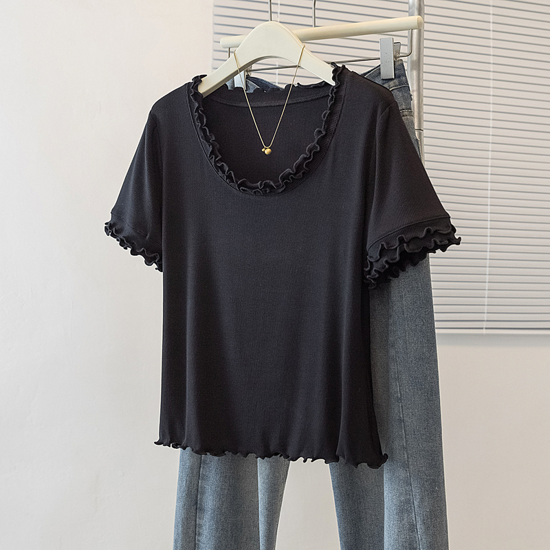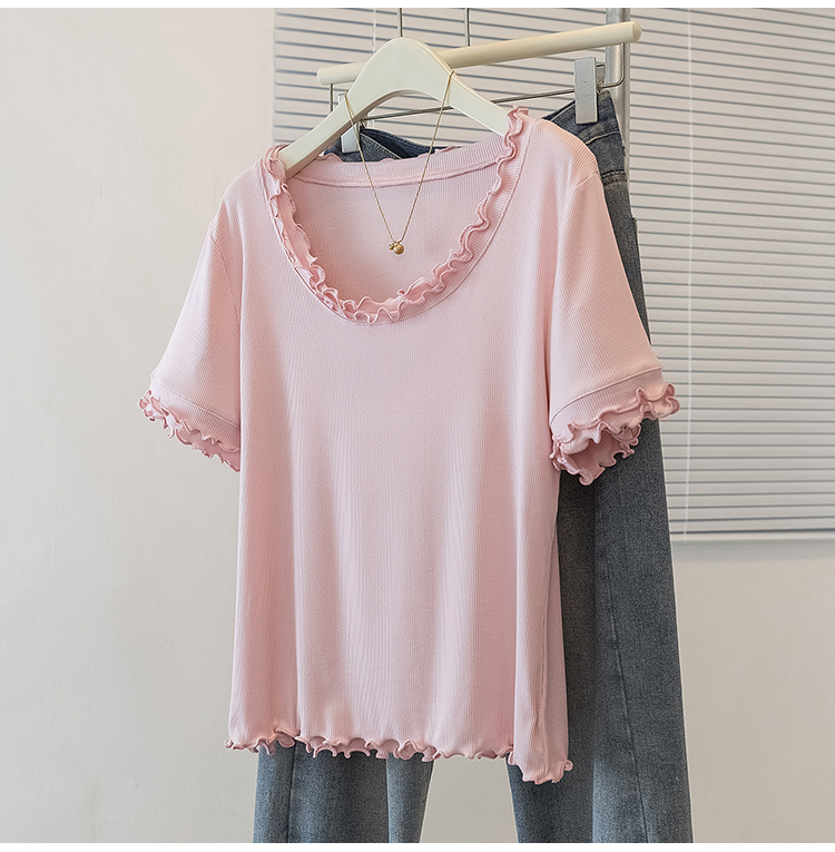 RY2554# 实拍大码正肩短袖T恤女木耳边U领修身显瘦夏季新款韩系简约上衣潮