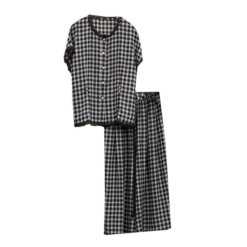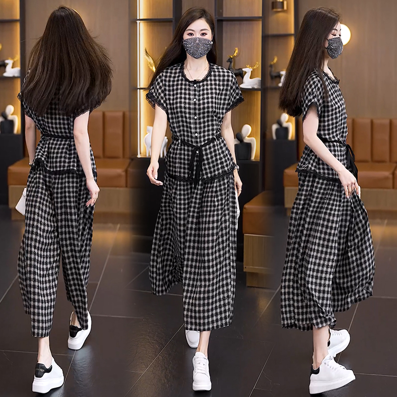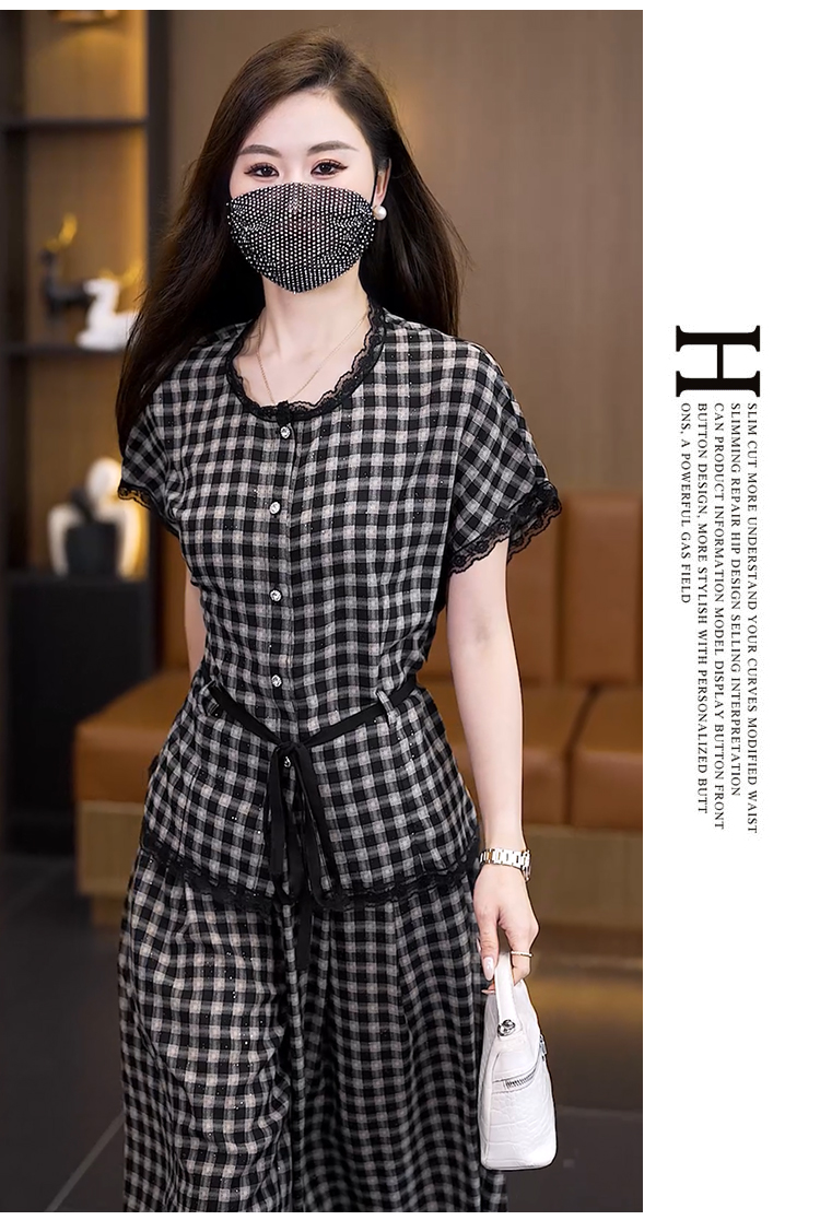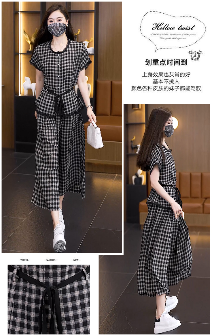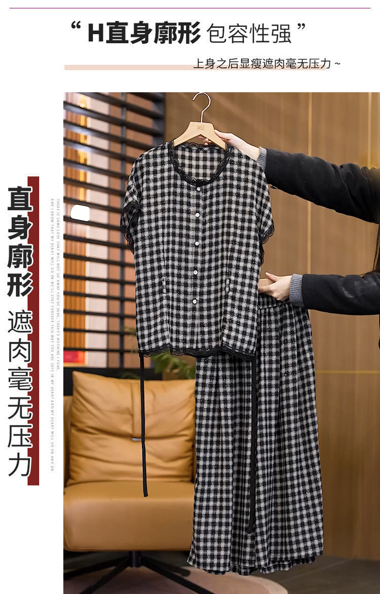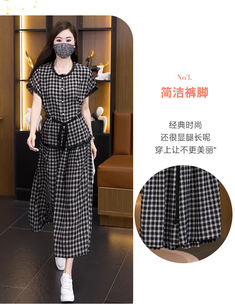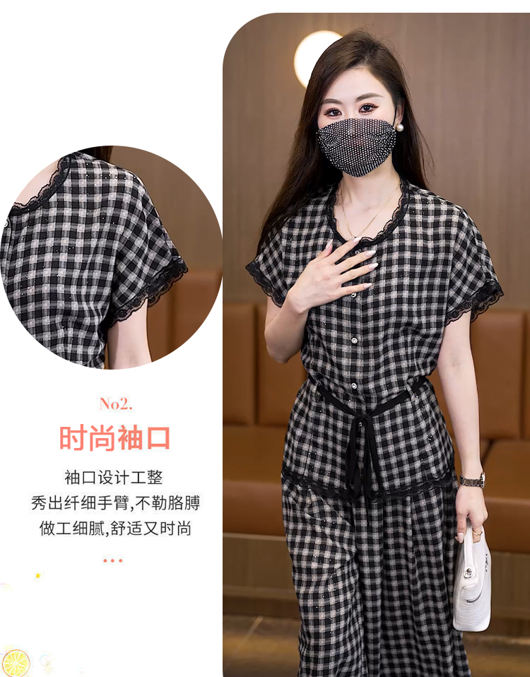 RY2565# 实拍大码套装女夏2026蕾丝边短袖上衣+高腰阔腿裤宽松遮肚两件套