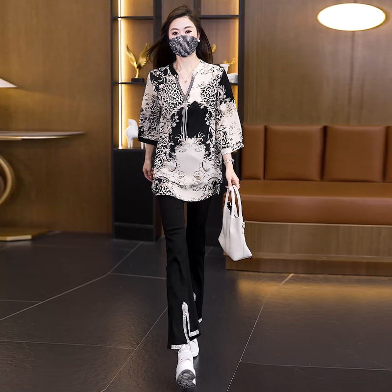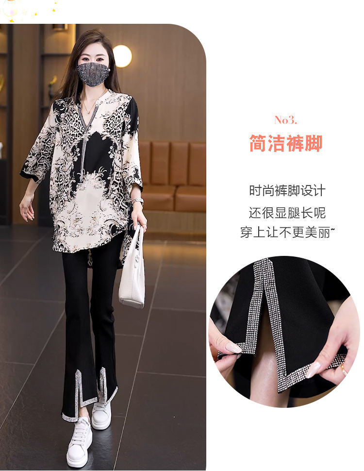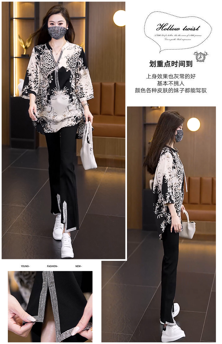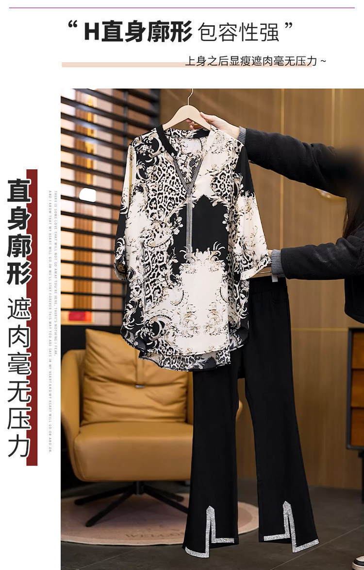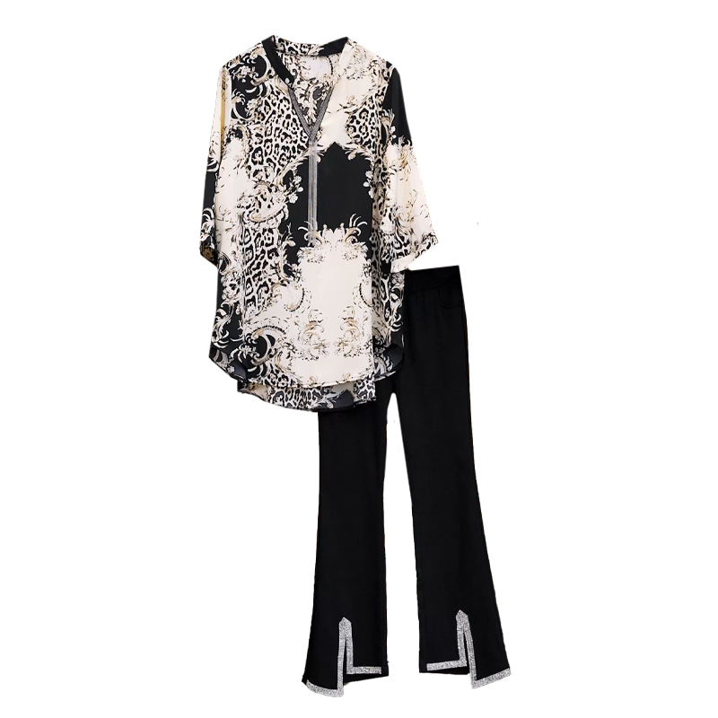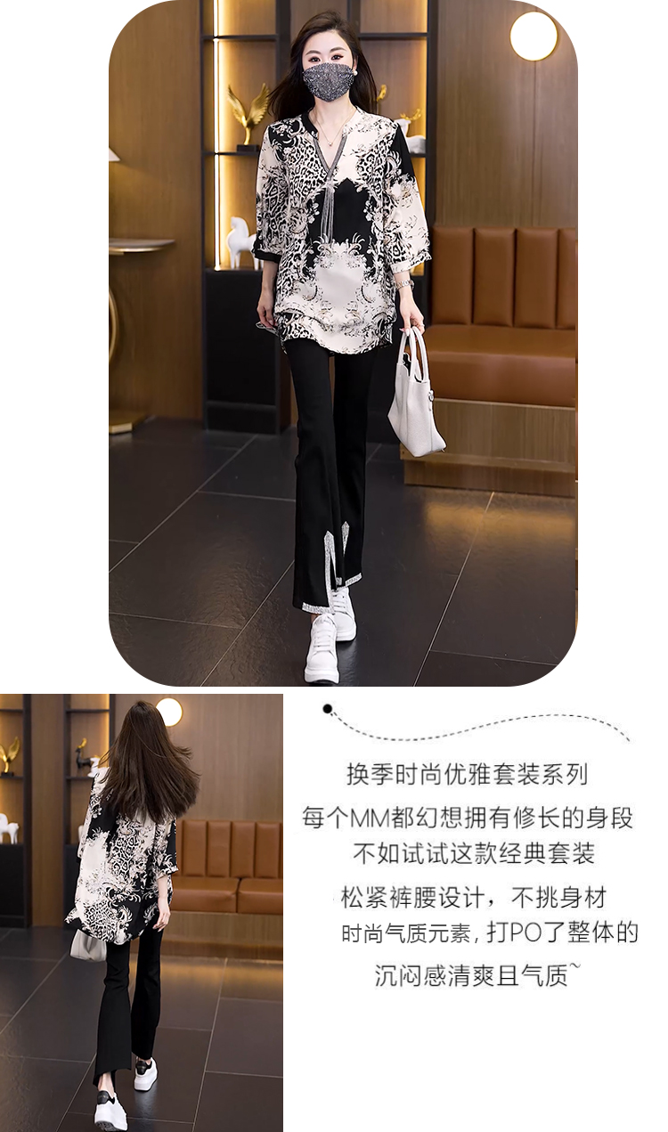 RY2566# 实拍大码显瘦套装2026夏季宽松透气印花T恤弹力开叉微喇裤两件套