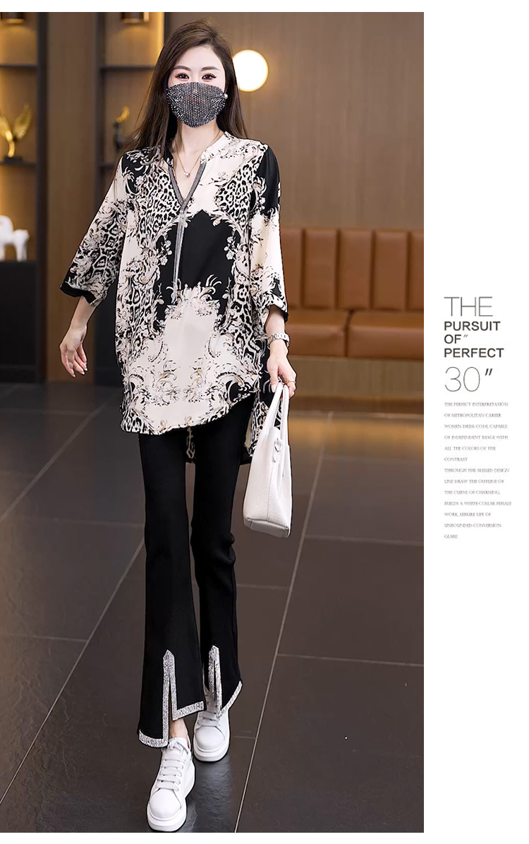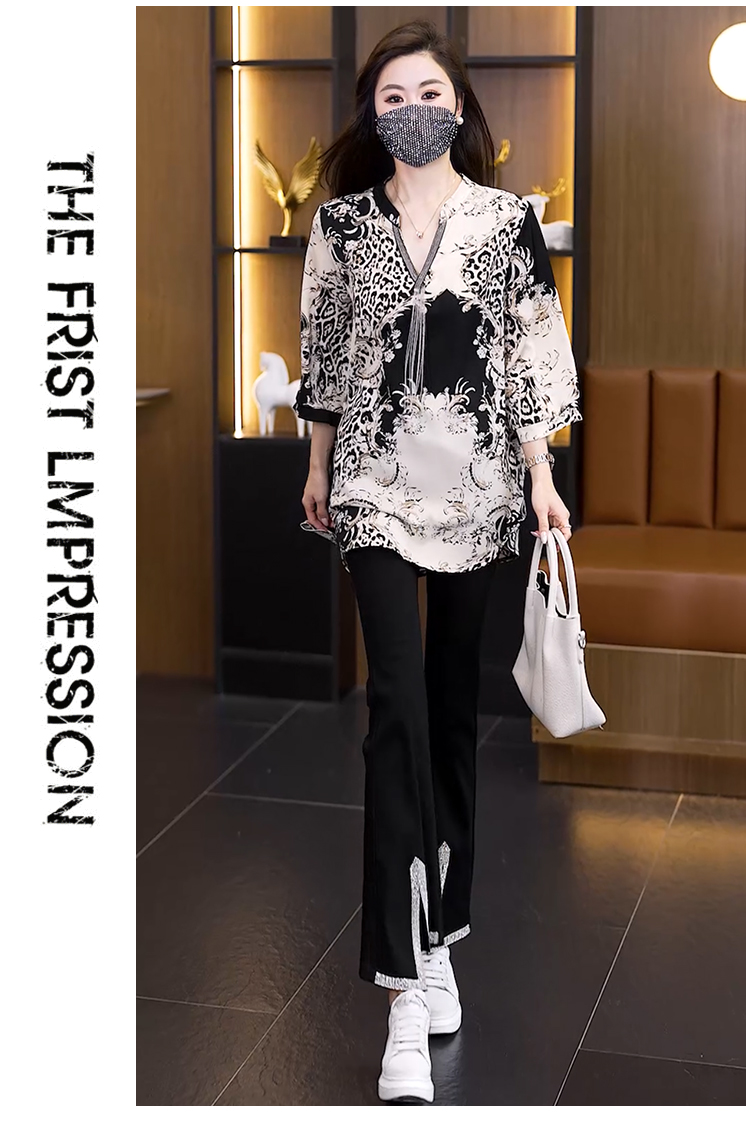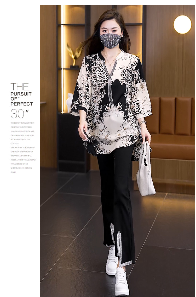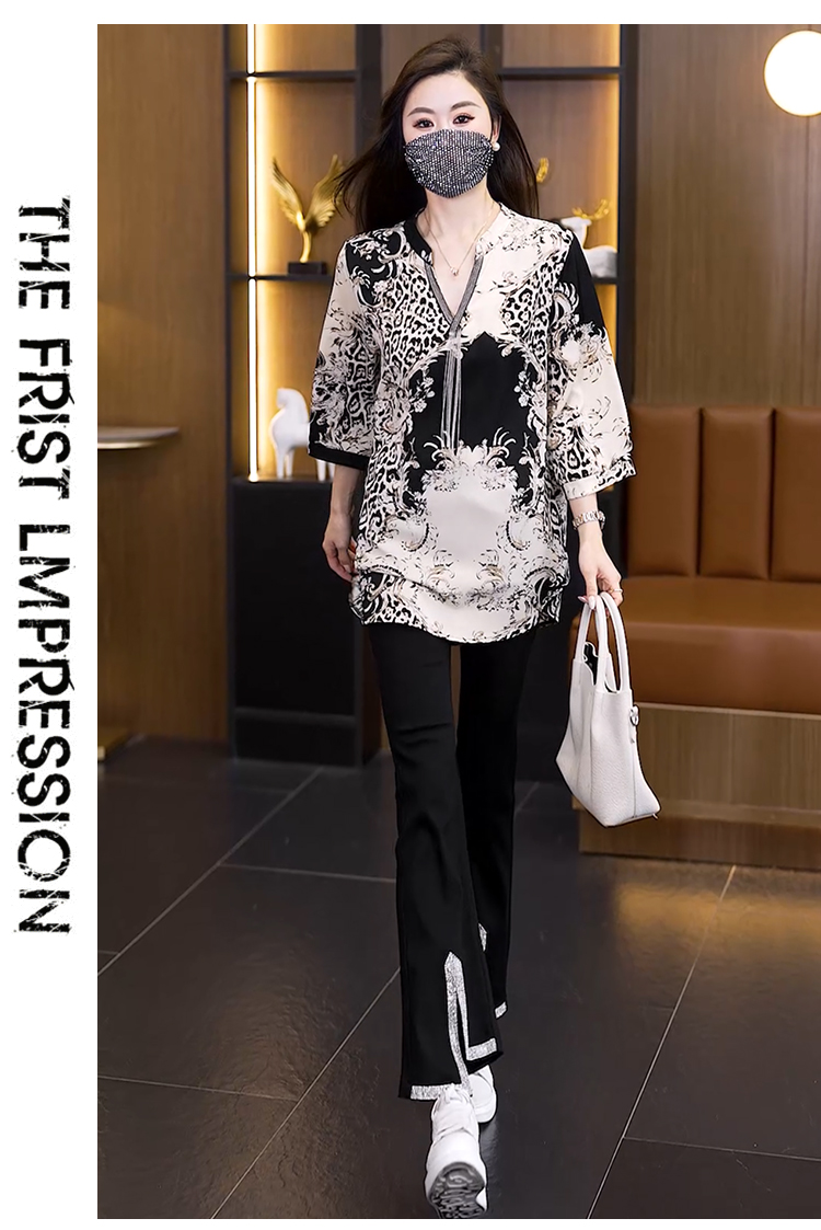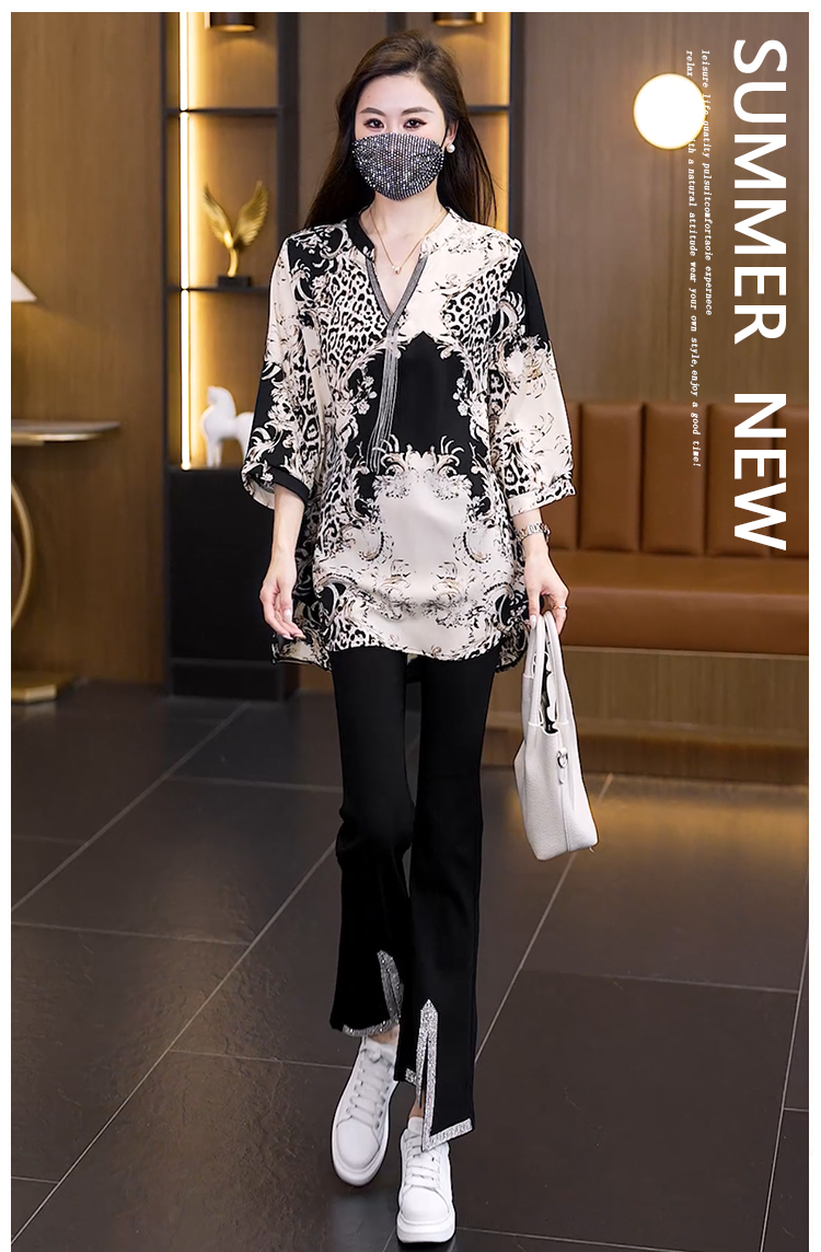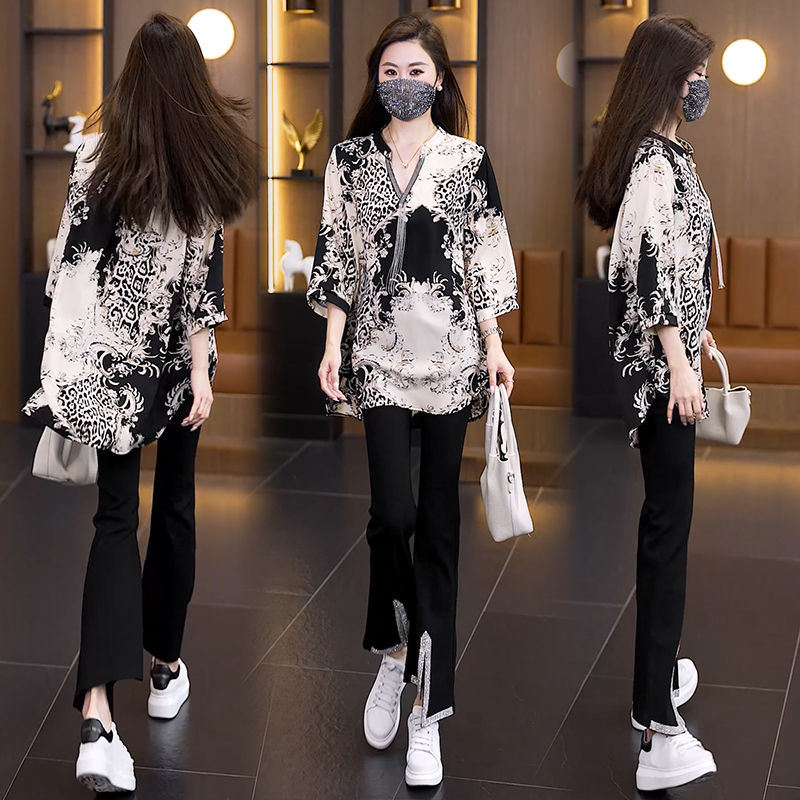 RY2566# 实拍大码显瘦套装2026夏季宽松透气印花T恤弹力开叉微喇裤两件套