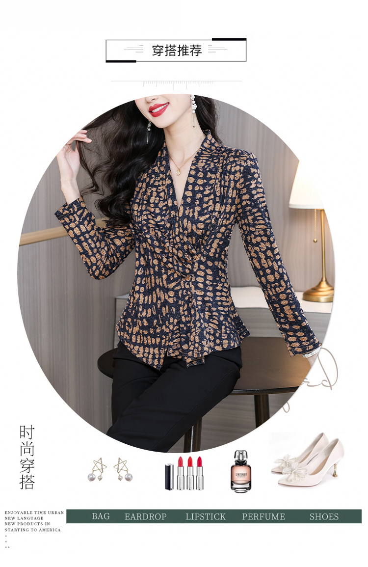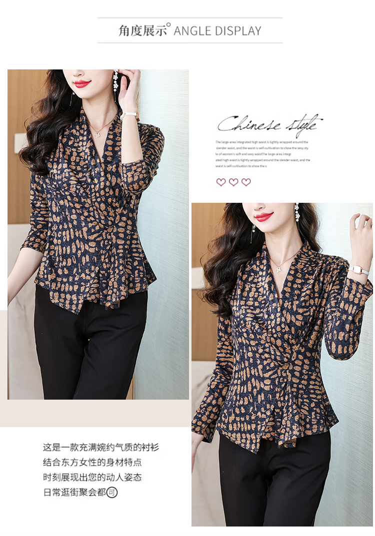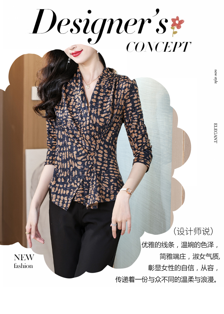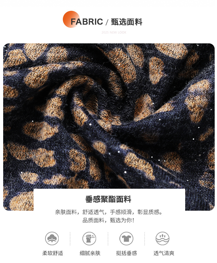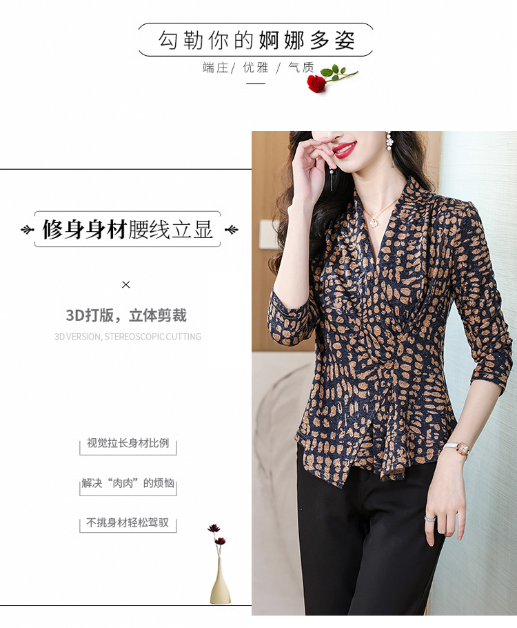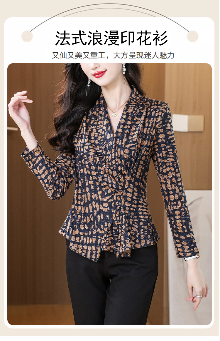 RY2583# 2026春季新款高雅包裹V领深蓝米豹纹高弹针织收腰气质小衫