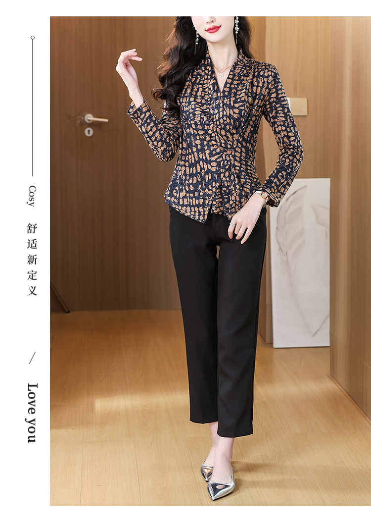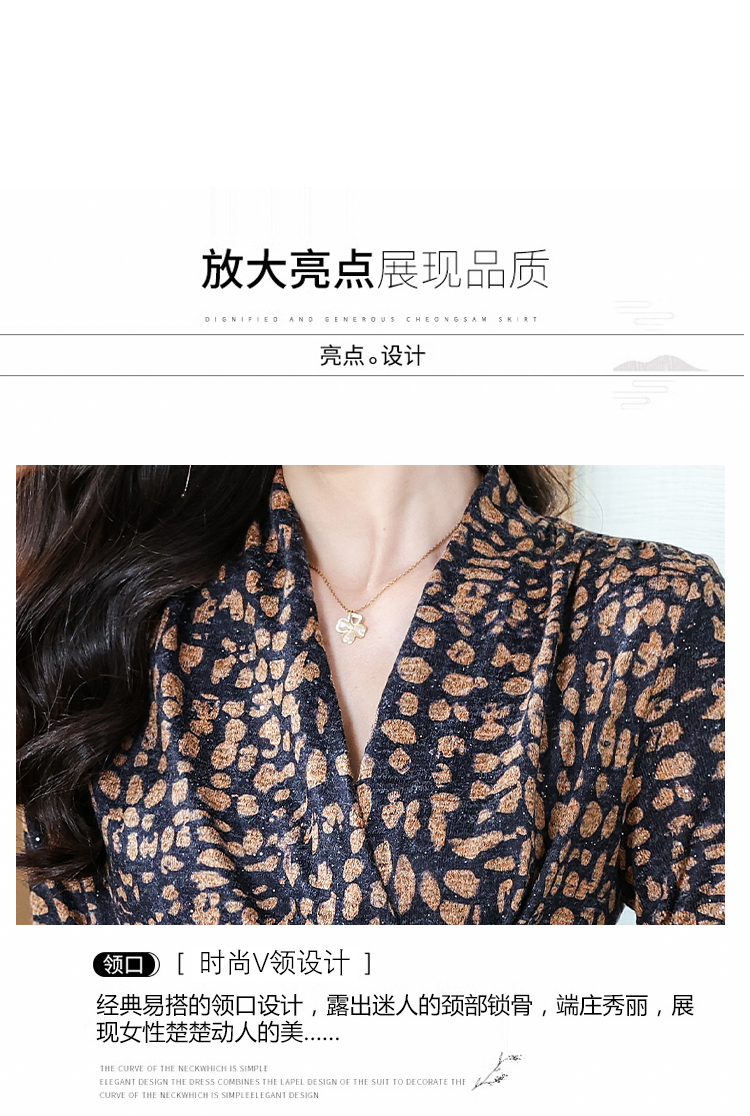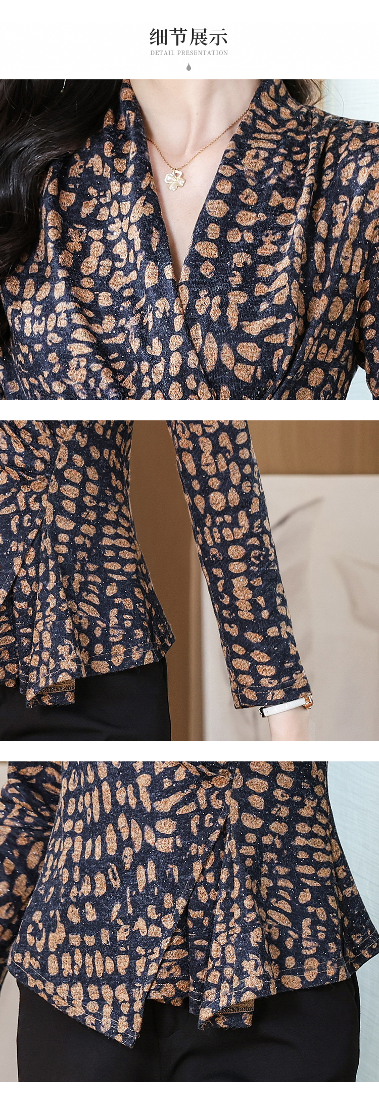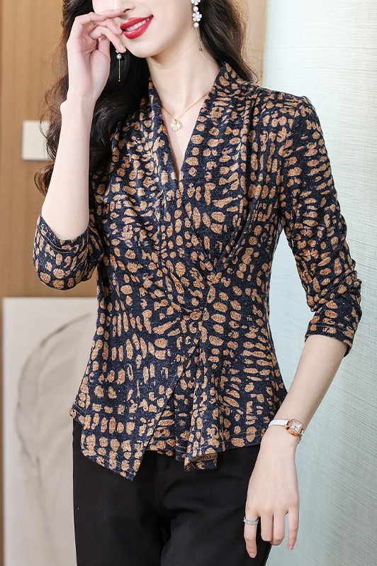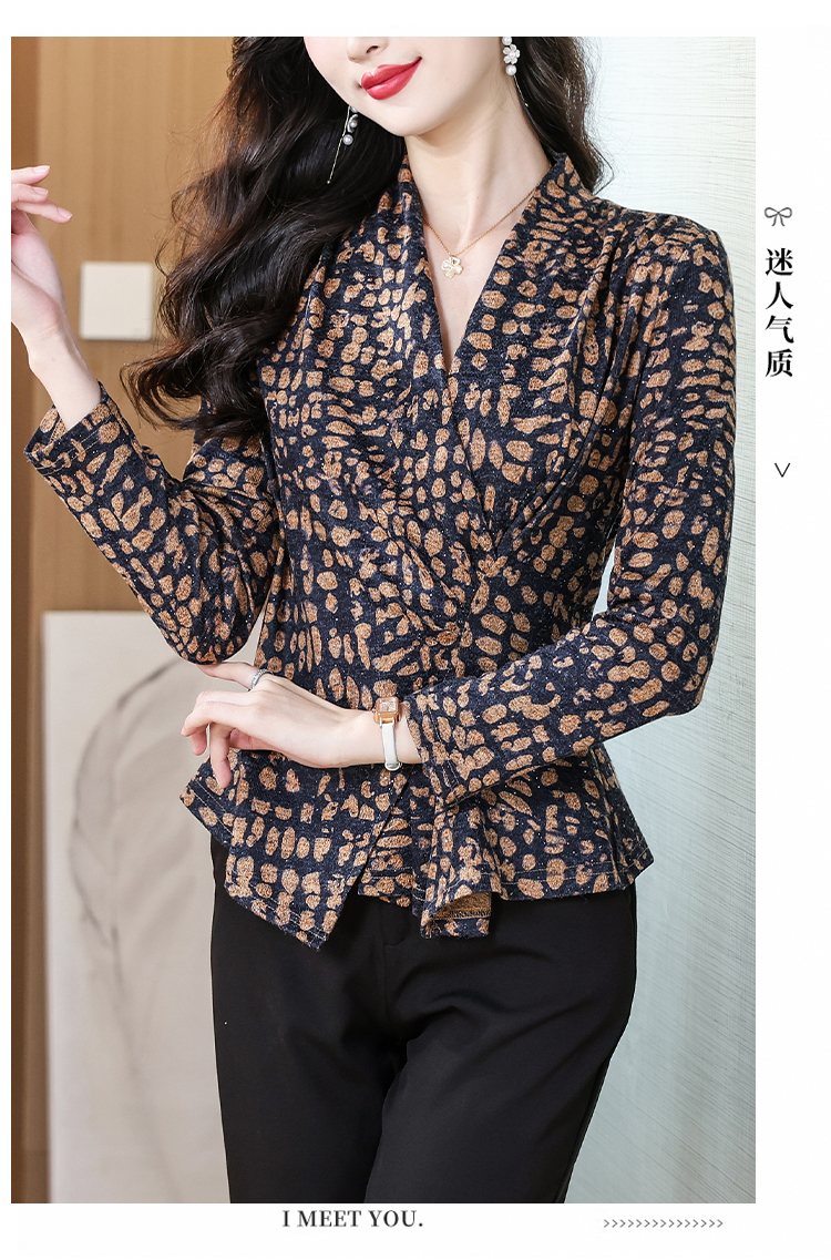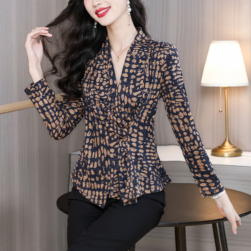 RY2583# 2026春季新款高雅包裹V领深蓝米豹纹高弹针织收腰气质小衫