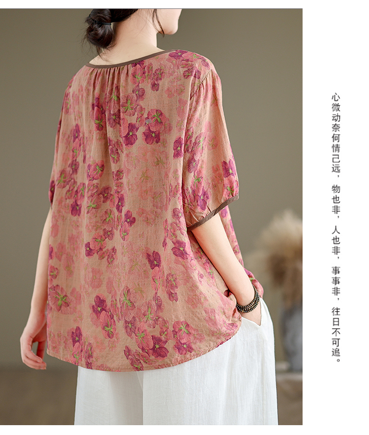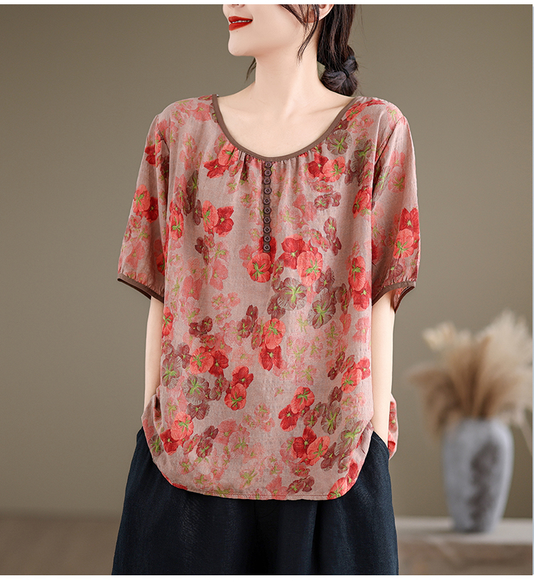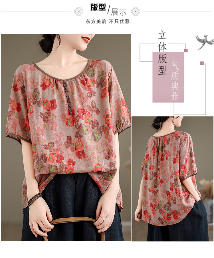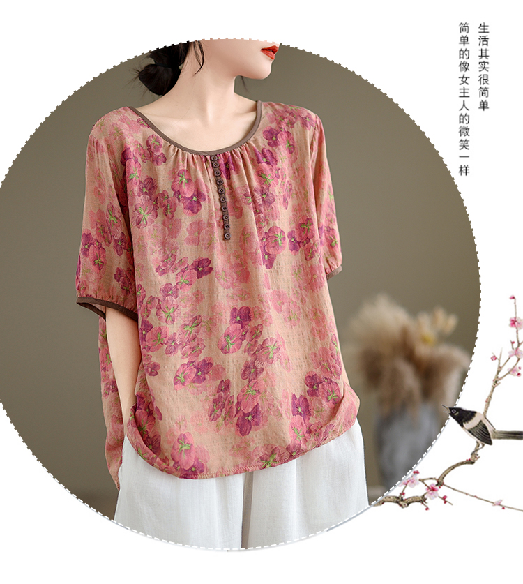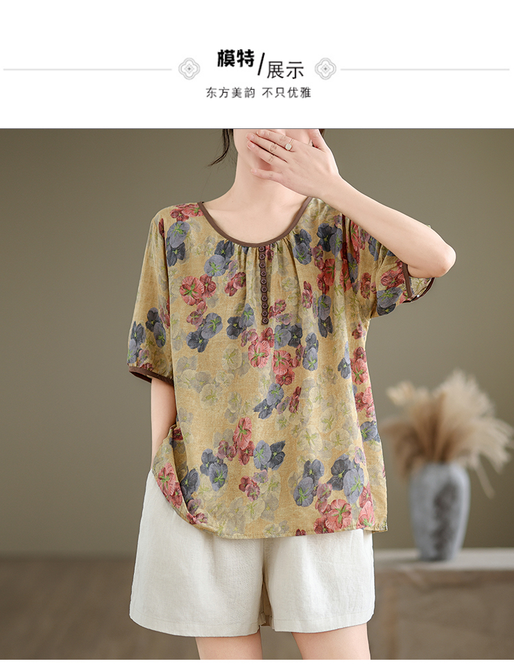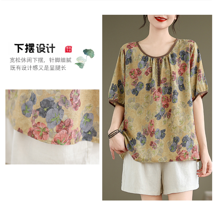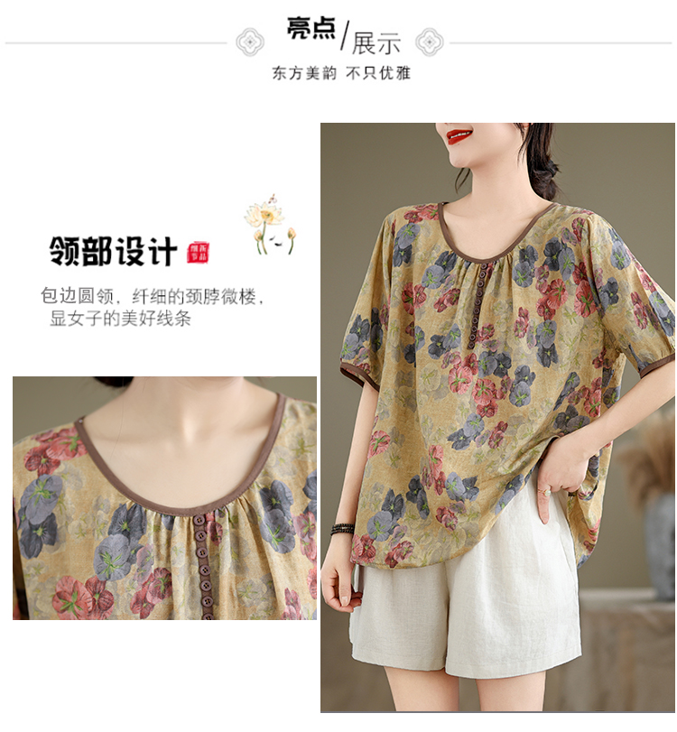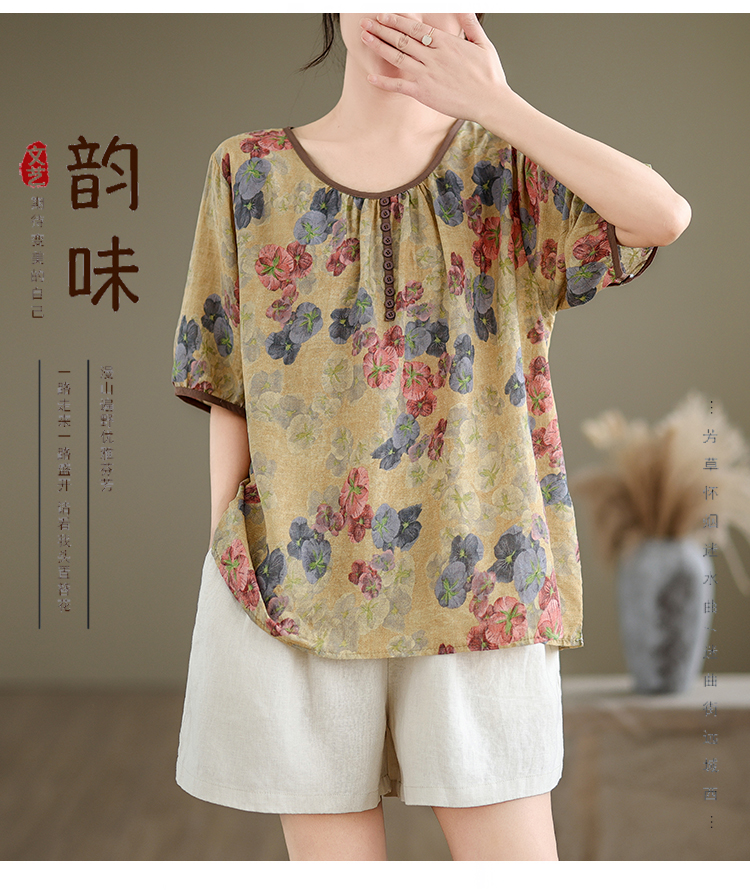 RY2587# 实拍夏季新款文艺休闲短袖小衫圆领套头印花宽松上衣女