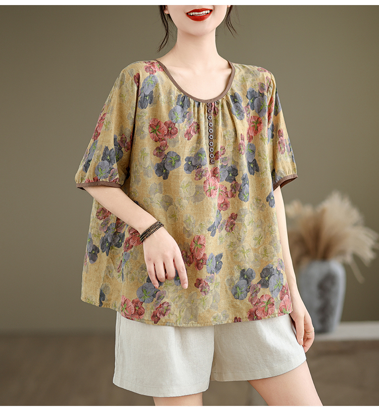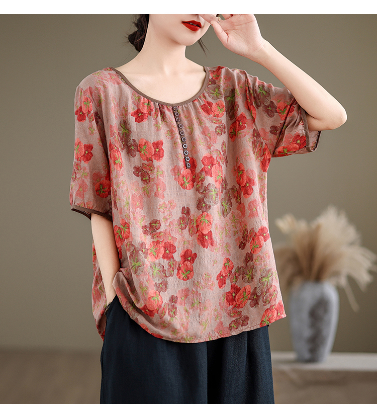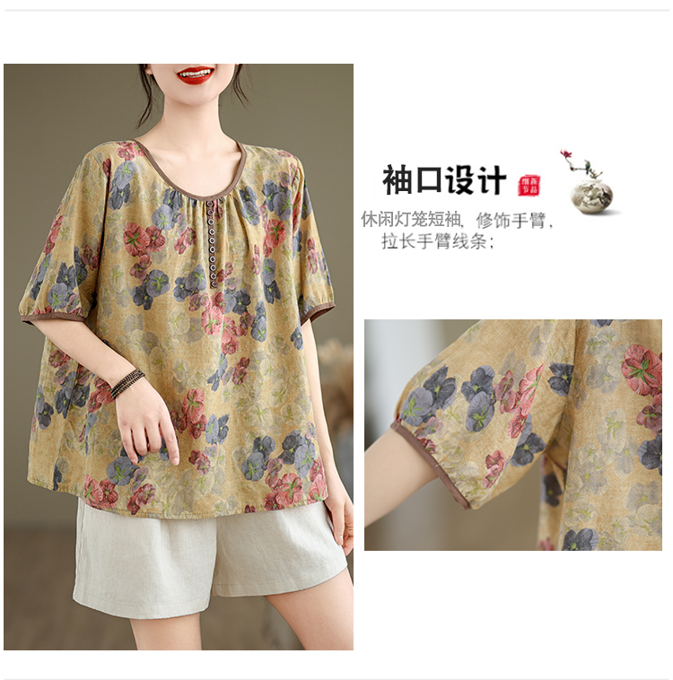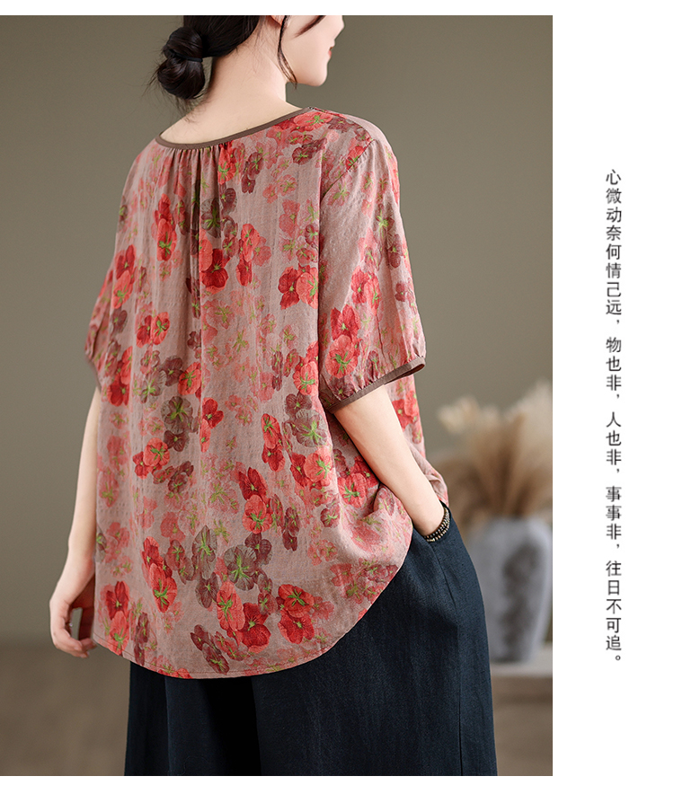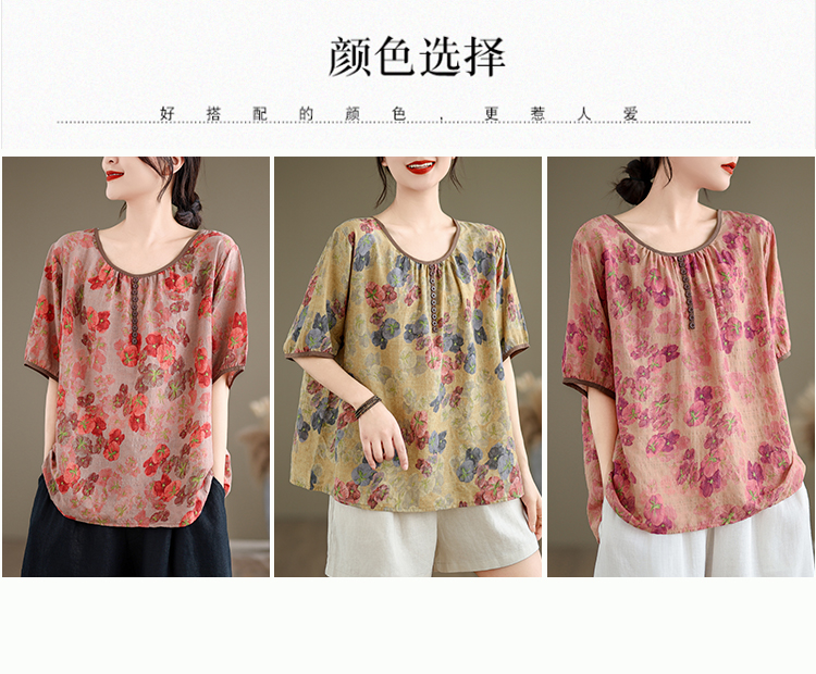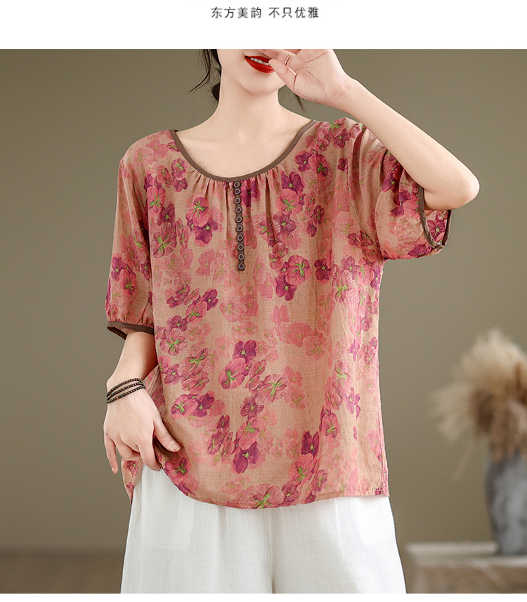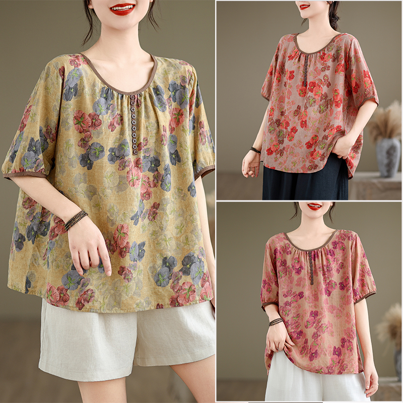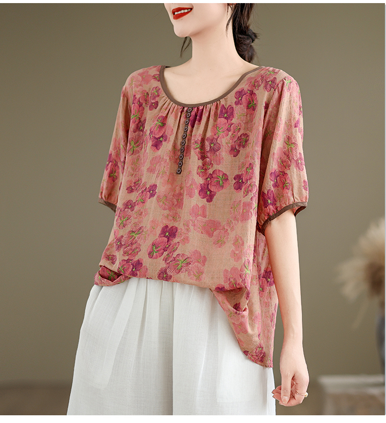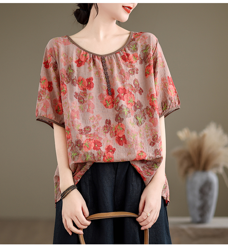 RY2587# 实拍夏季新款文艺休闲短袖小衫圆领套头印花宽松上衣女