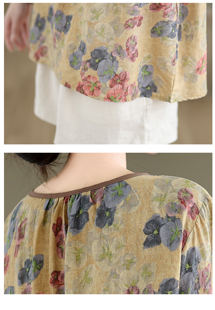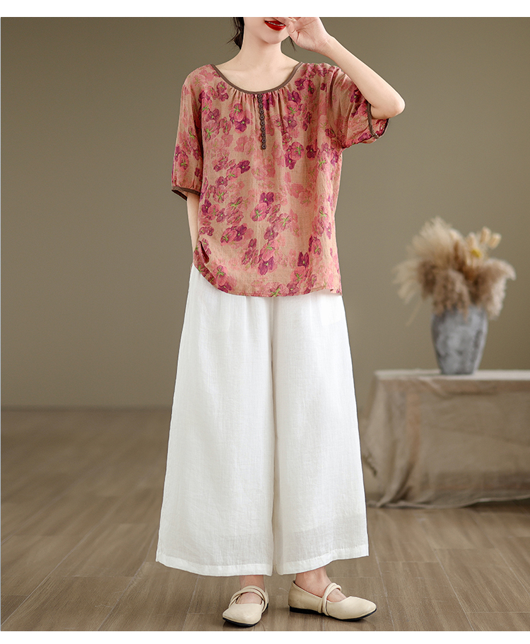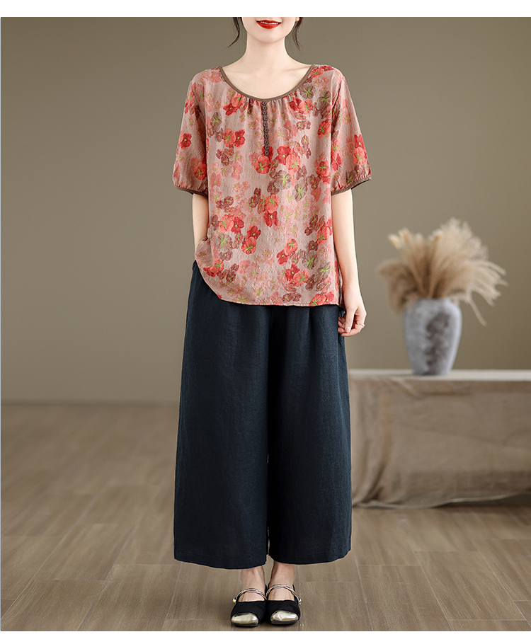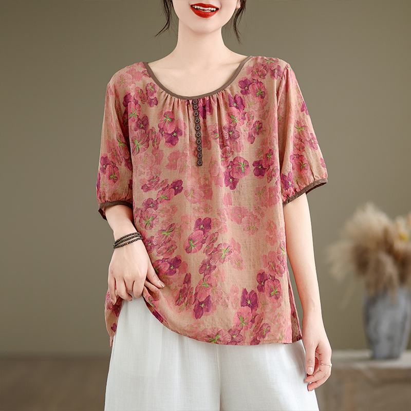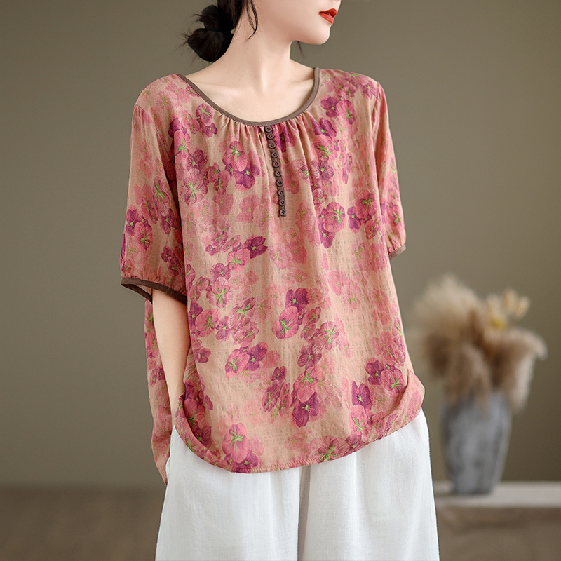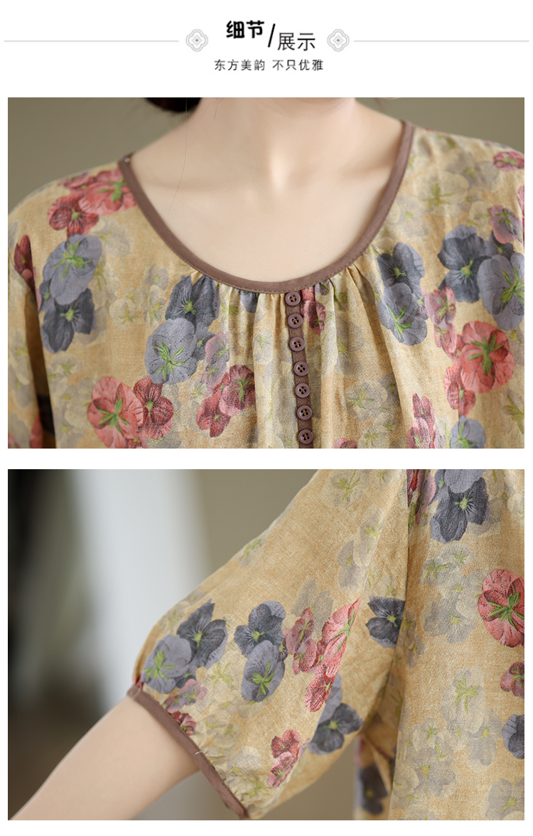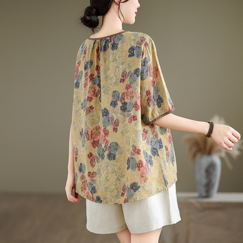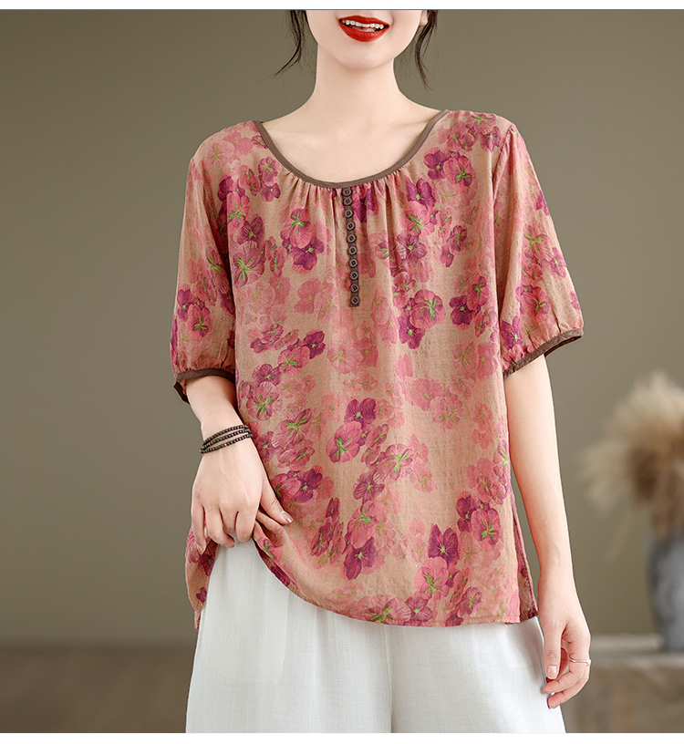 RY2587# 实拍夏季新款文艺休闲短袖小衫圆领套头印花宽松上衣女
