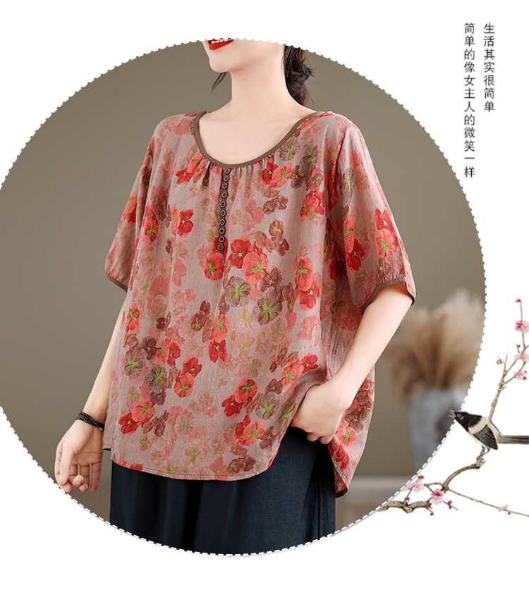 RY2585# 实拍2026夏季新品麻棉民族风蝙蝠袖宽松大码圆领T恤女
