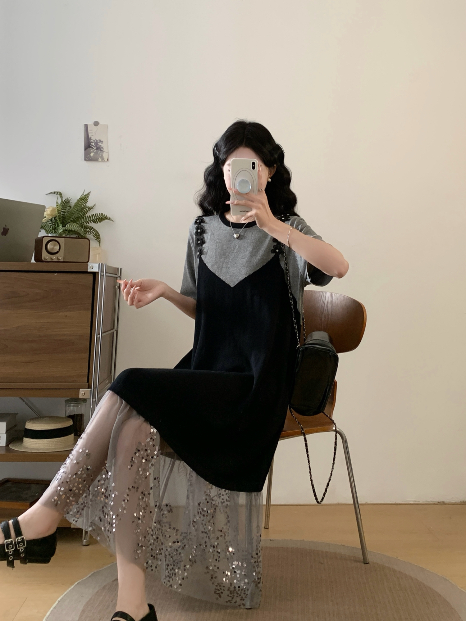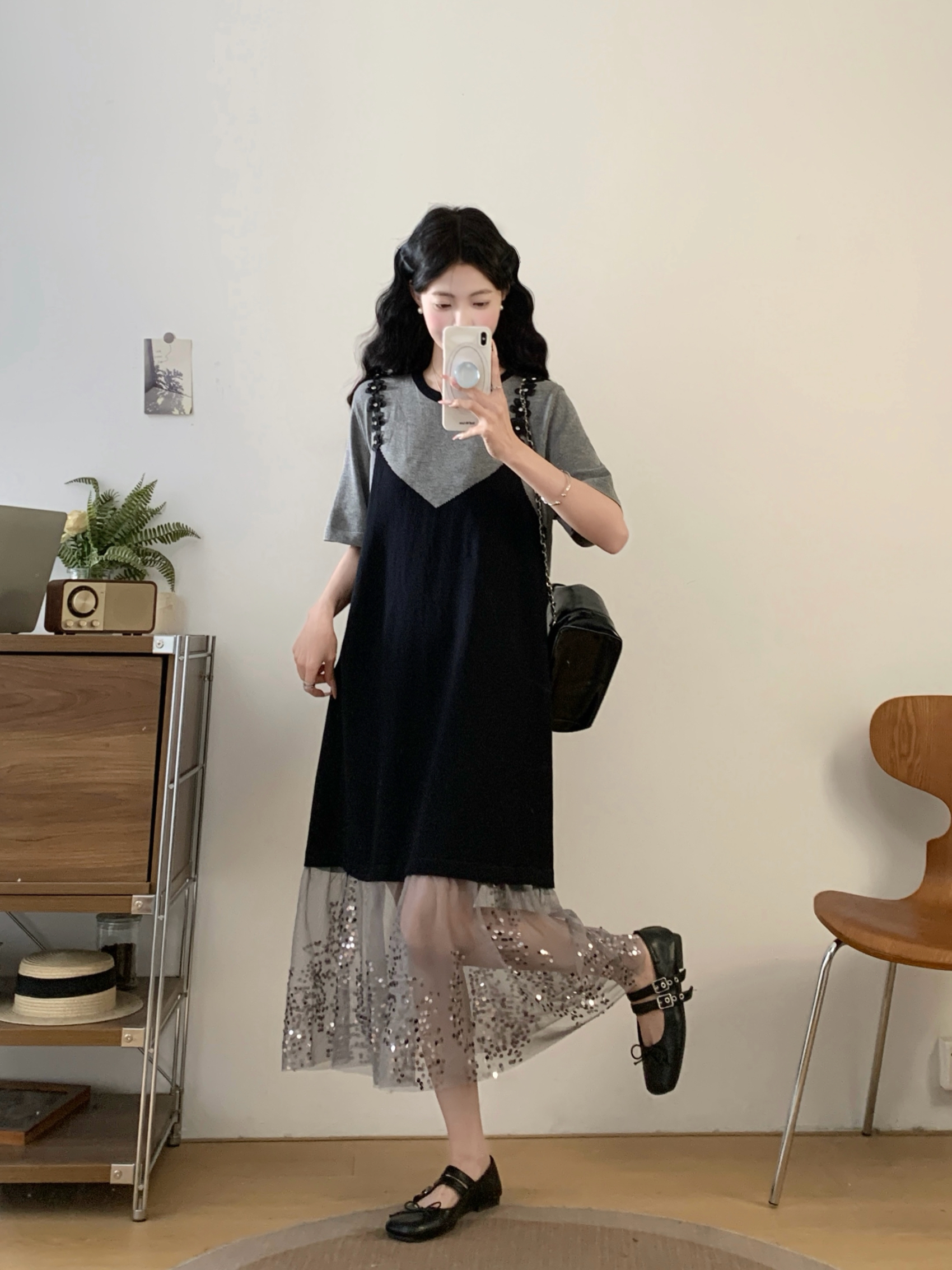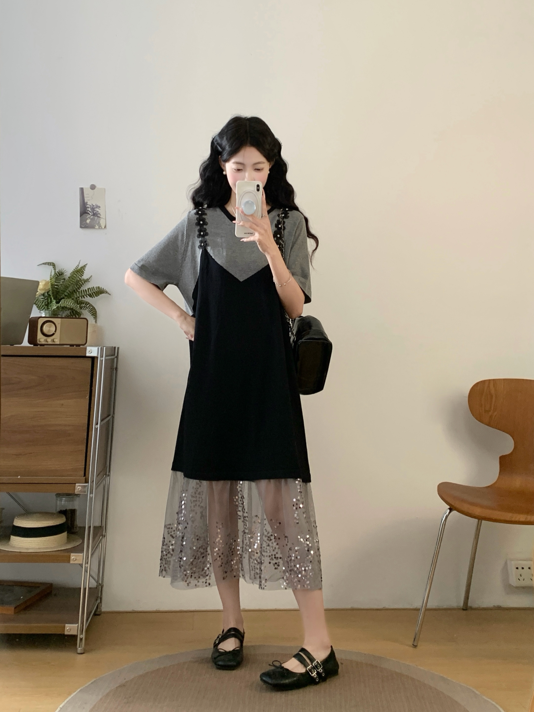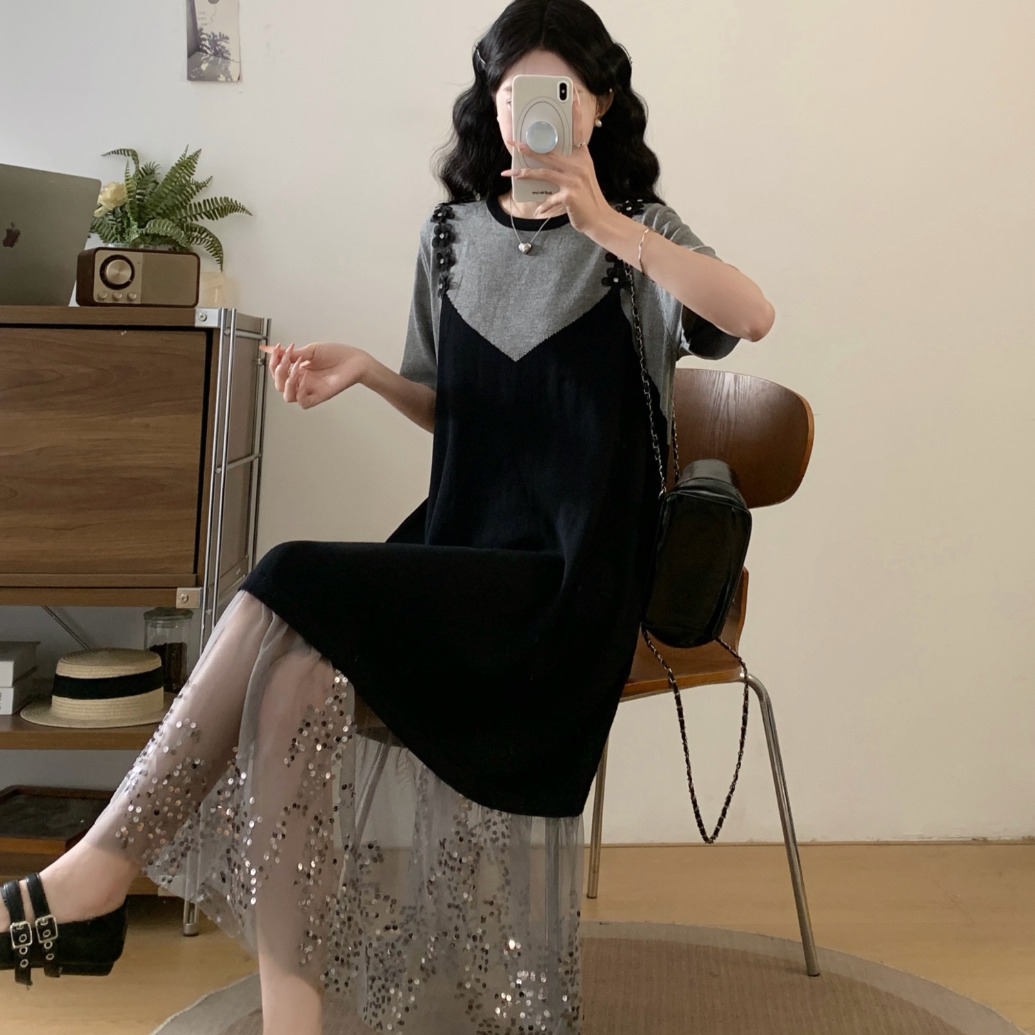 RY2593# 实拍大码女装假两件吊带针织拼接亮闪闪珠片网纱过膝长款连衣裙