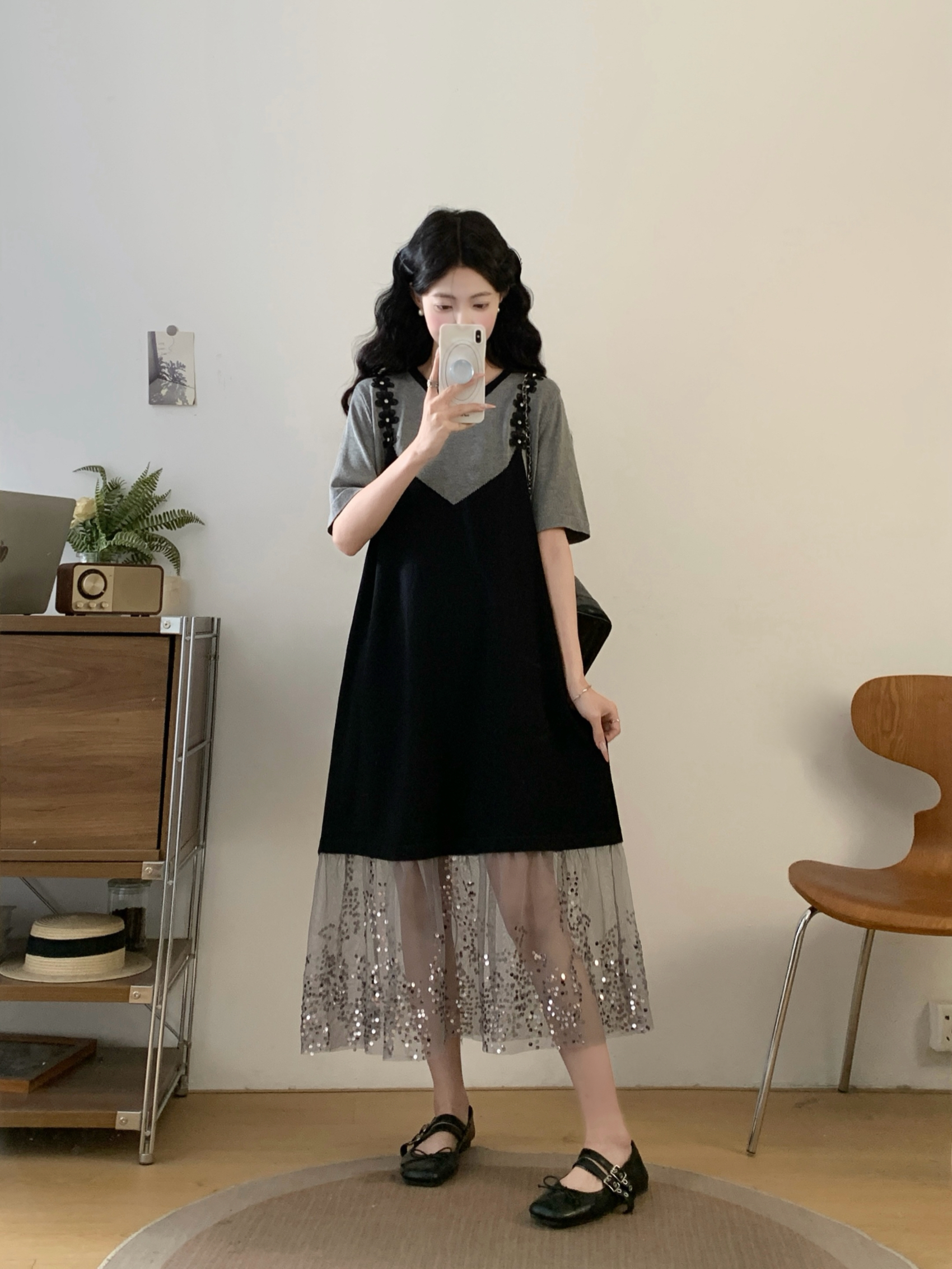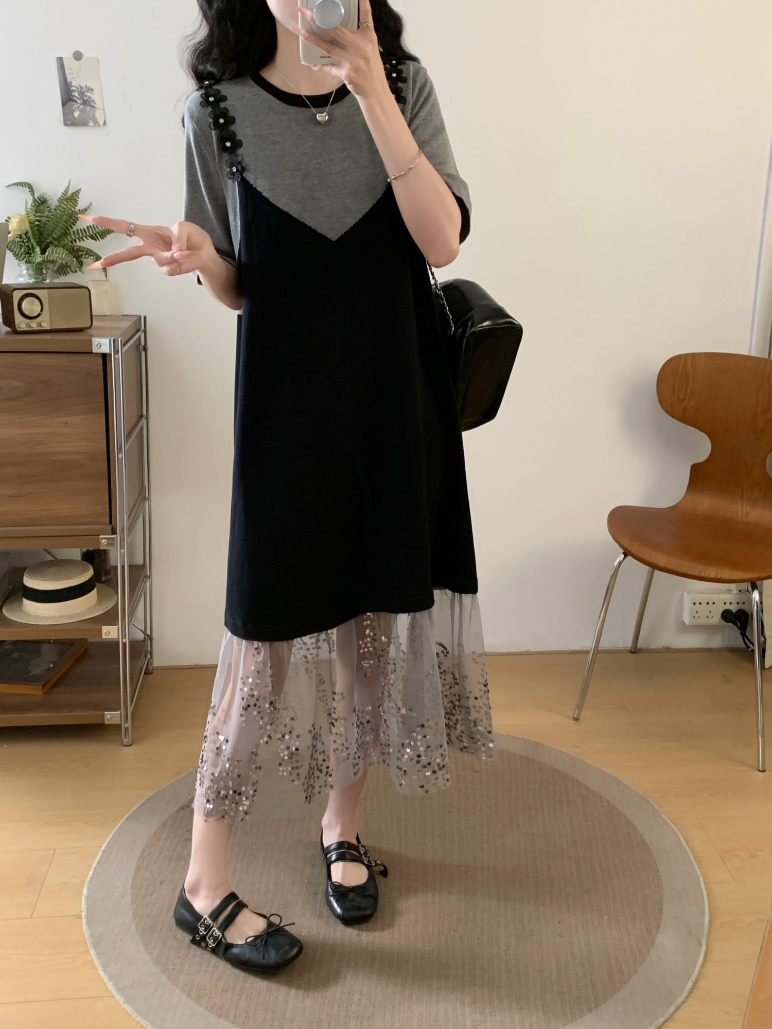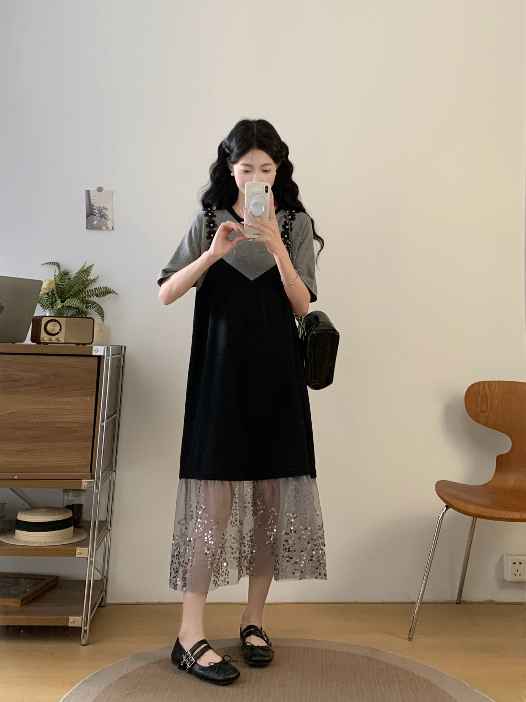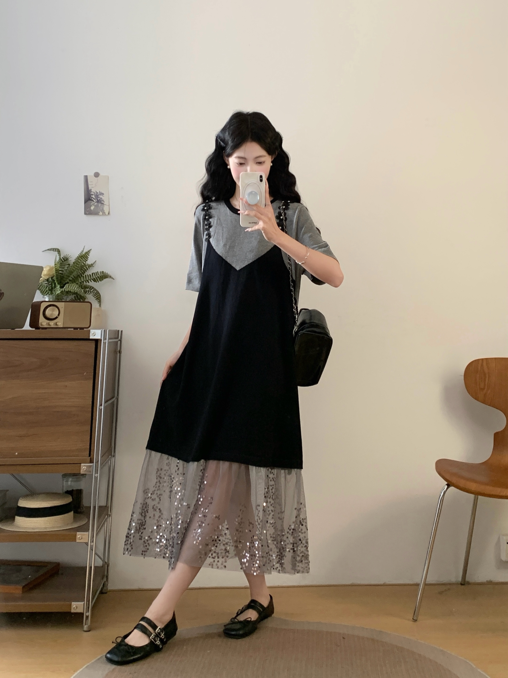 RY2593# 实拍大码女装假两件吊带针织拼接亮闪闪珠片网纱过膝长款连衣裙