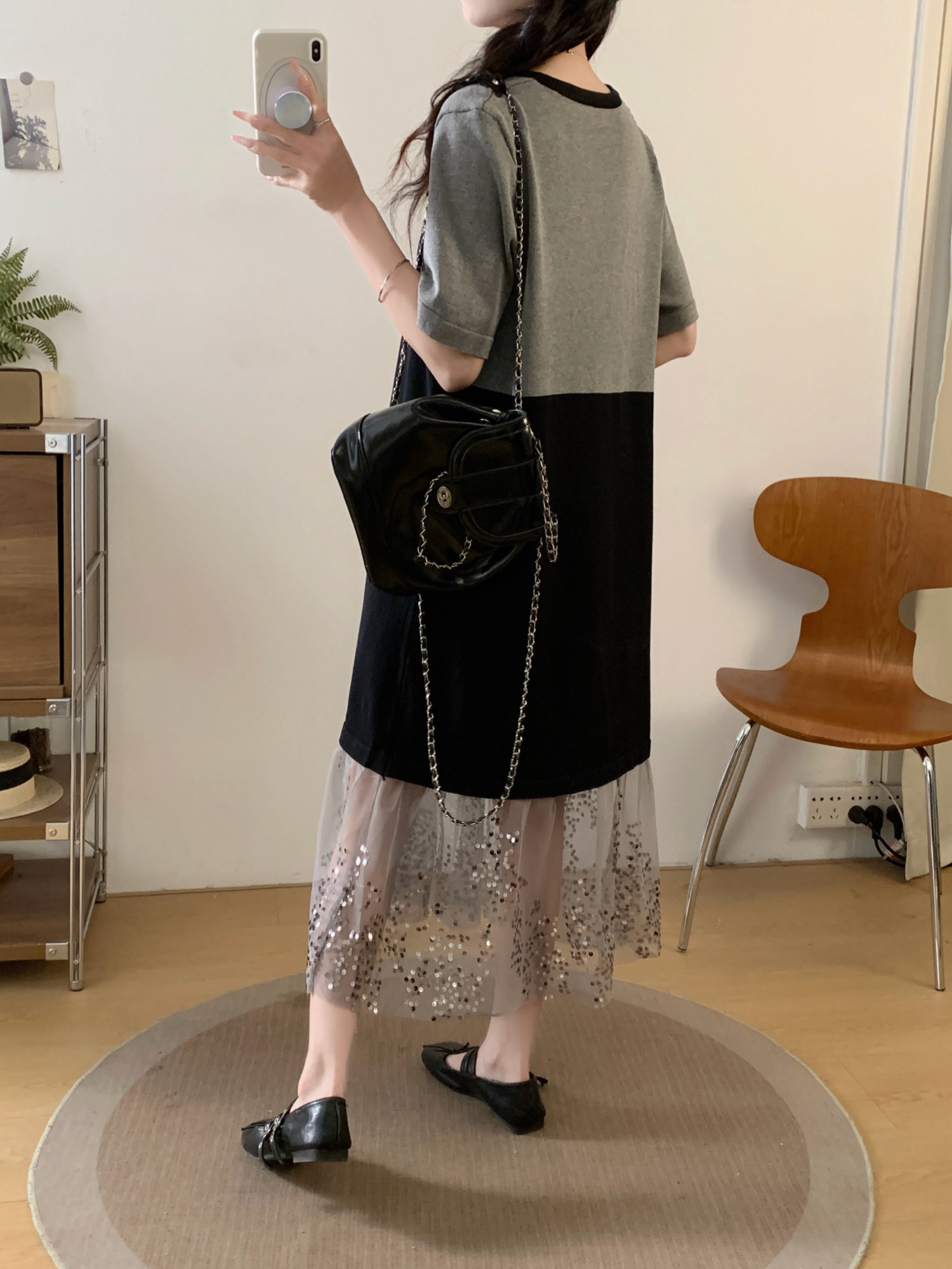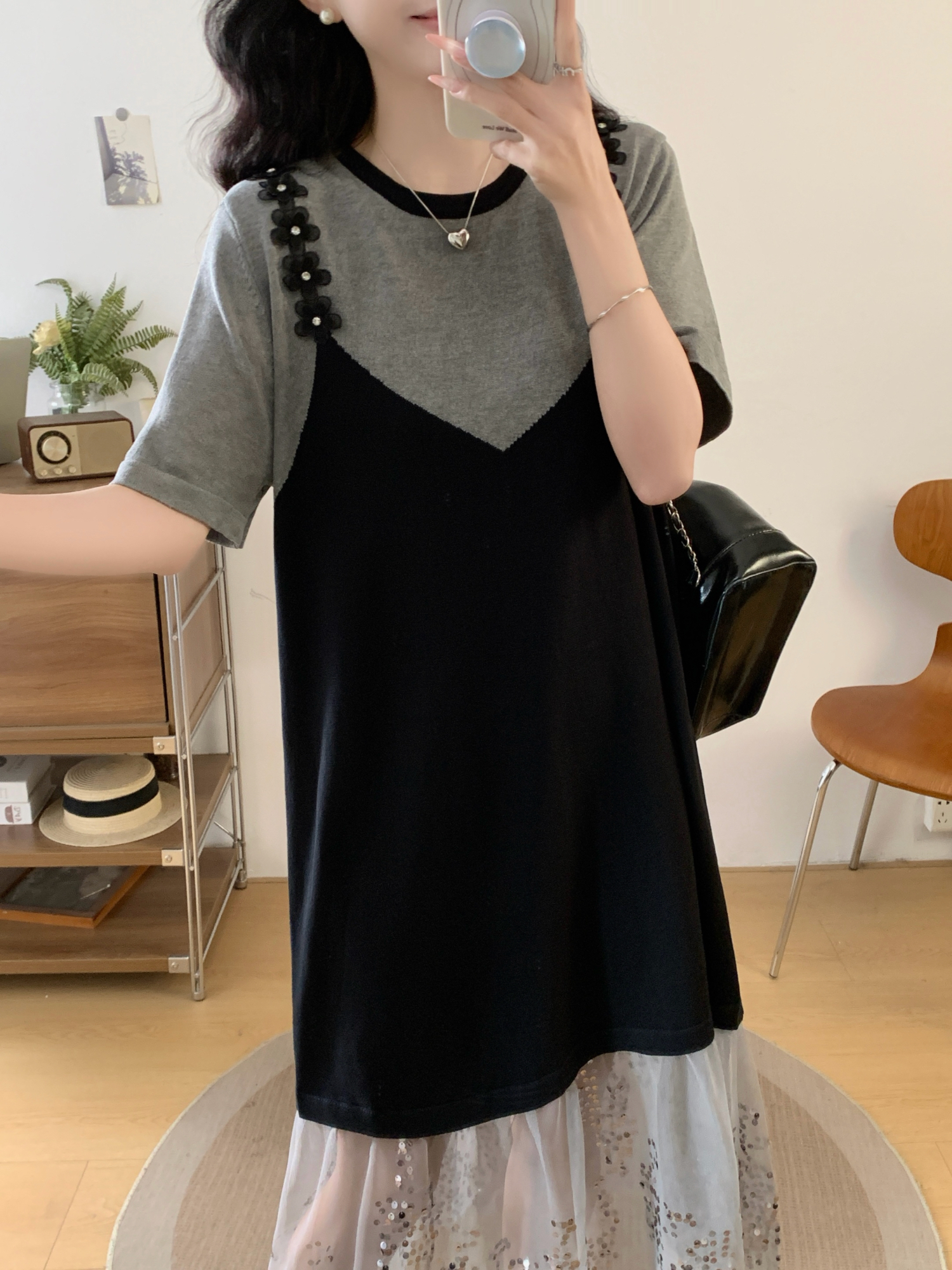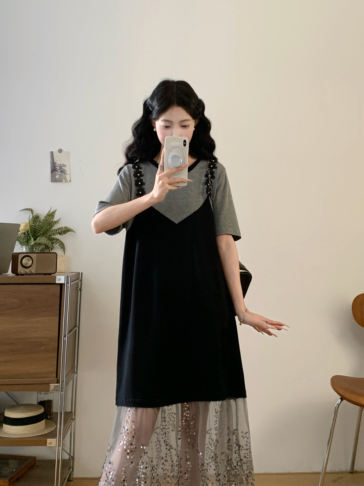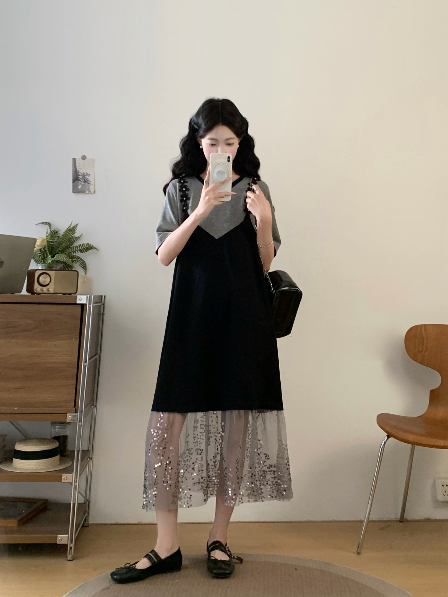 RY2593# 实拍大码女装假两件吊带针织拼接亮闪闪珠片网纱过膝长款连衣裙