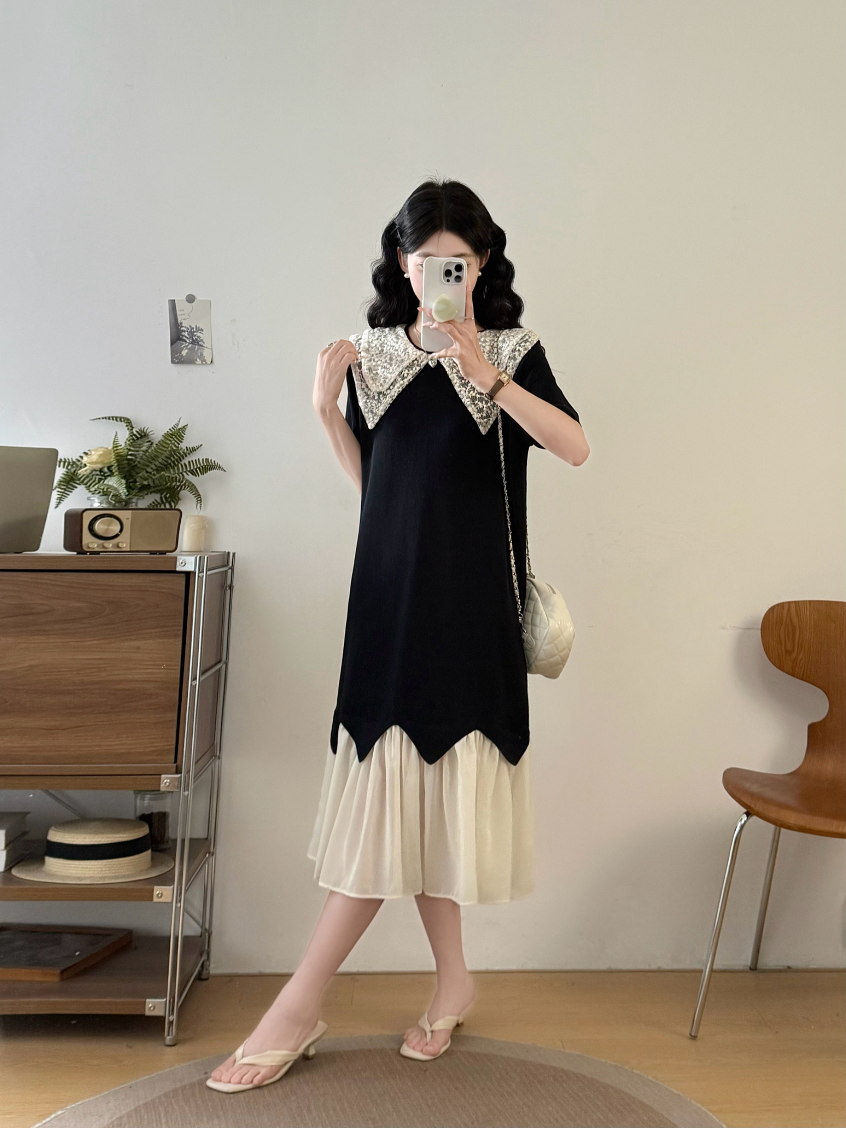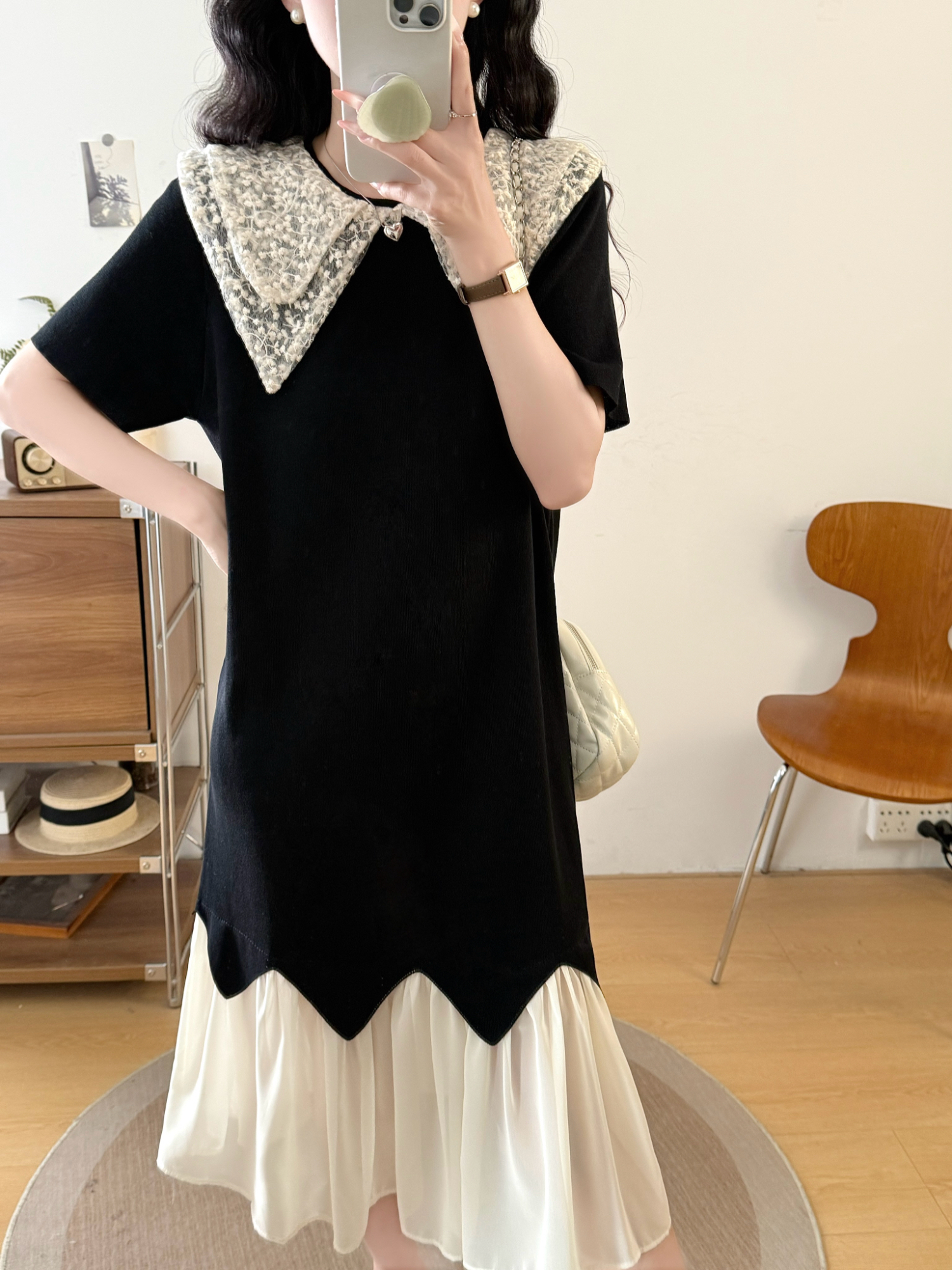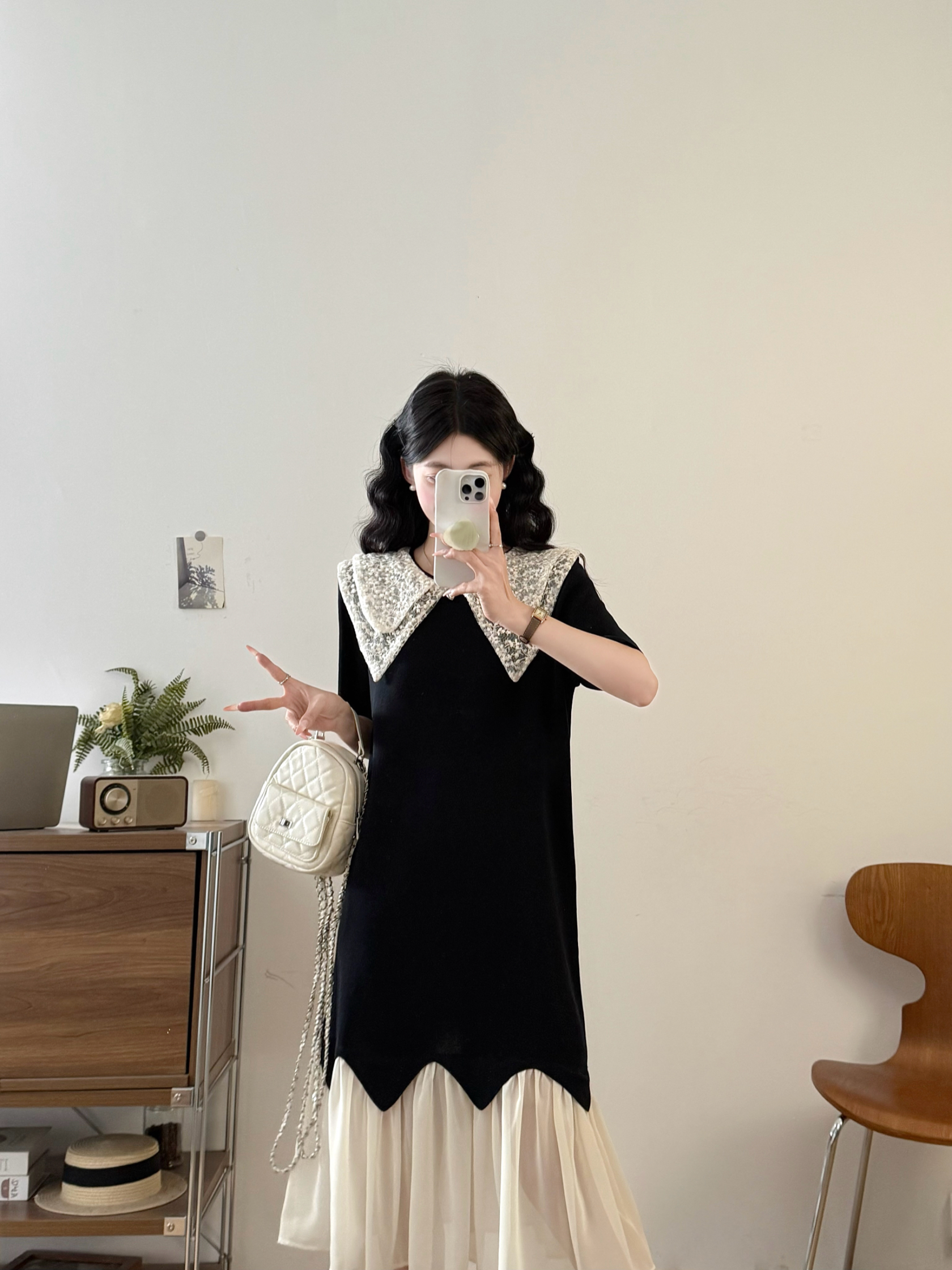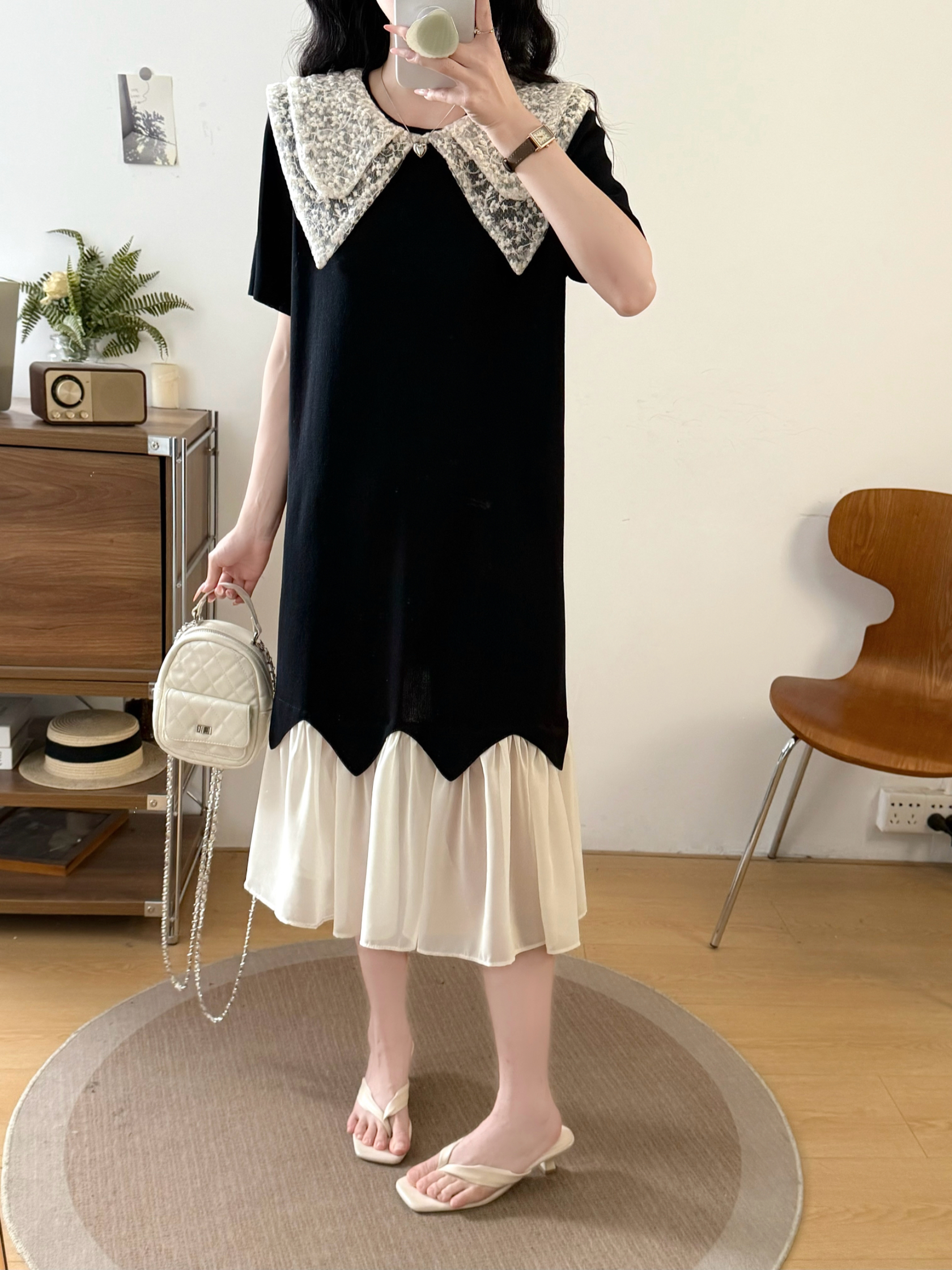 RY2596# 实拍大码女装黑白拼接双层娃娃领针织衫长款过膝显瘦减龄连衣裙