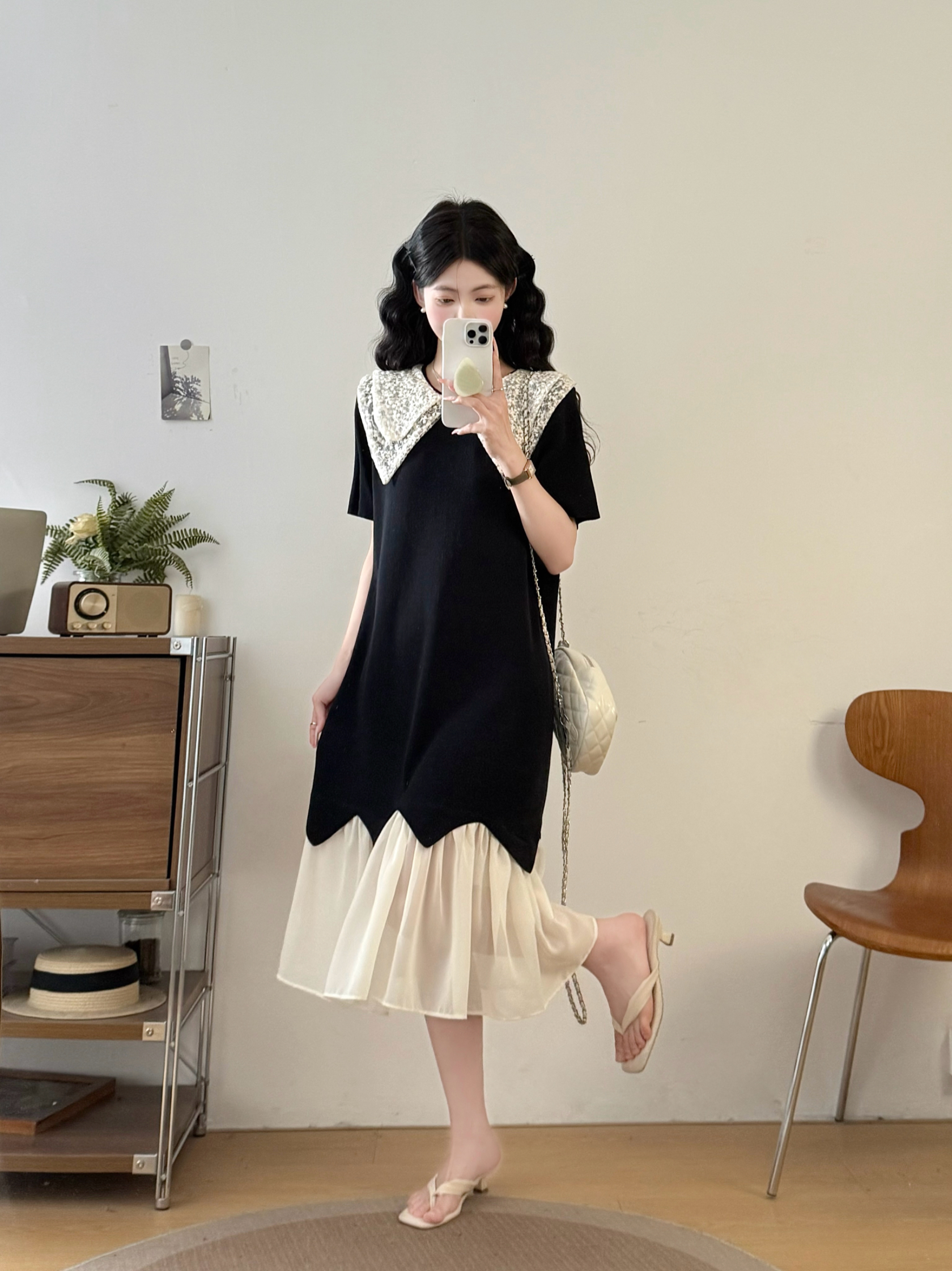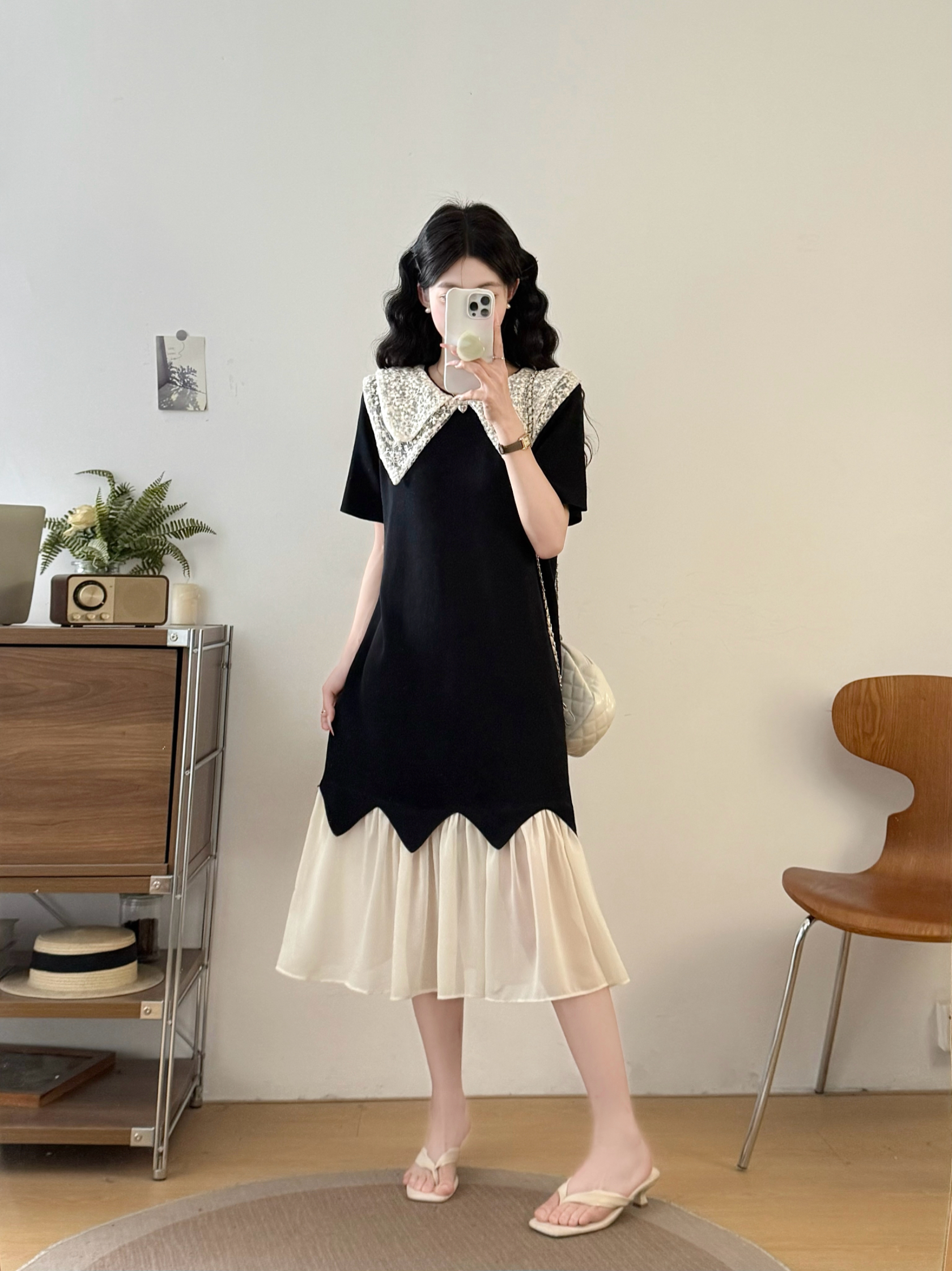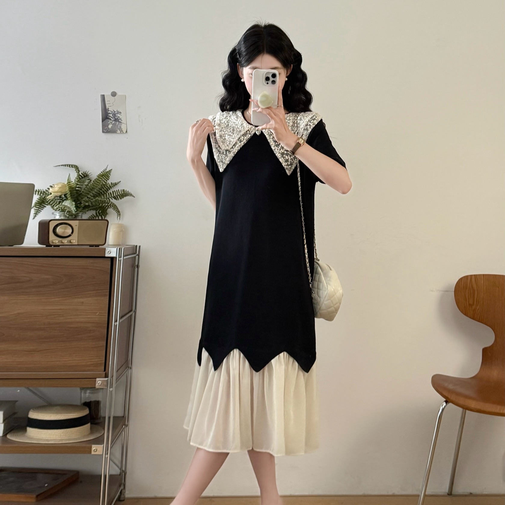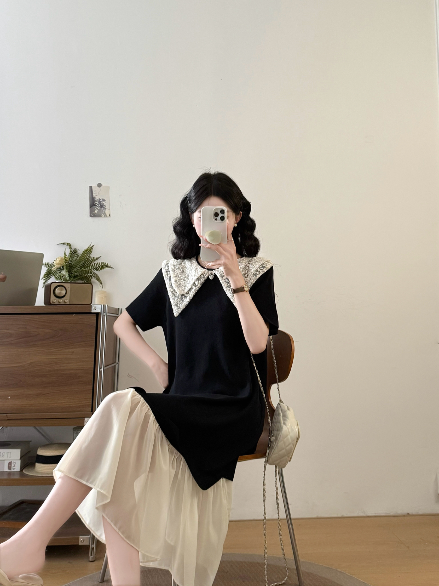 RY2596# 实拍大码女装黑白拼接双层娃娃领针织衫长款过膝显瘦减龄连衣裙