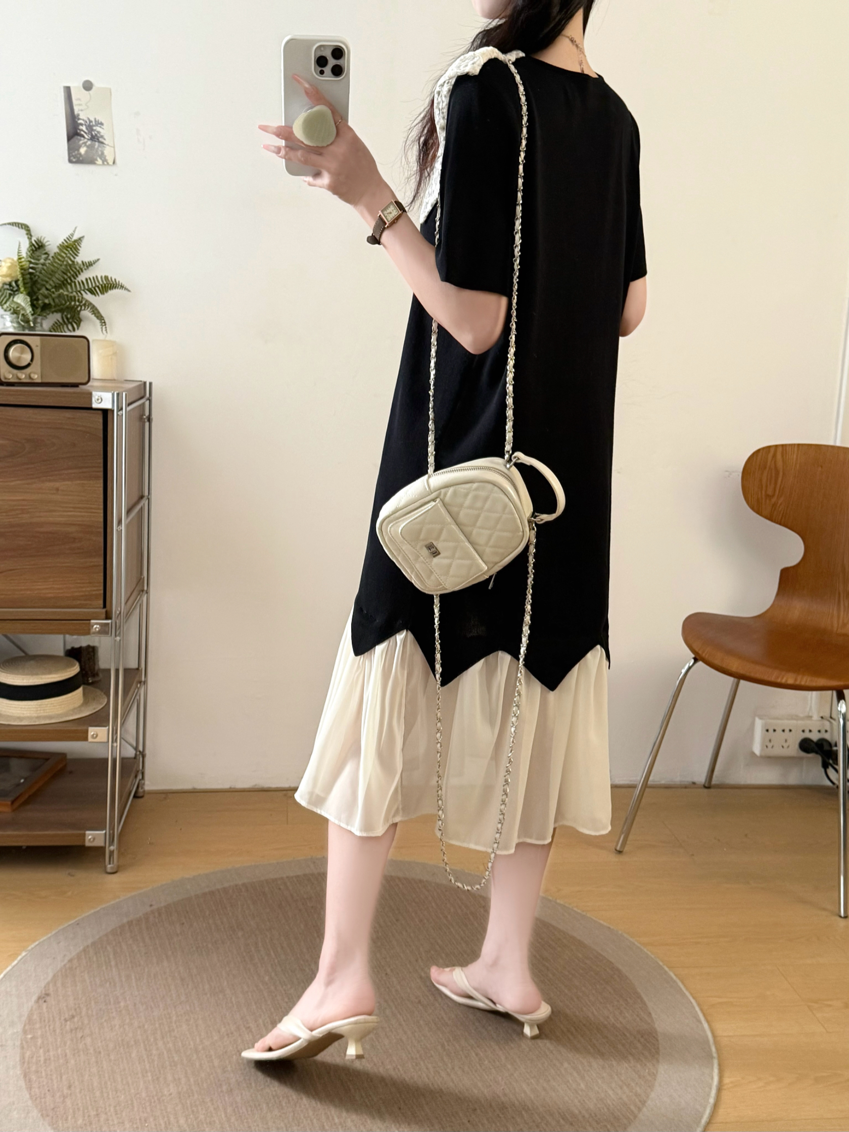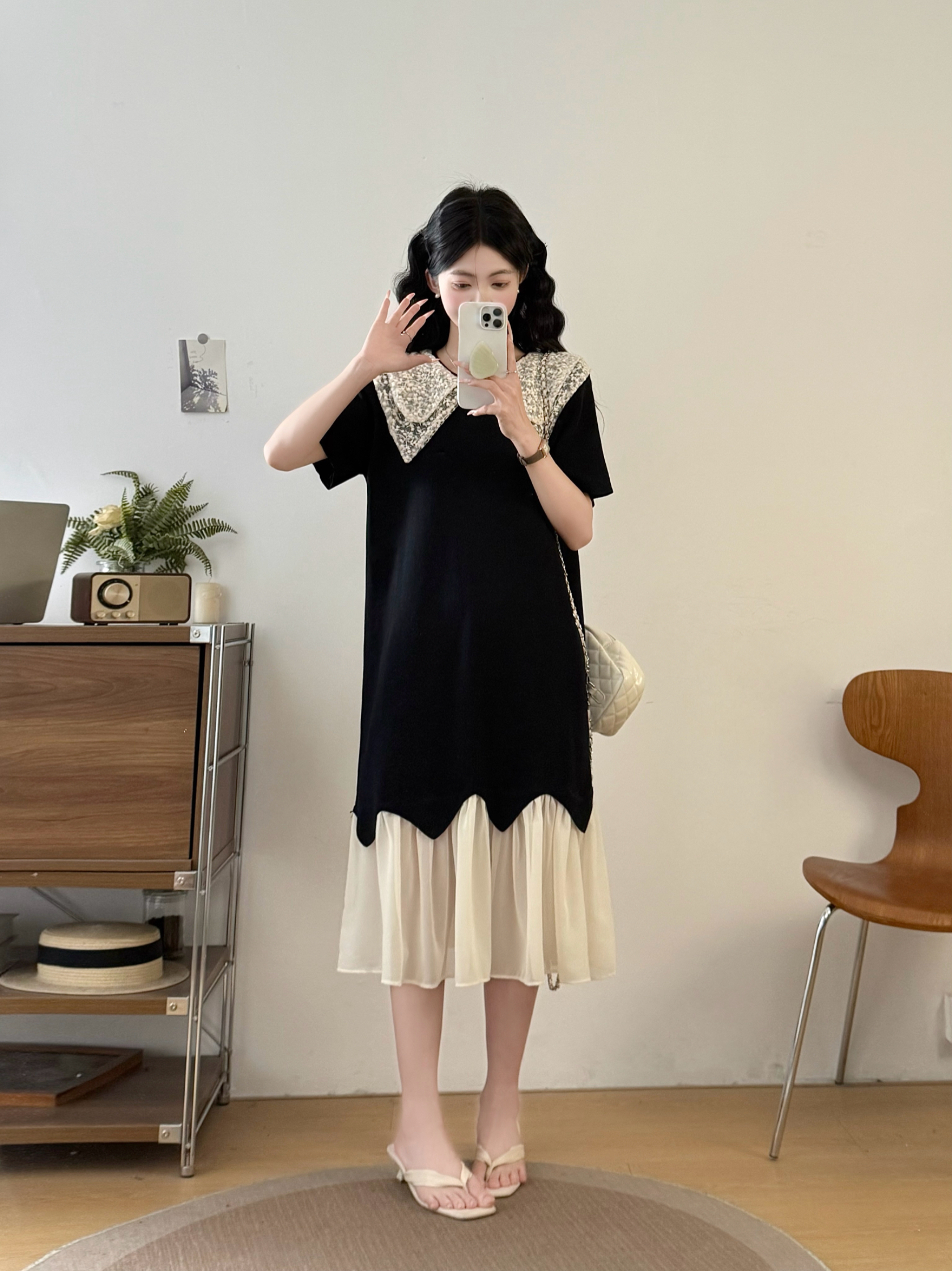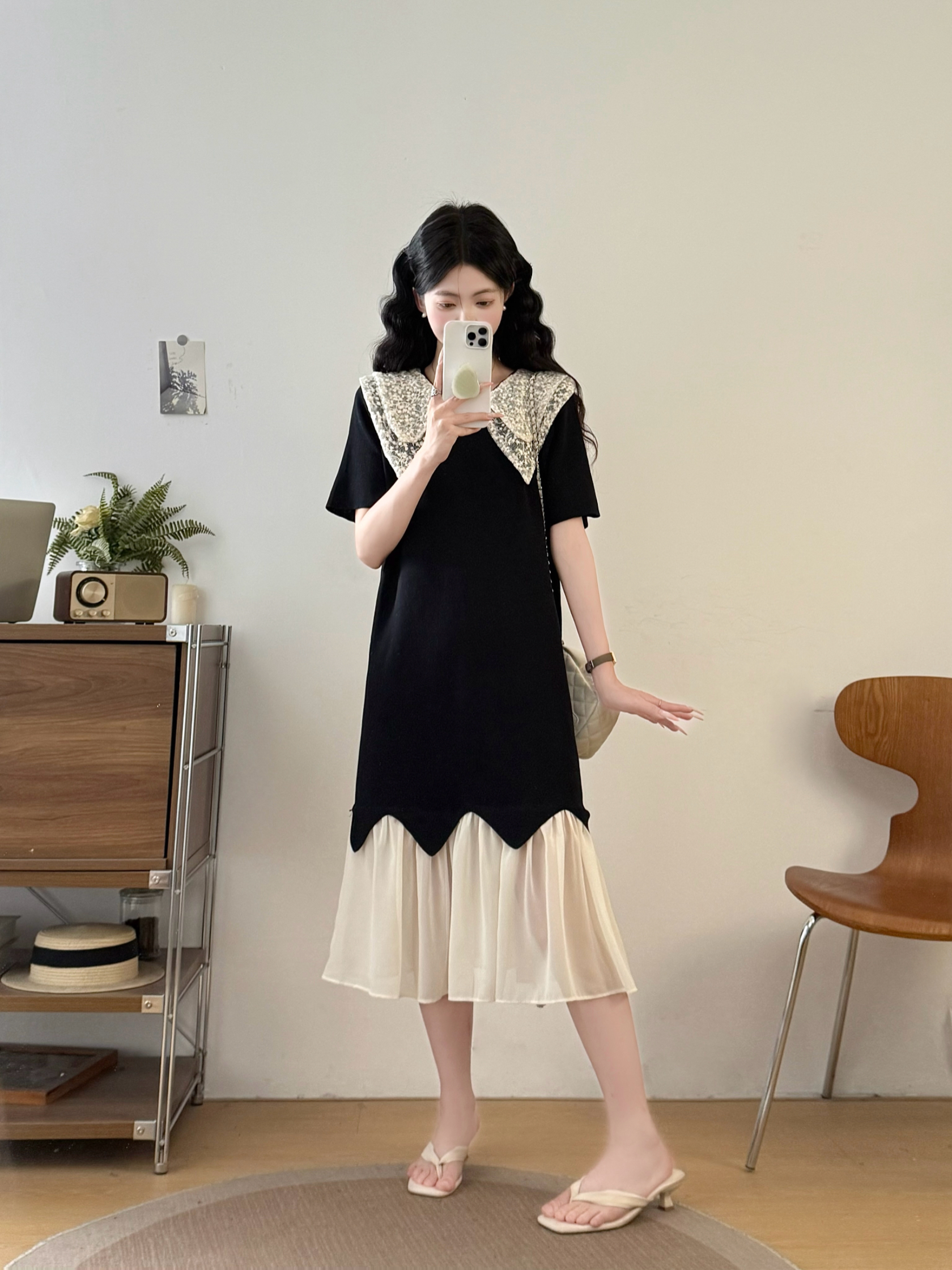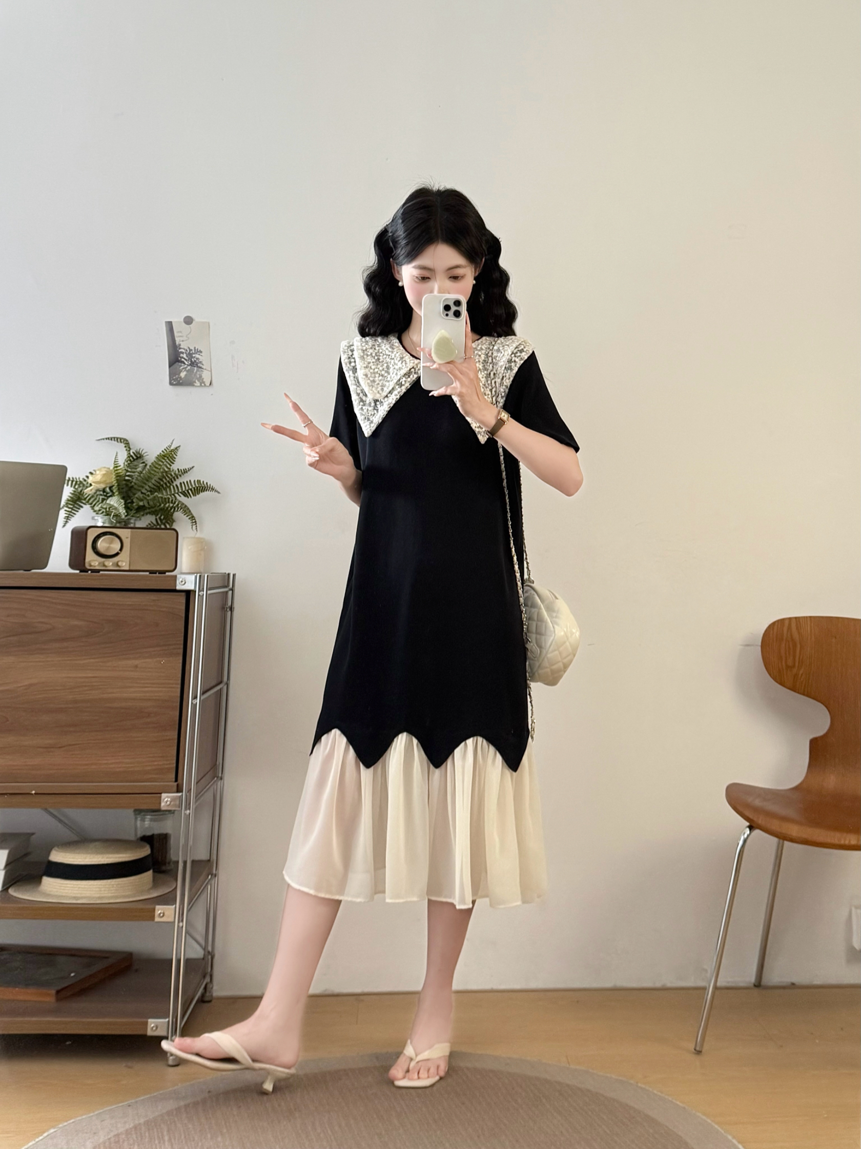 RY2596# 实拍大码女装黑白拼接双层娃娃领针织衫长款过膝显瘦减龄连衣裙