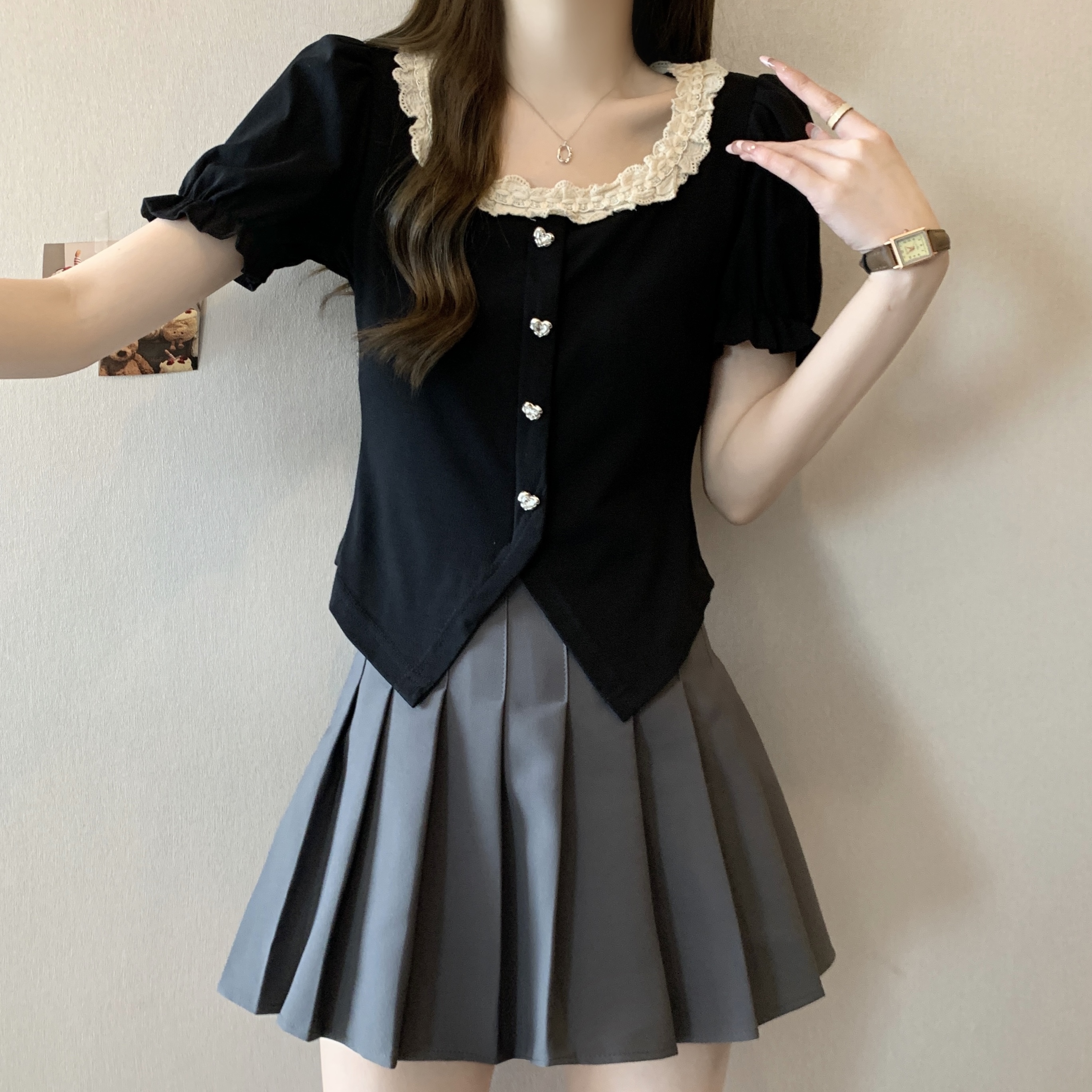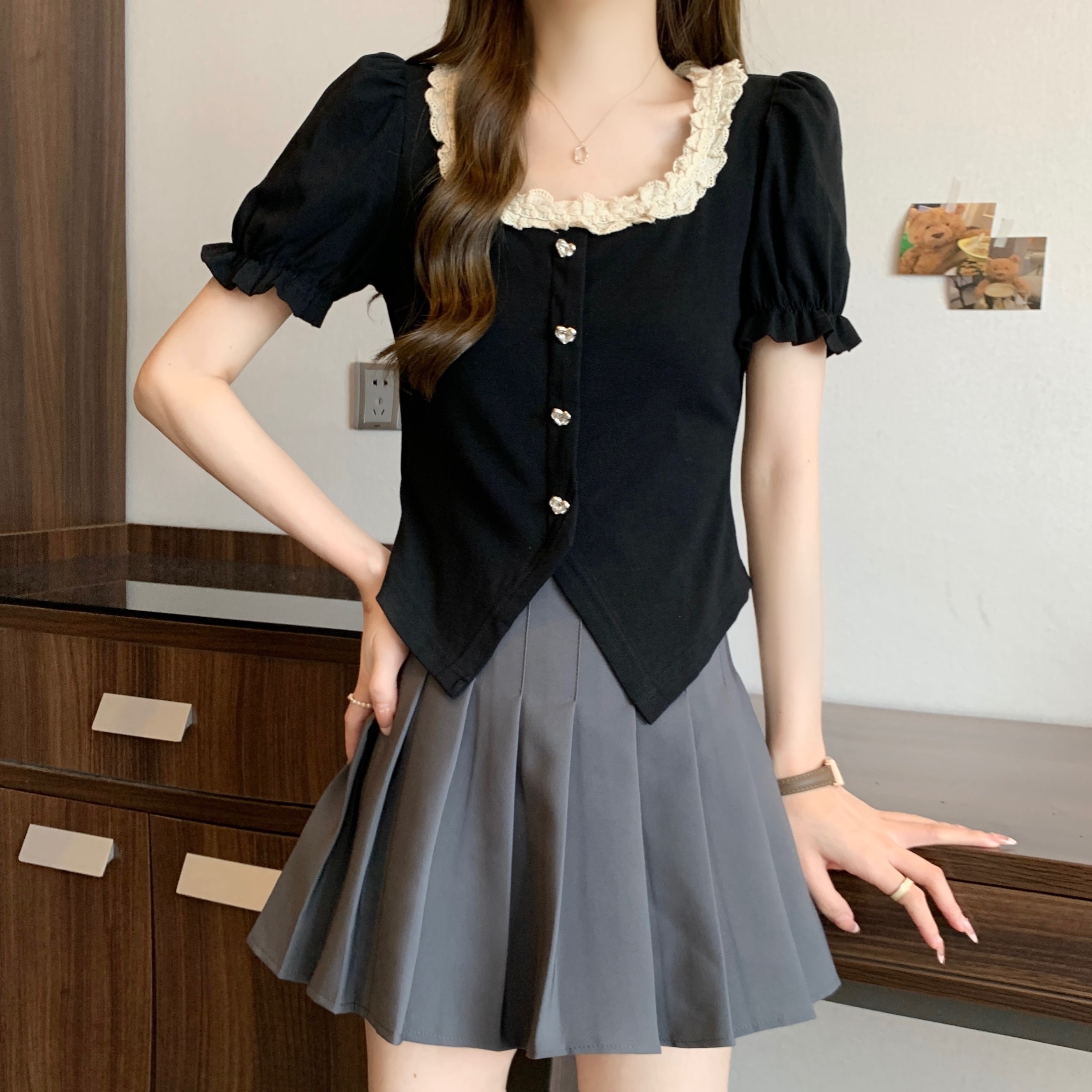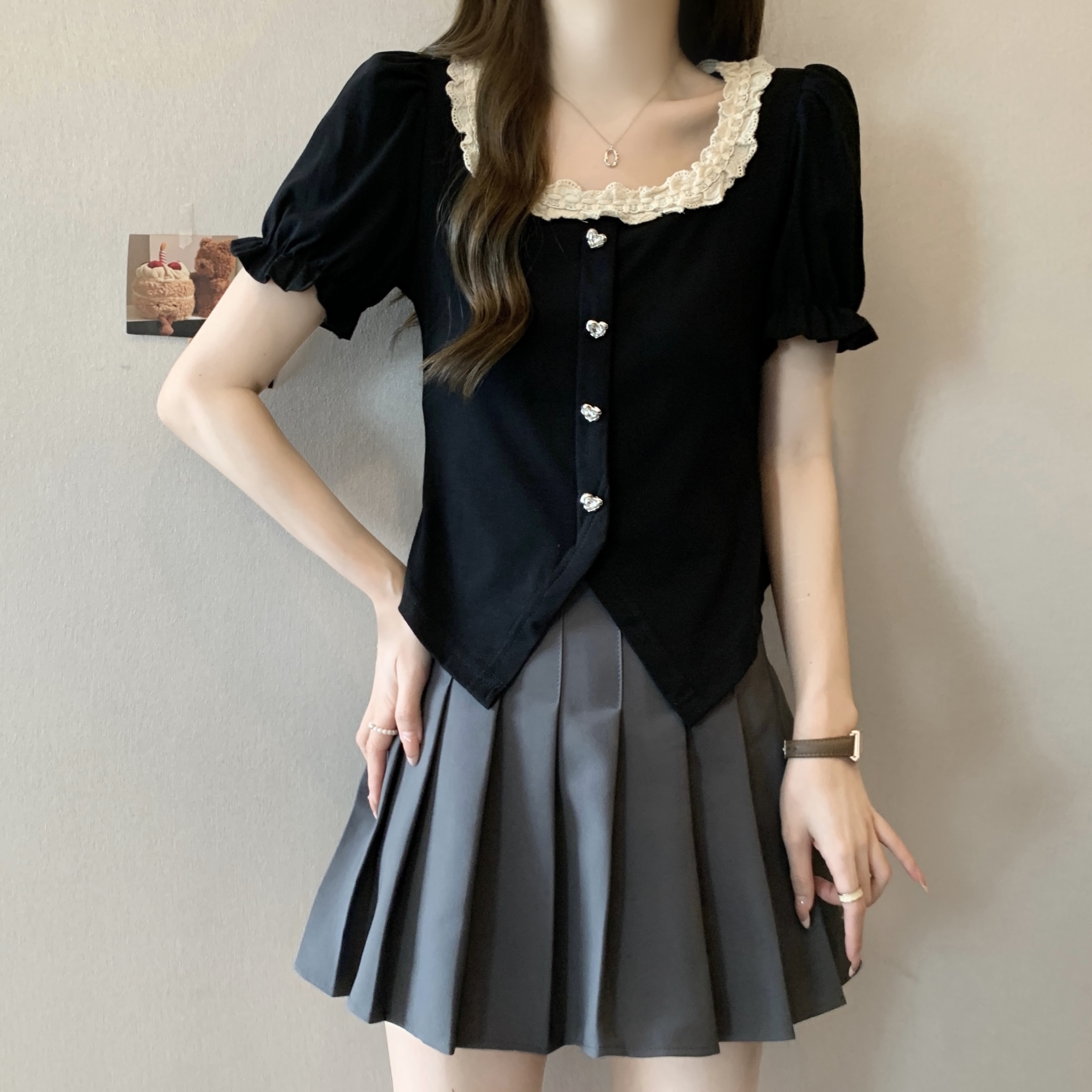 RY2603# 黑色法式方领短袖t恤女夏2026新款设计感蕾丝花边拼接泡泡袖上衣
