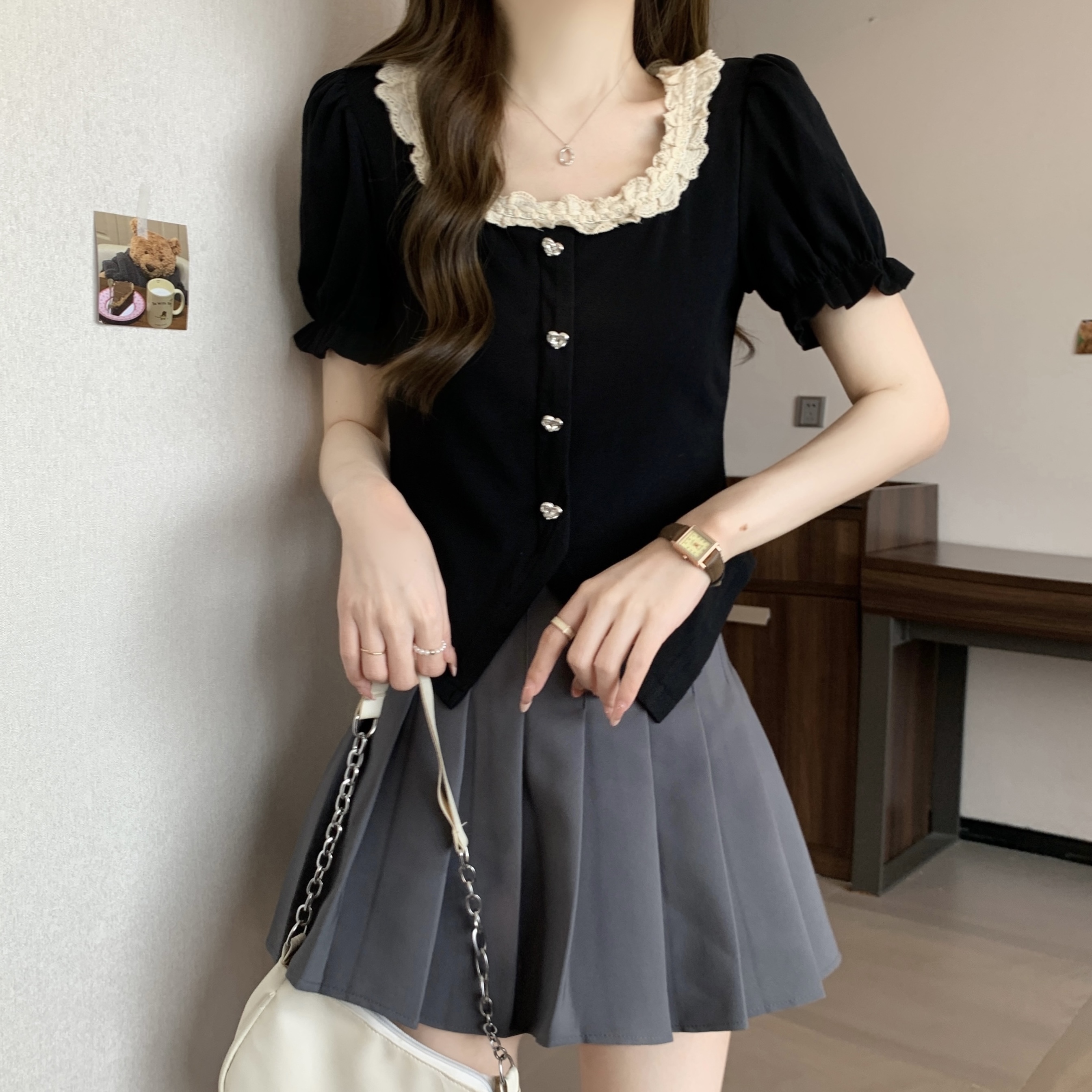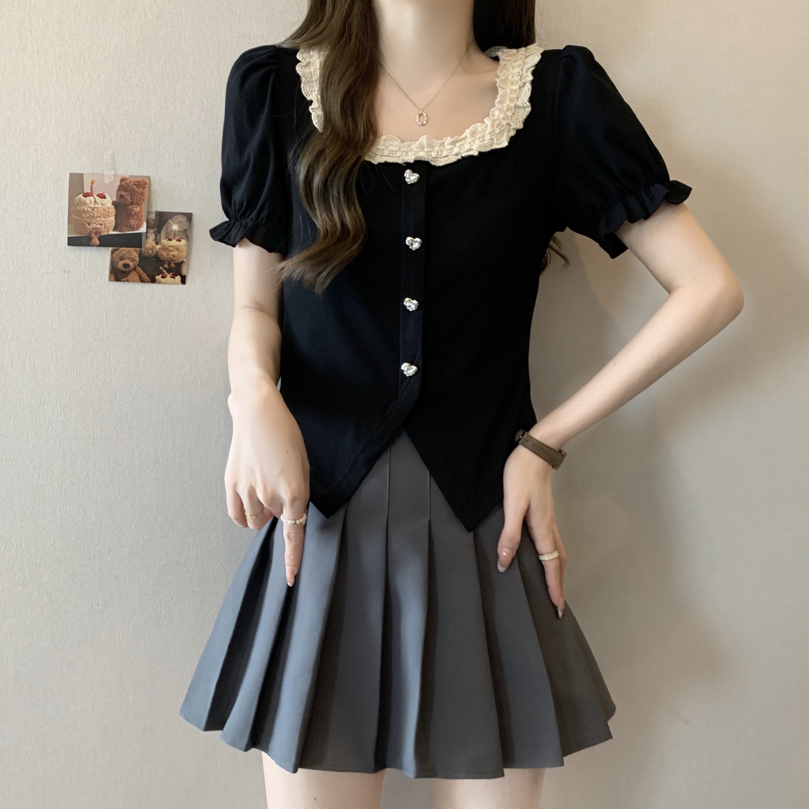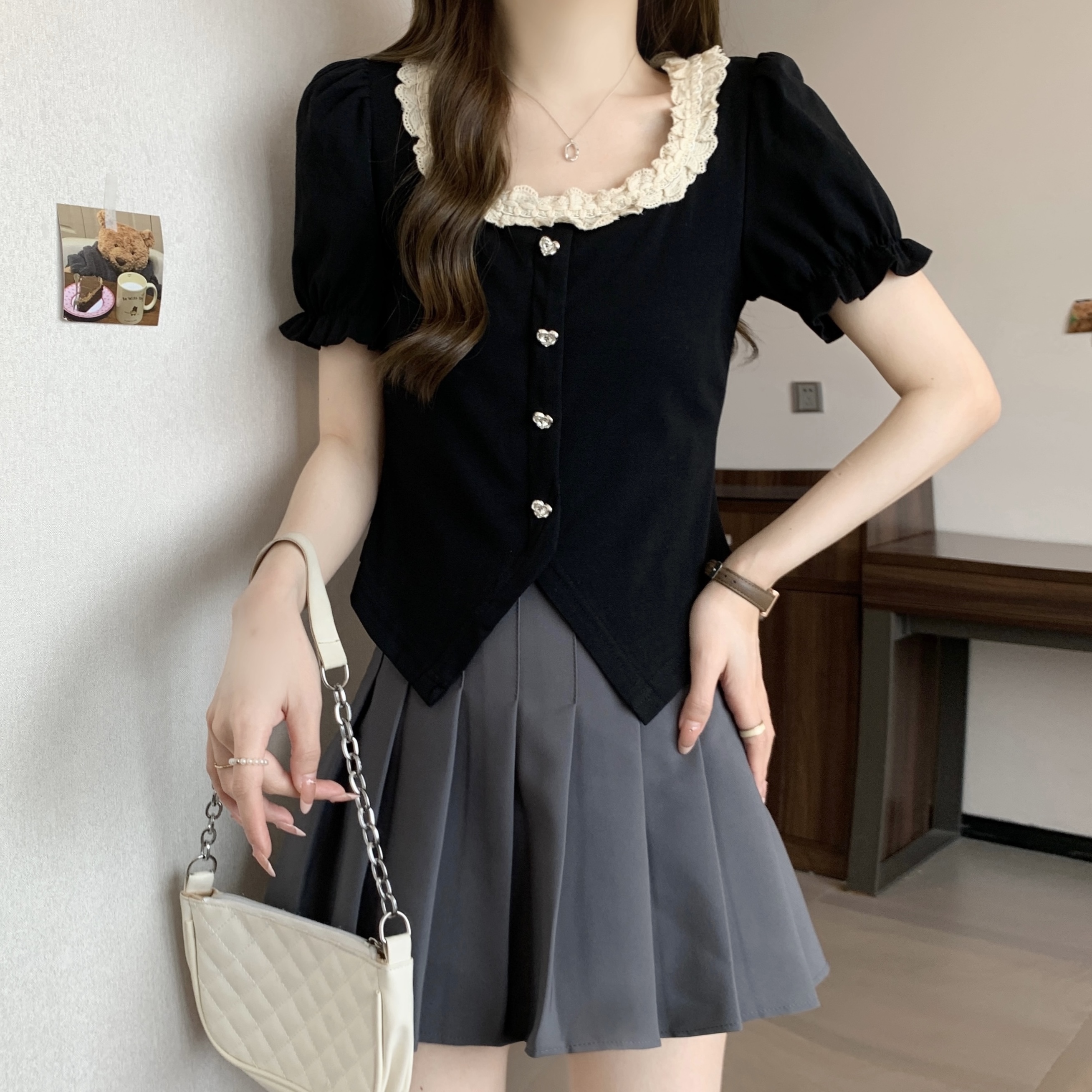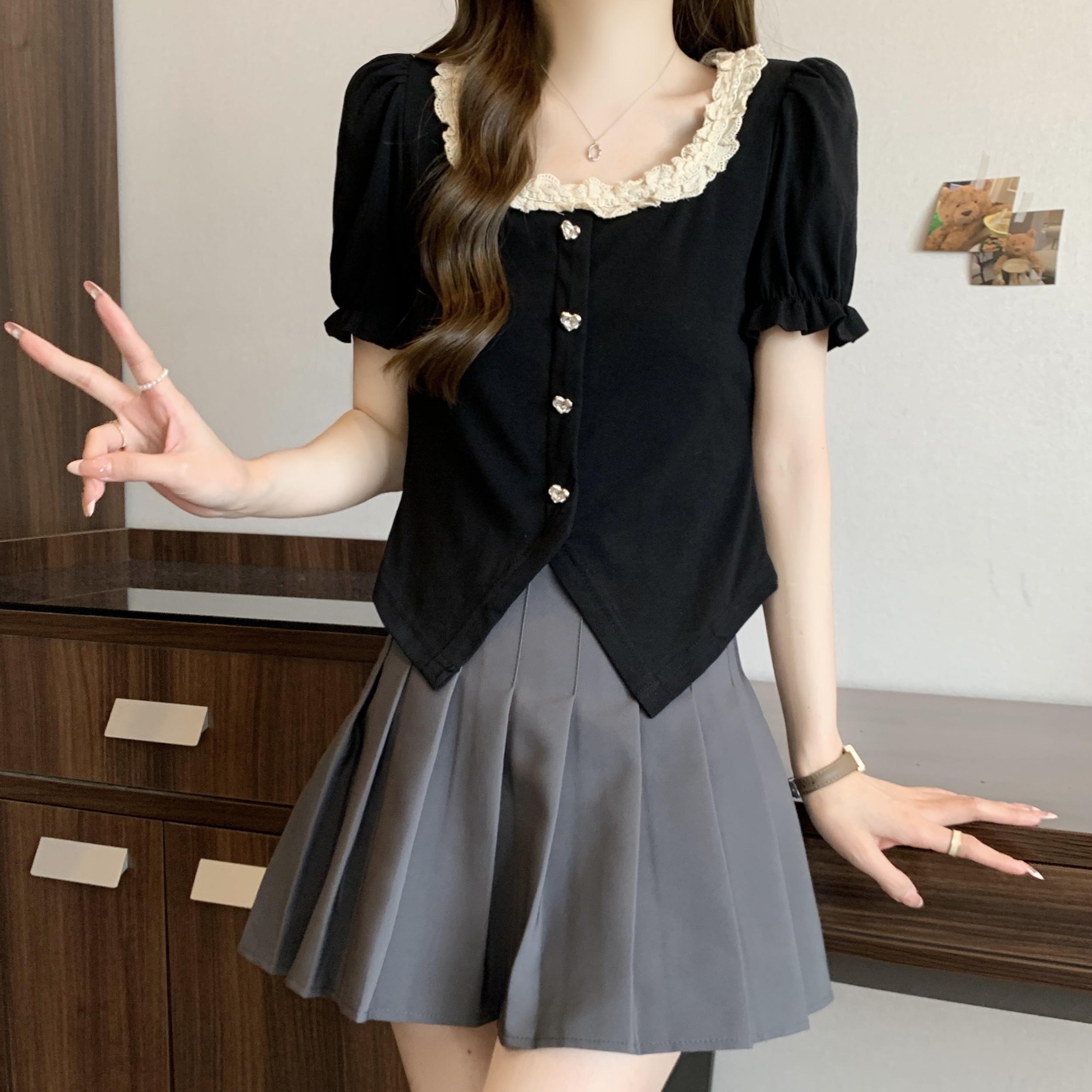 RY2603# 黑色法式方领短袖t恤女夏2026新款设计感蕾丝花边拼接泡泡袖上衣
