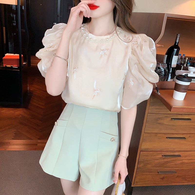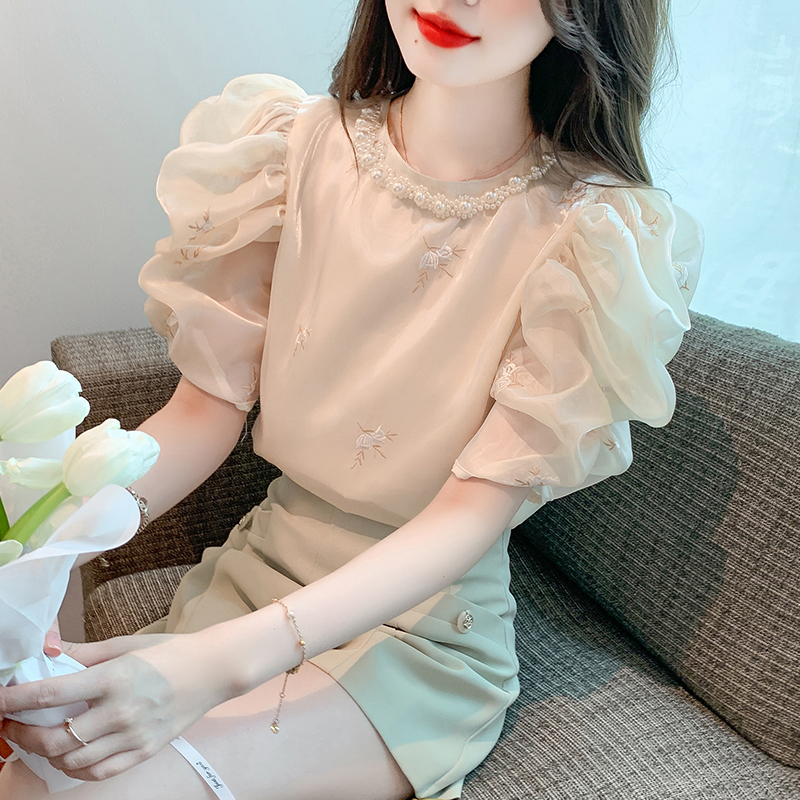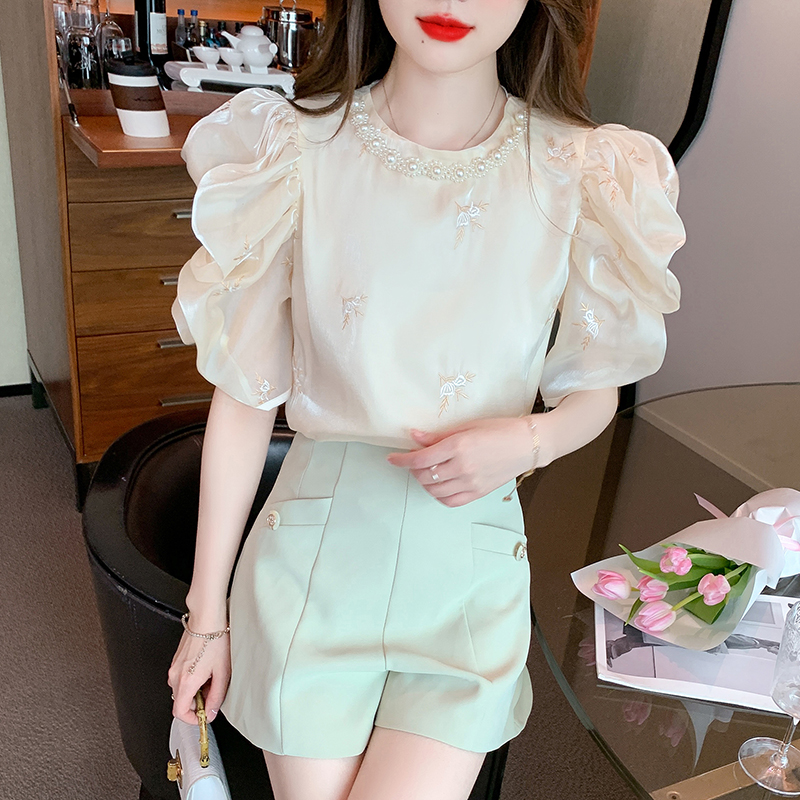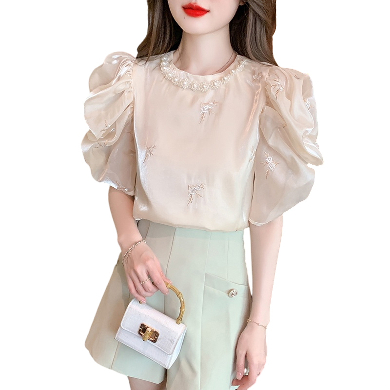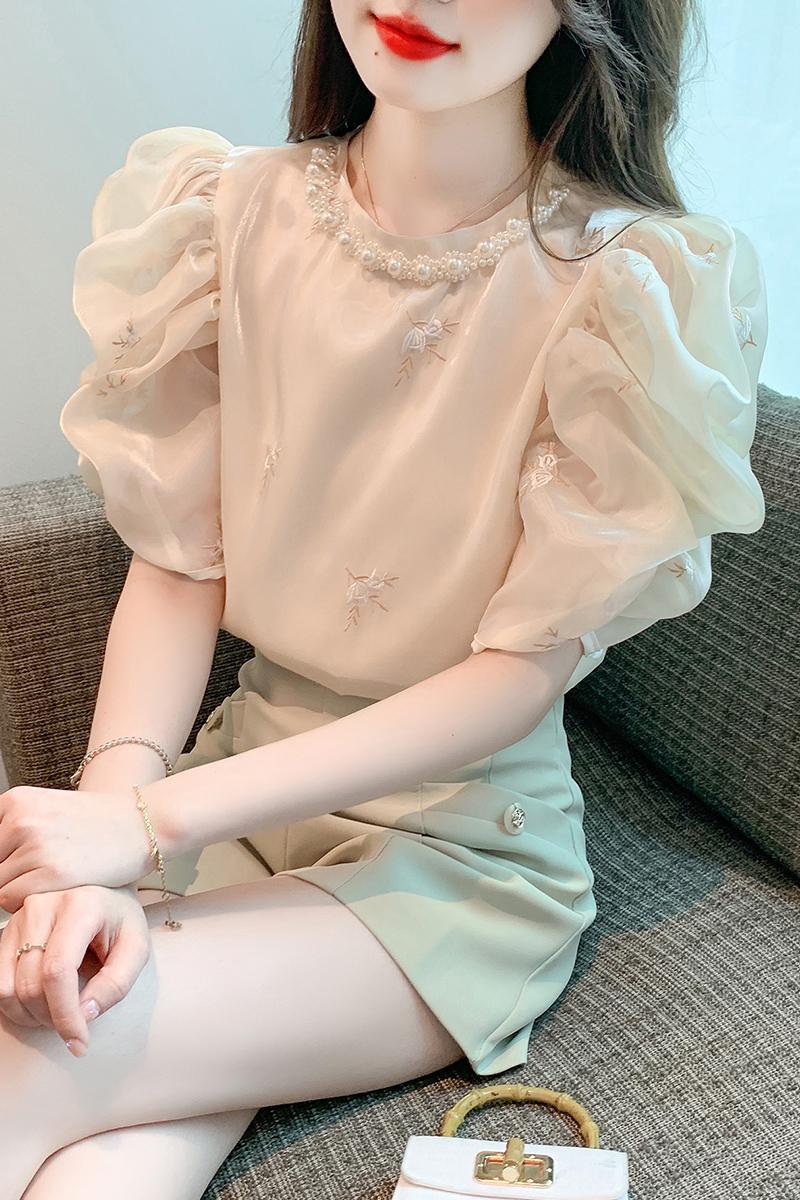 RY2643# 法式高级感小众刺绣花朵衬衫女夏2026夏装新款洋气泡泡袖上衣女