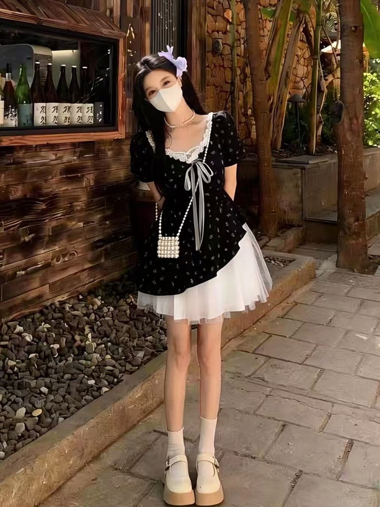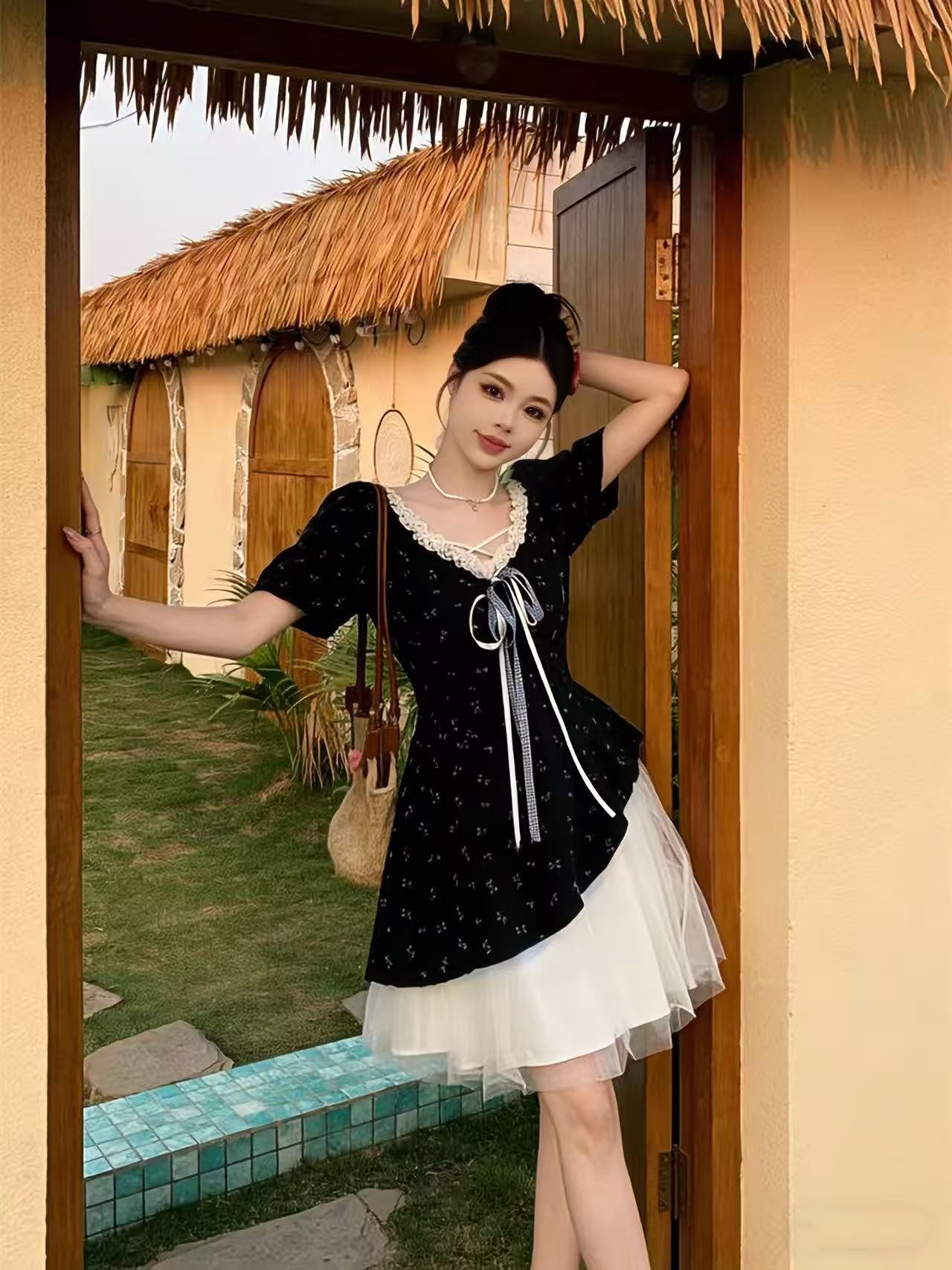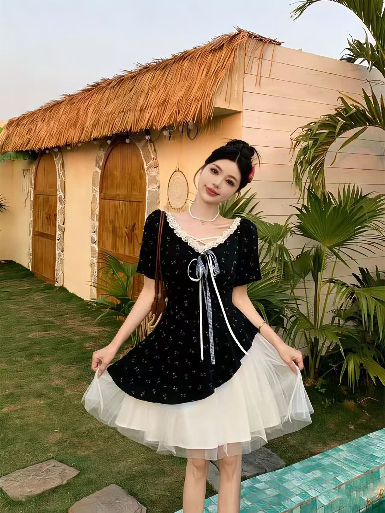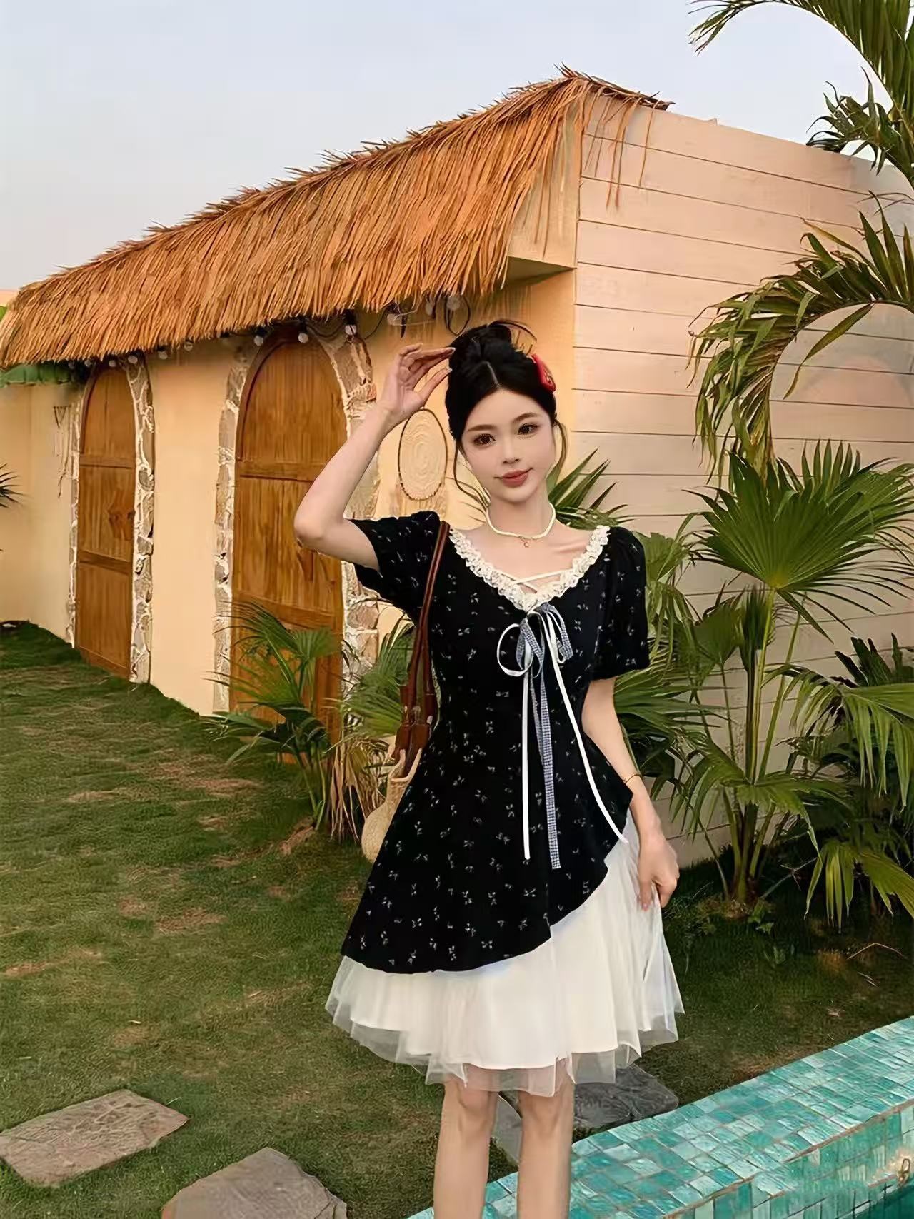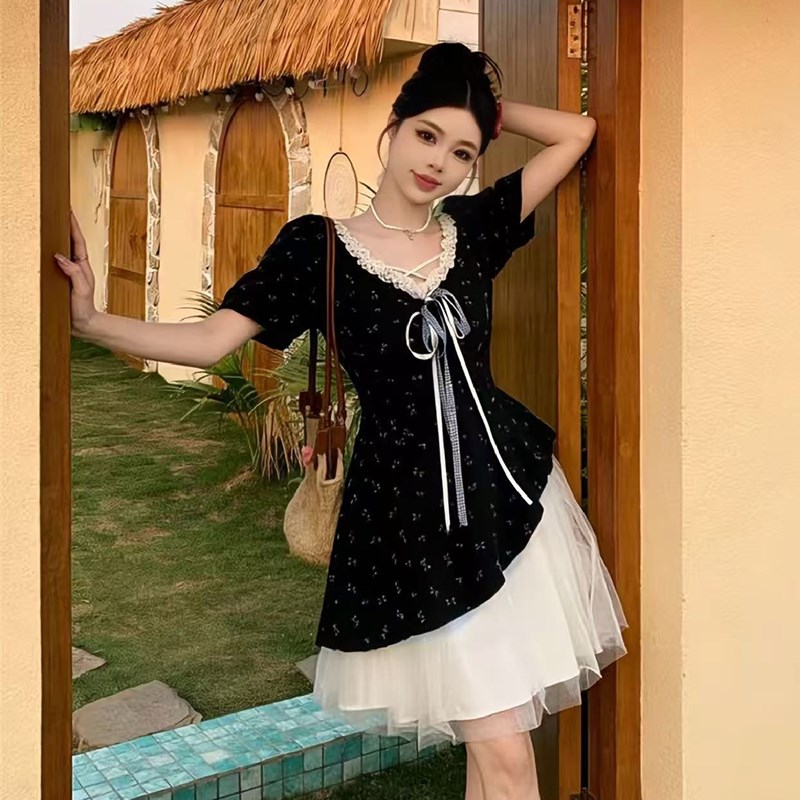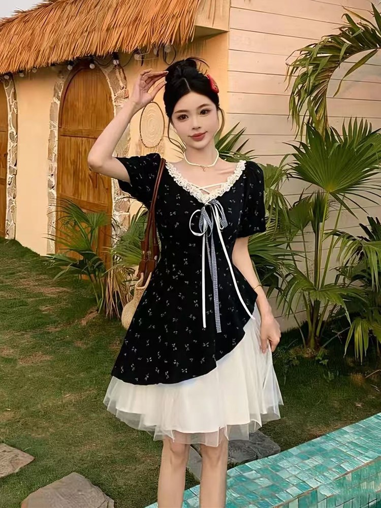 RY2749# 2026夏季新款胖mm甜美温柔风荷叶边网纱拼接收腰显瘦碎花连衣裙女