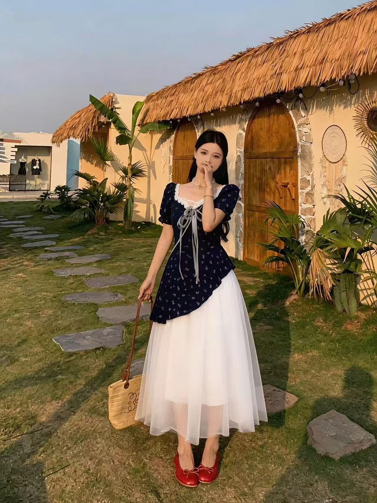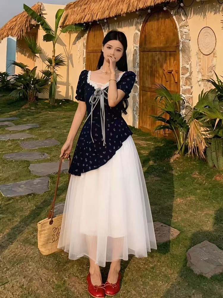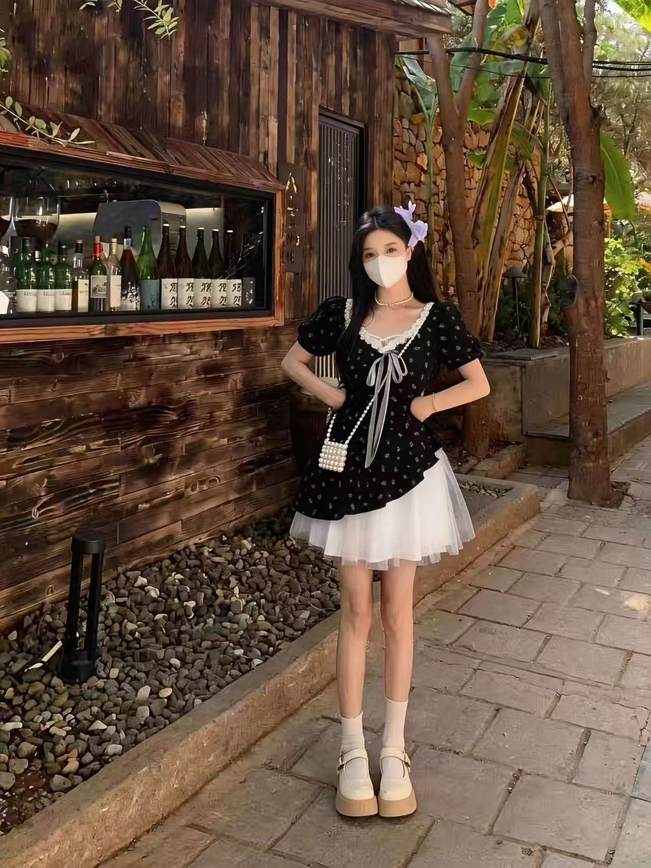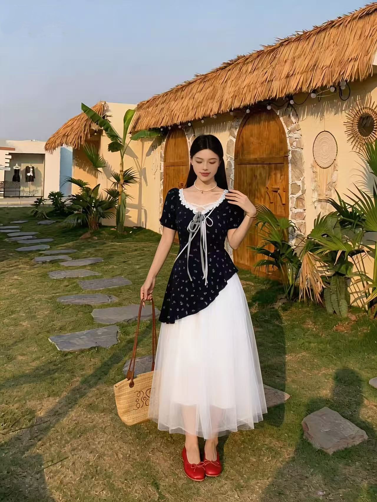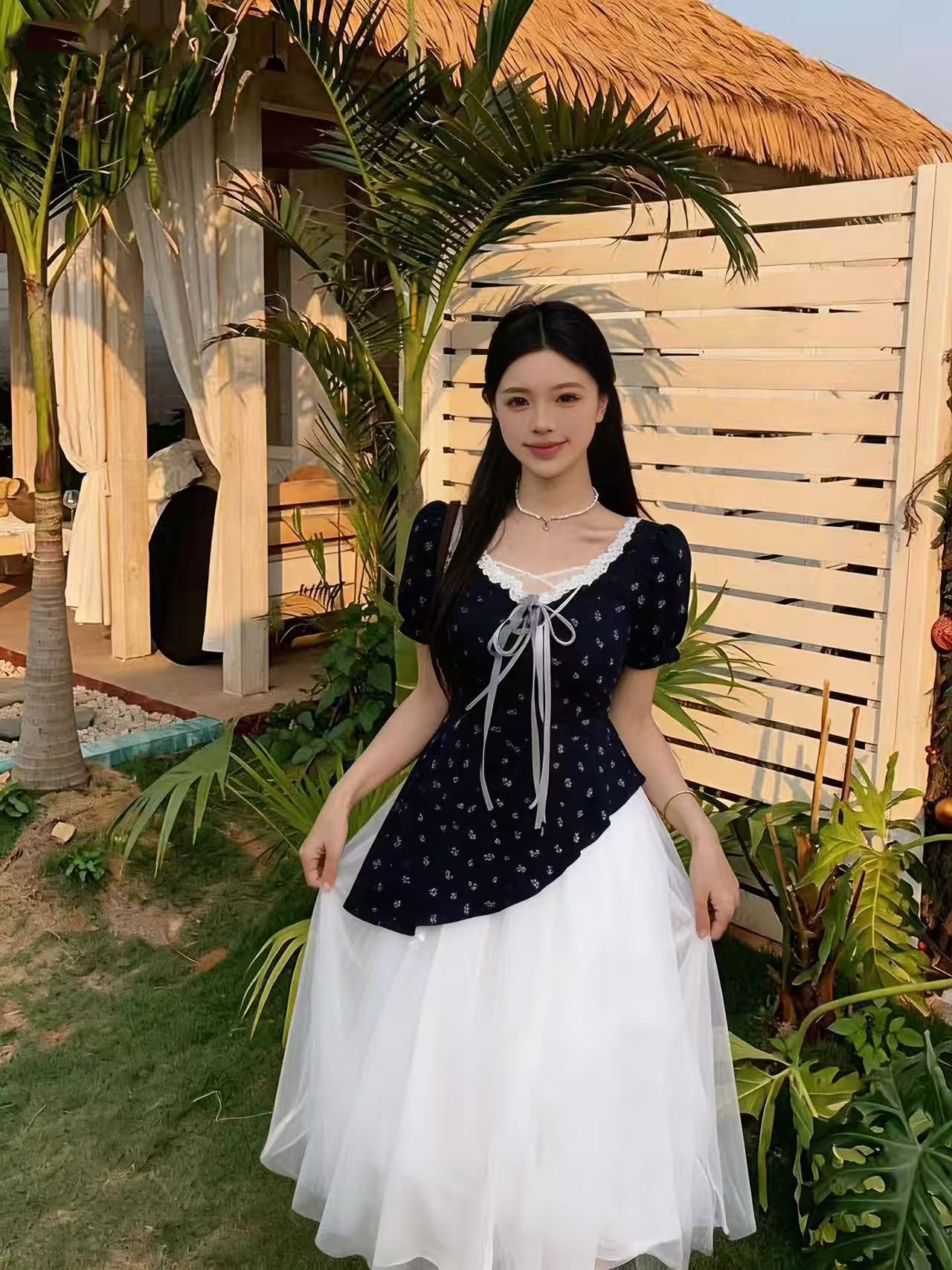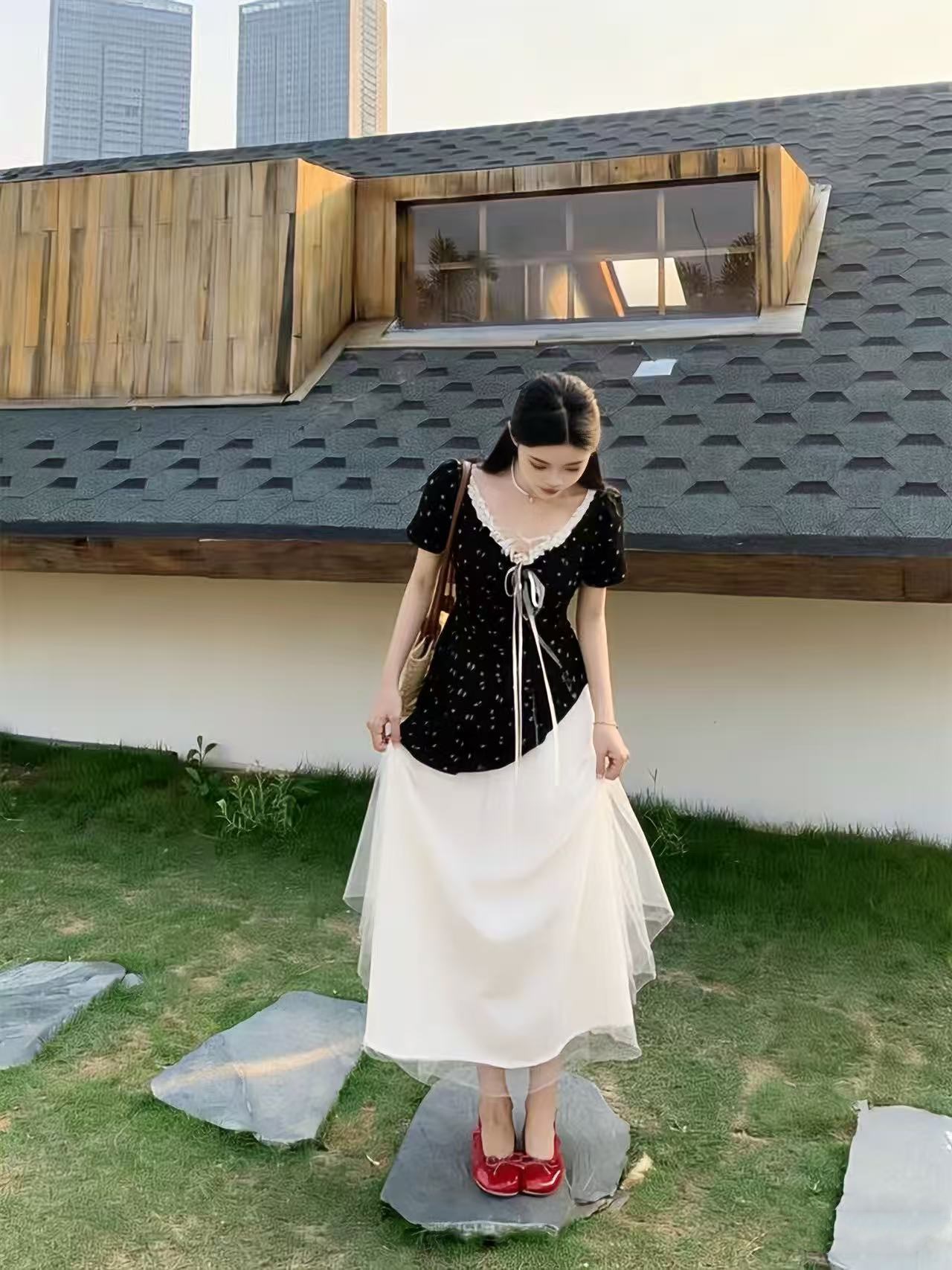 RY2749# 2026夏季新款胖mm甜美温柔风荷叶边网纱拼接收腰显瘦碎花连衣裙女