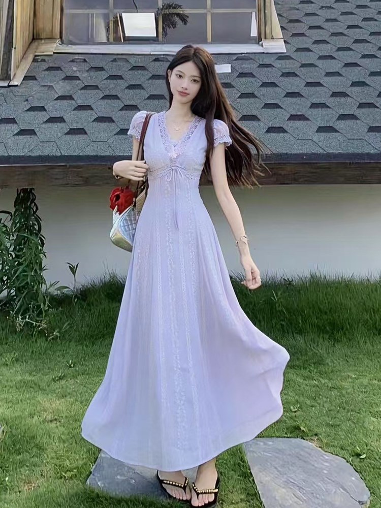 RY2752# 2026夏季新款法式复古温柔紫v领大码设计感气质短袖长款连衣裙子