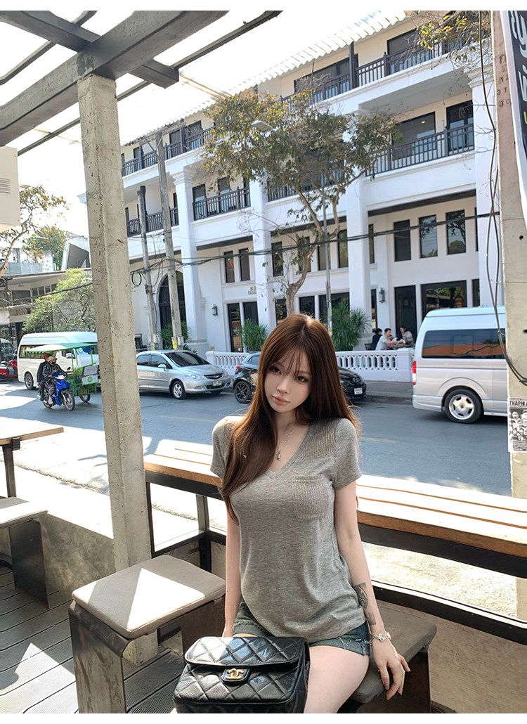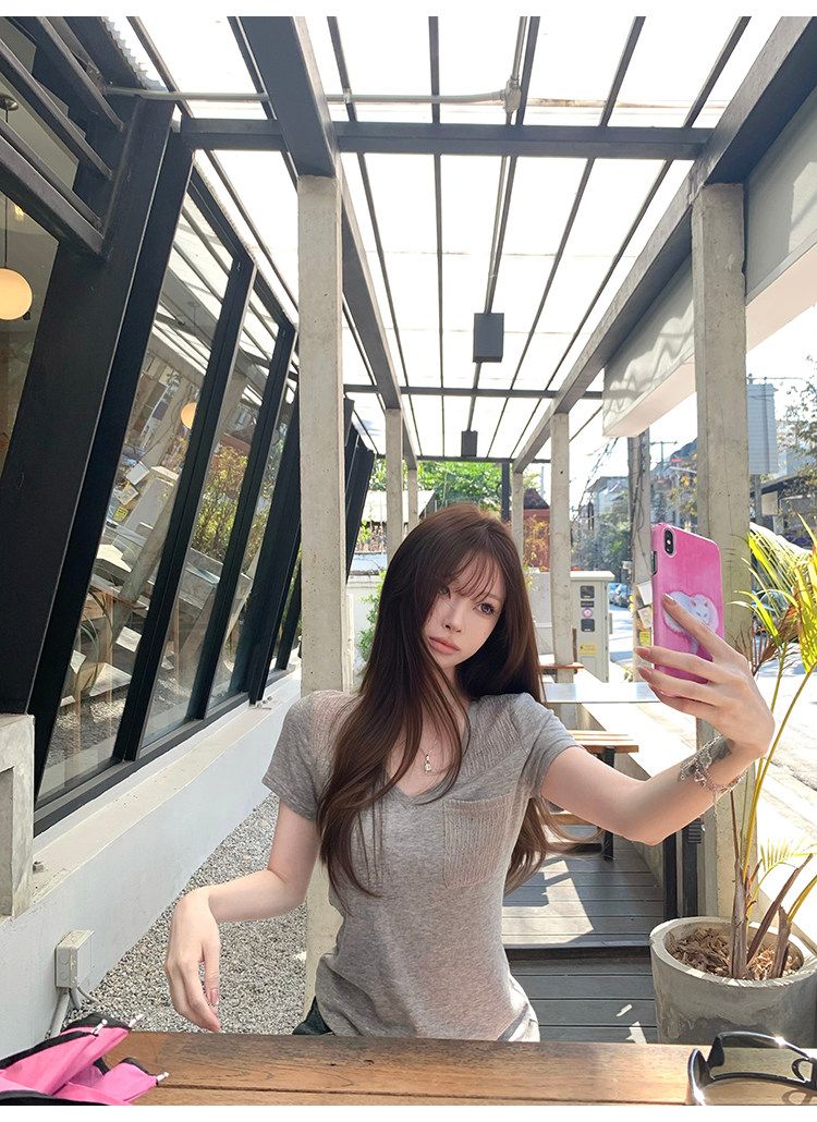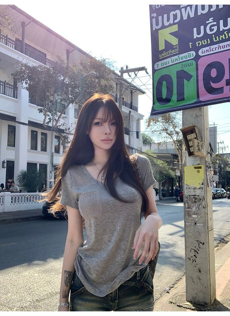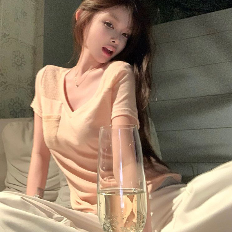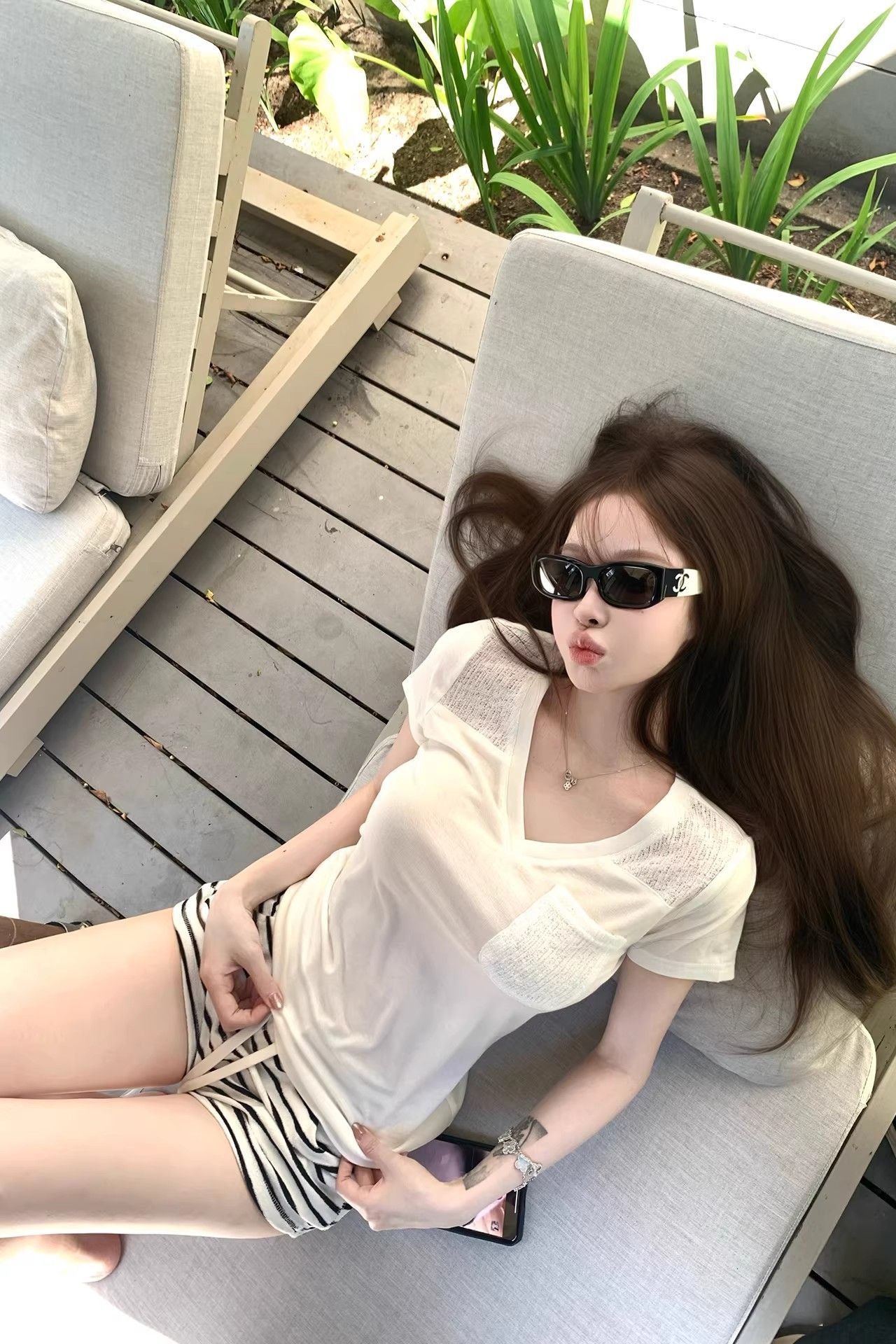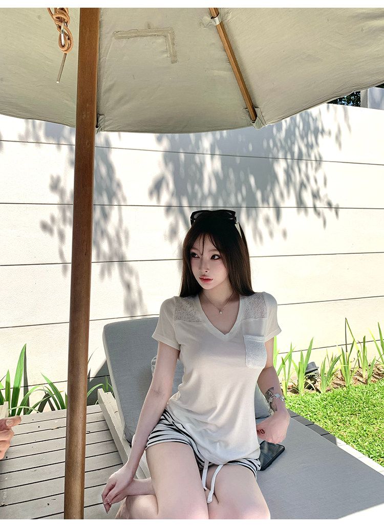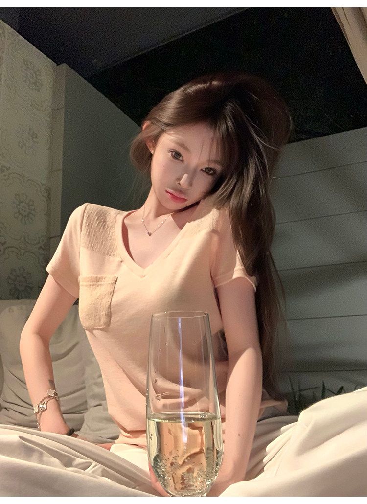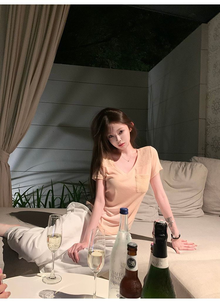 RY2755# Suuuicee 素调美神 黄金配比”肌理拼接 纯欲V领辣妹短袖T恤女