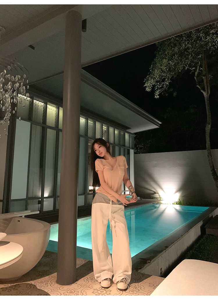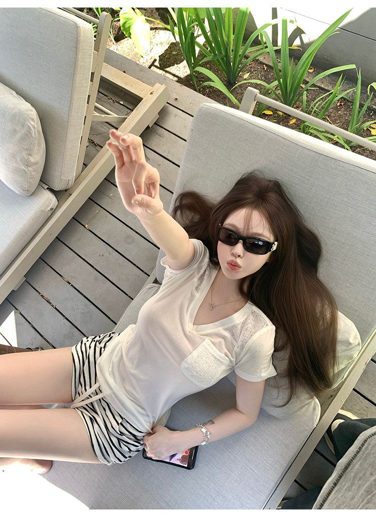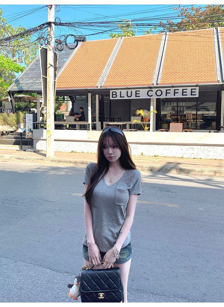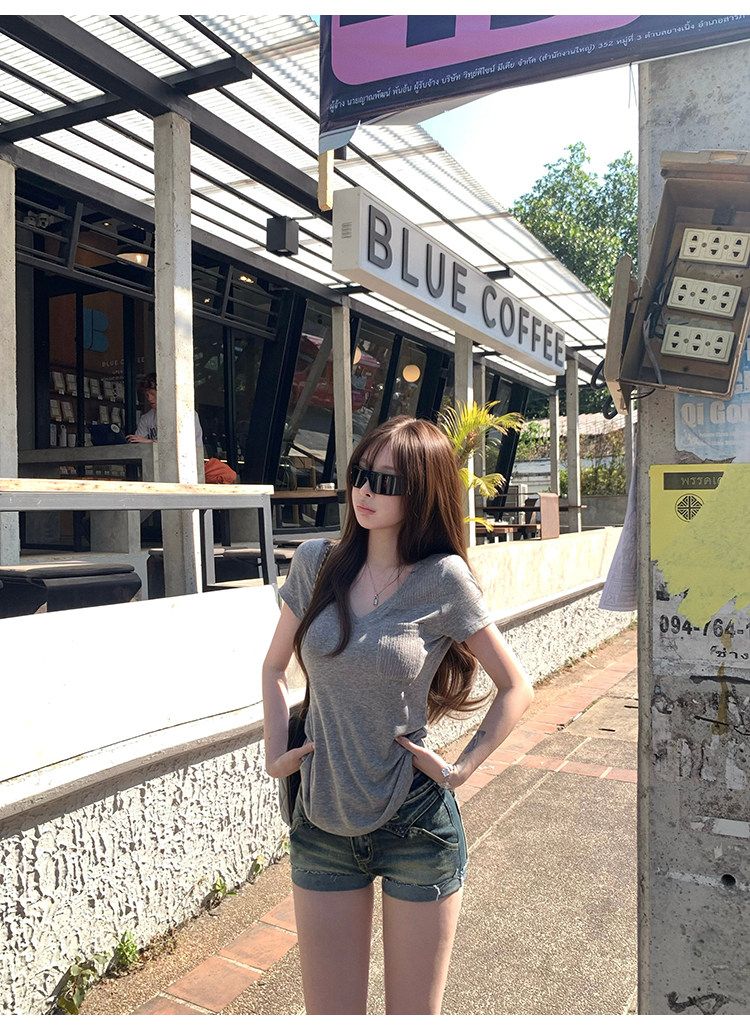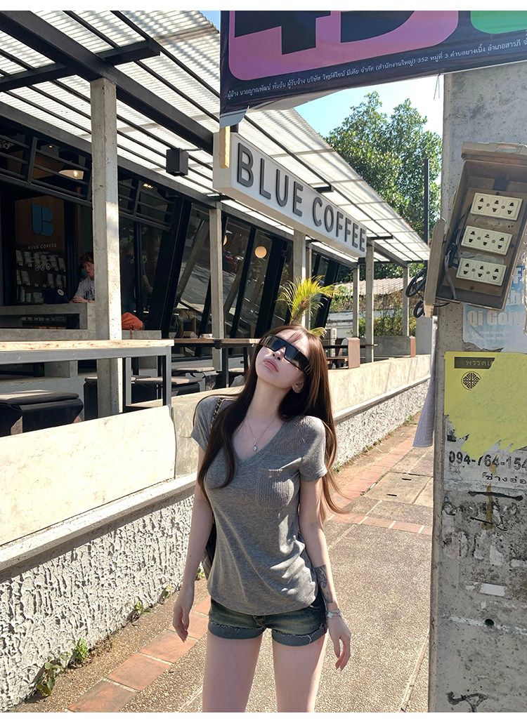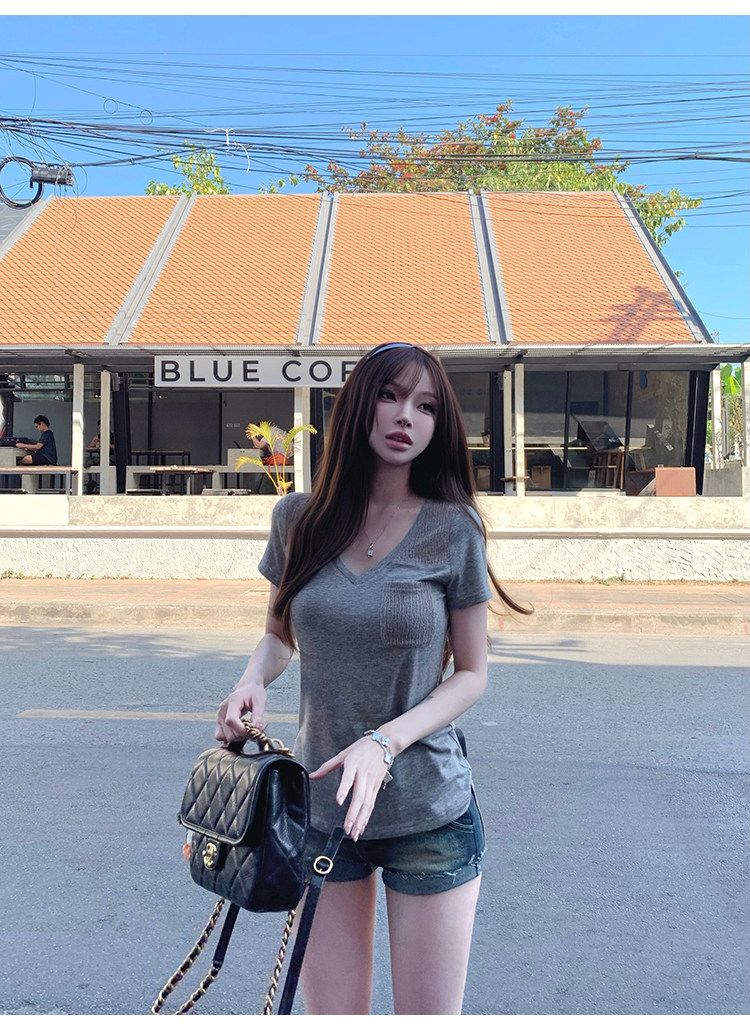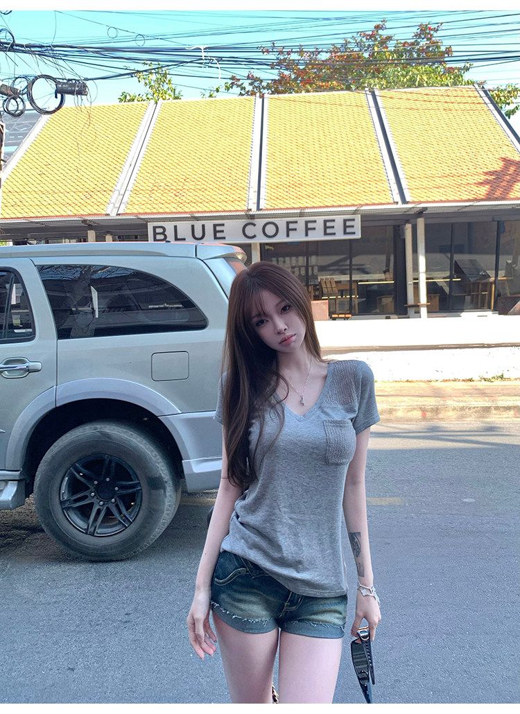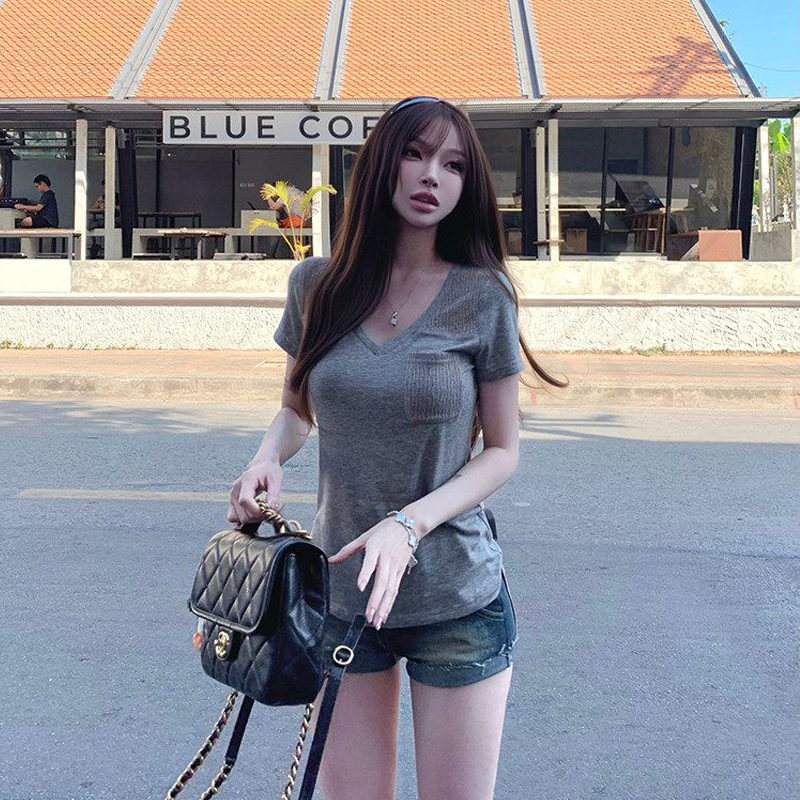 RY2755# Suuuicee 素调美神 黄金配比”肌理拼接 纯欲V领辣妹短袖T恤女
