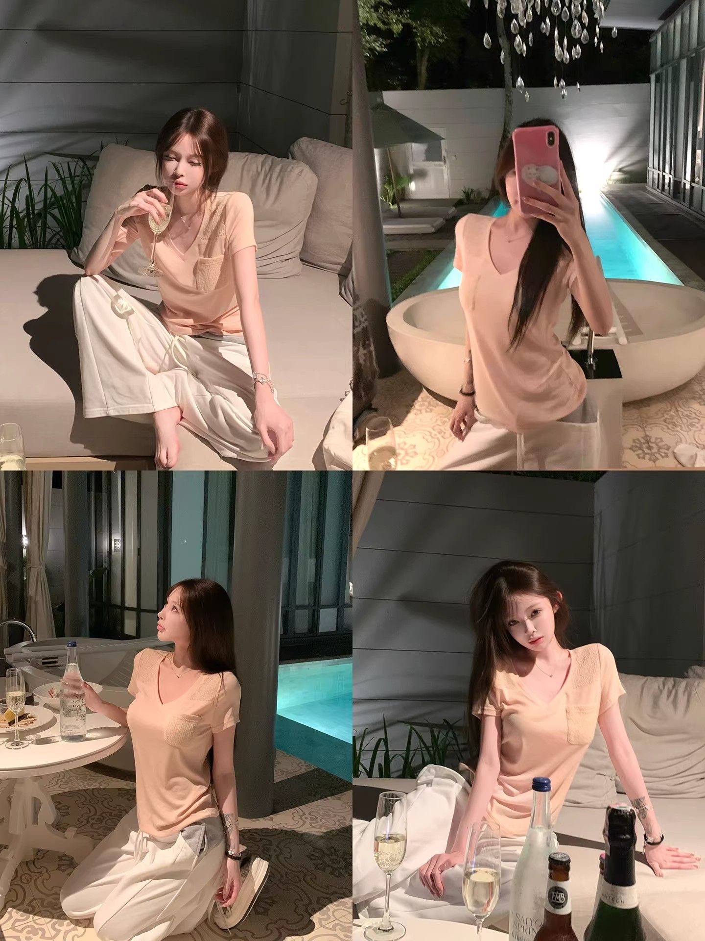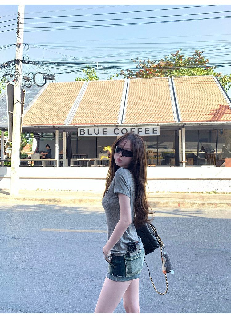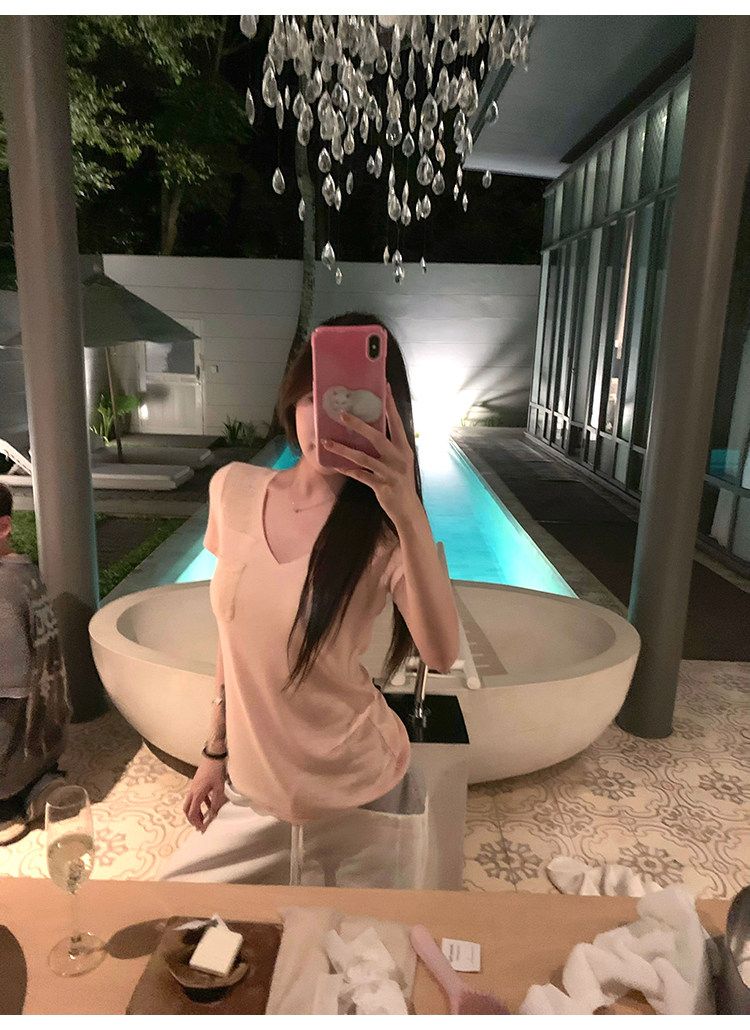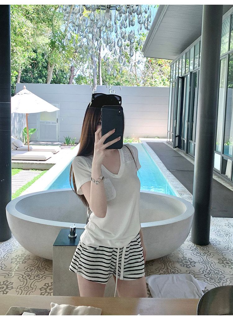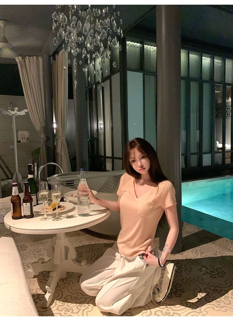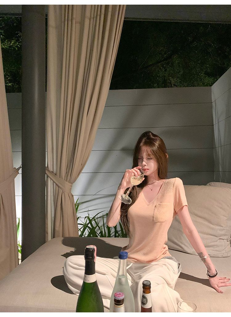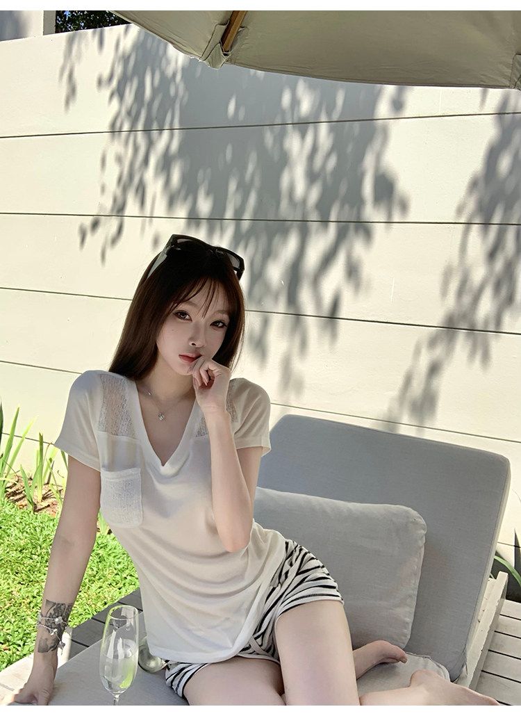 RY2755# Suuuicee 素调美神 黄金配比”肌理拼接 纯欲V领辣妹短袖T恤女