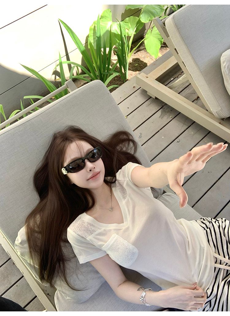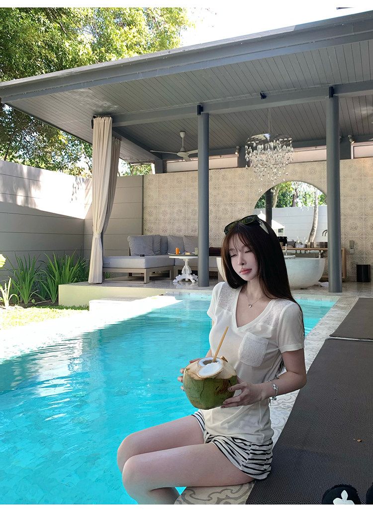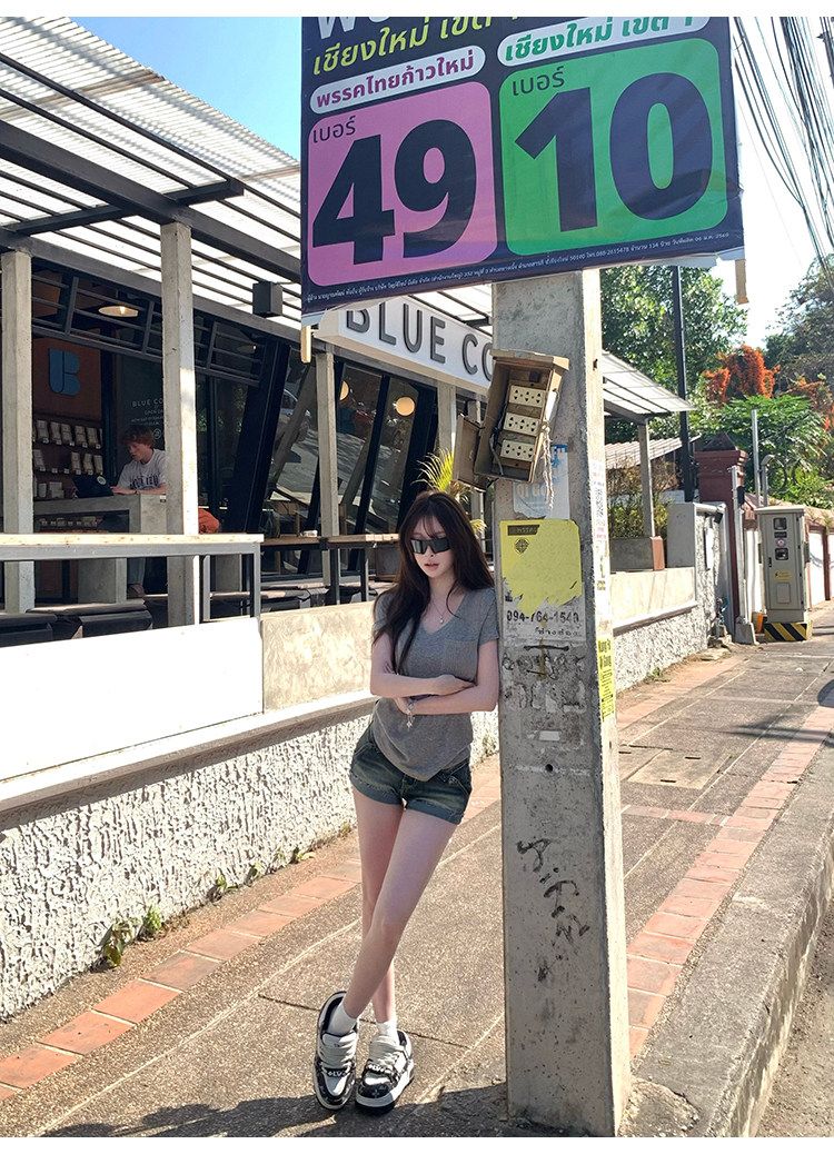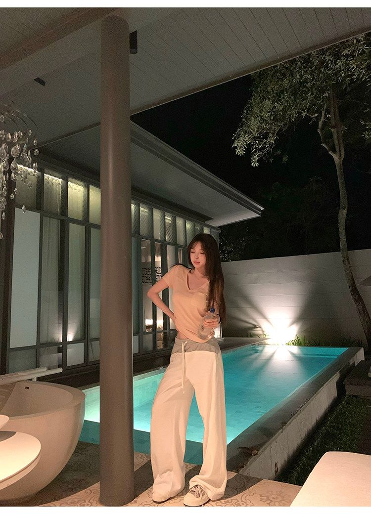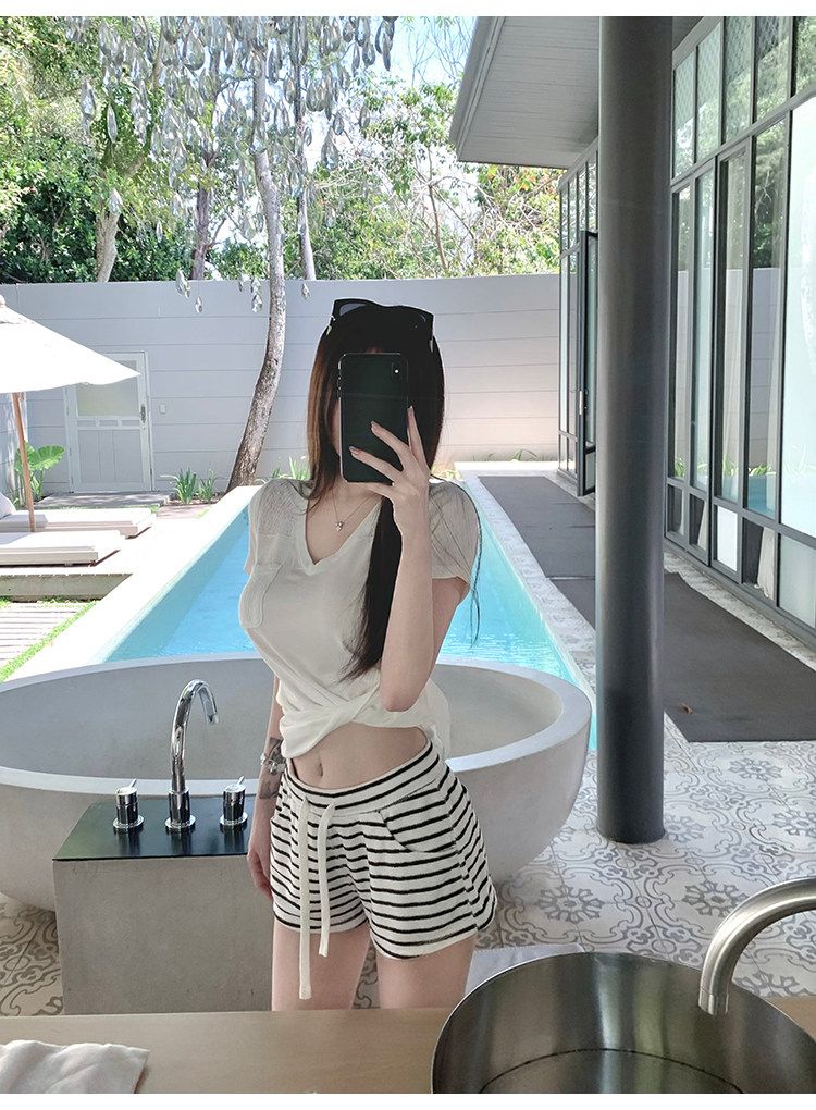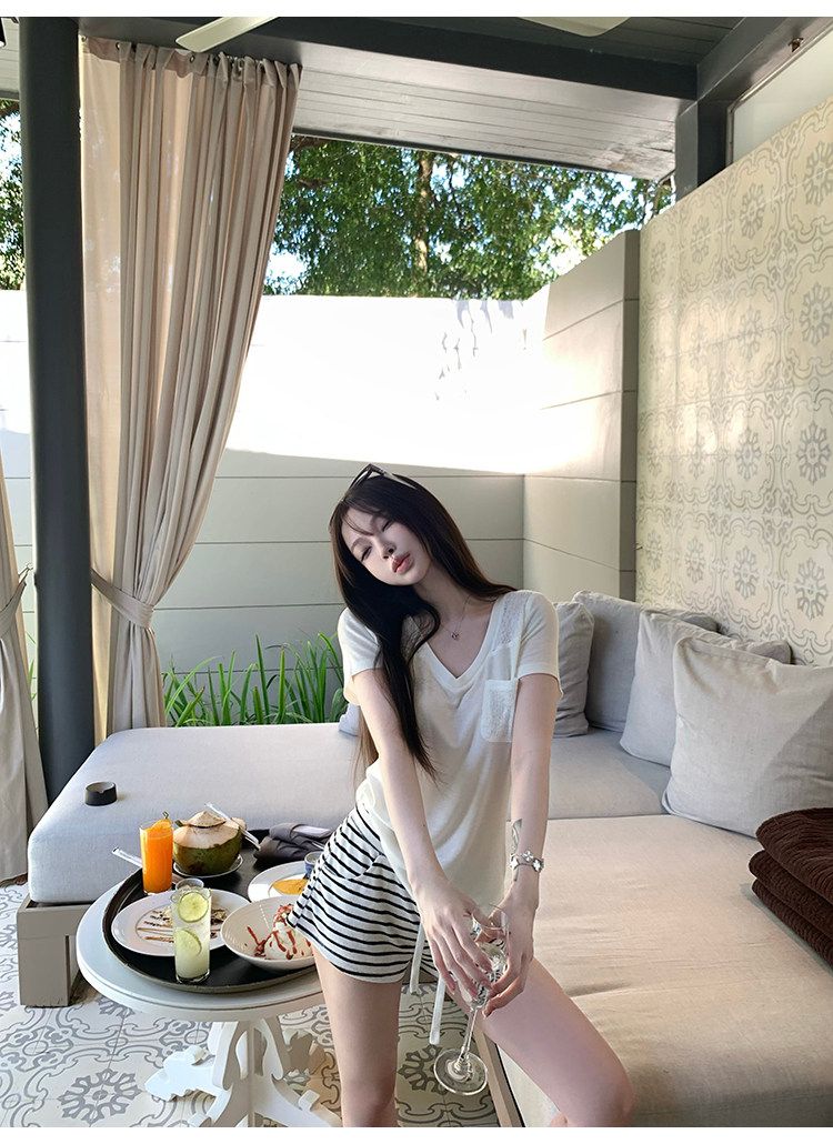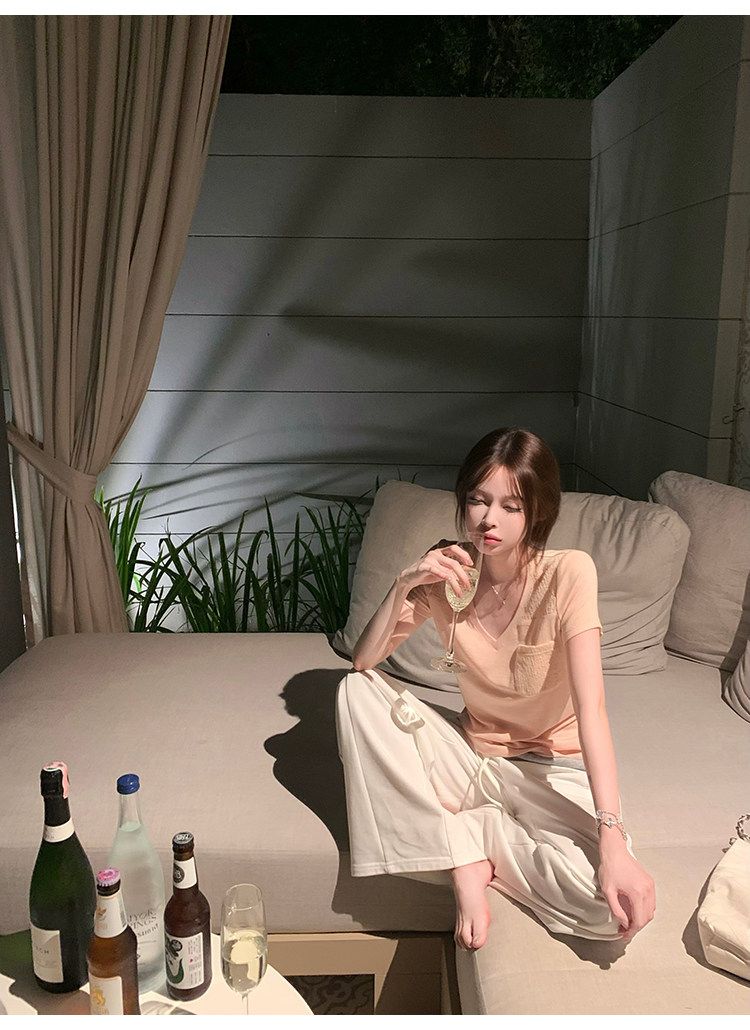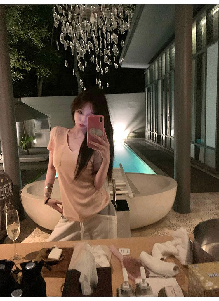 RY2755# Suuuicee 素调美神 黄金配比”肌理拼接 纯欲V领辣妹短袖T恤女