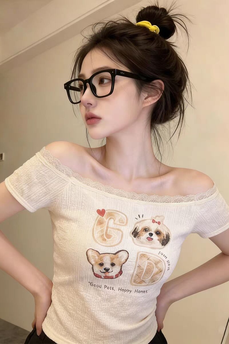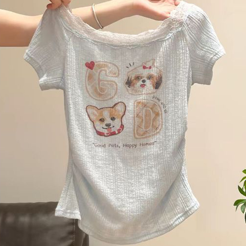 RY2756# 好质量 夏季新款小狗印花蕾丝一字肩韩系气质短袖T恤女辣妹上衣