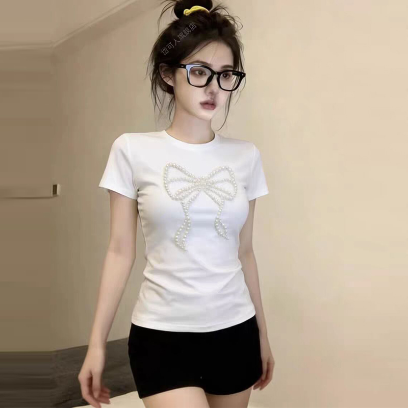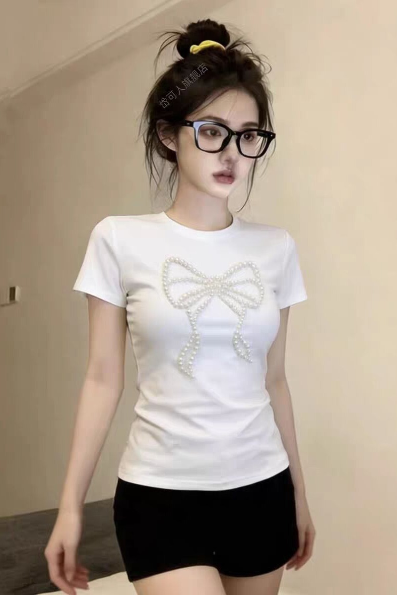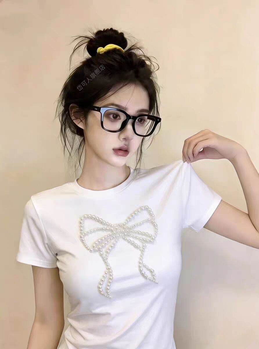 RY2757# 40支精棉/原版订珠 韩版设计感蝴蝶结钉珠短袖T恤女纯欲辣妹上衣