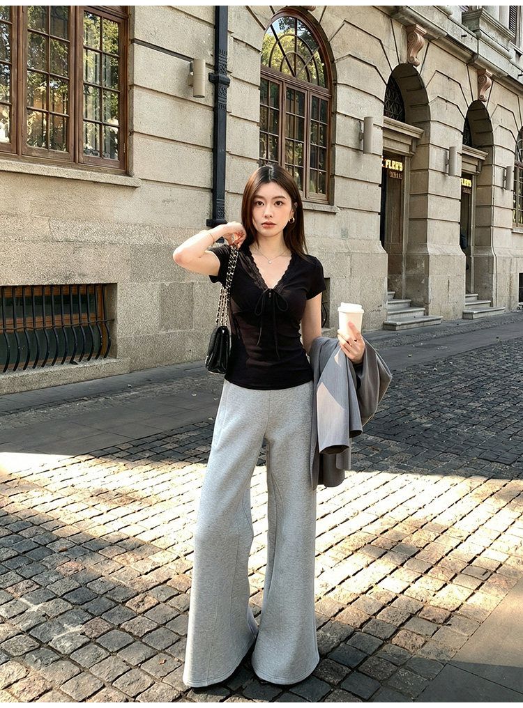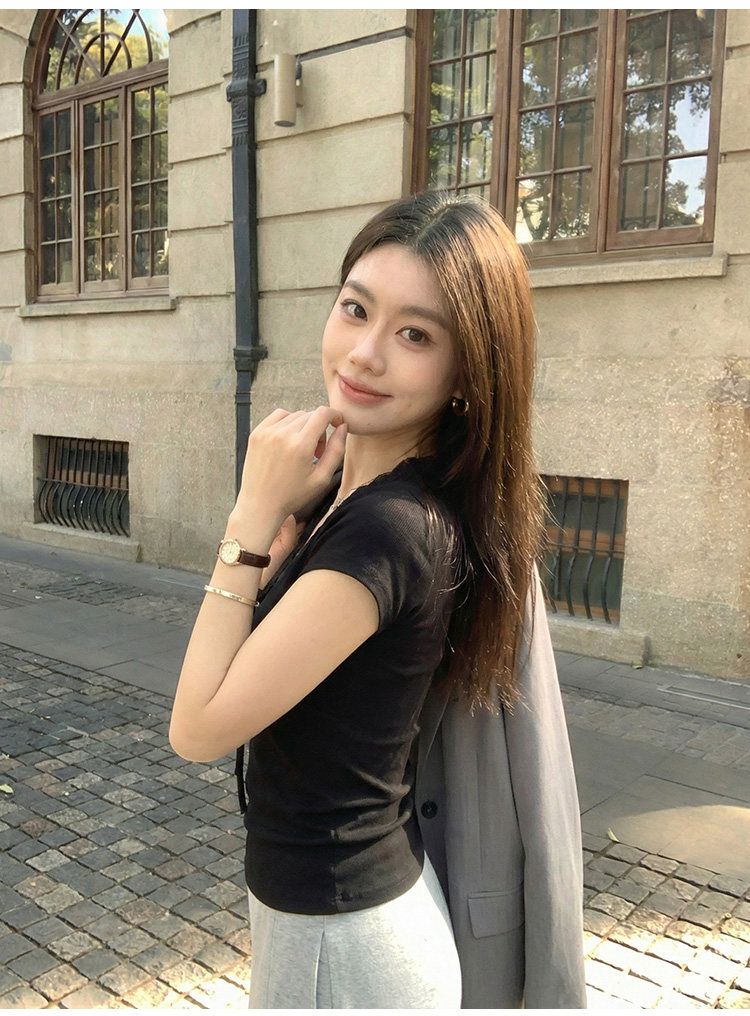 RY2758# 短袖t恤女2026新款夏季黑色短款修身蕾丝拼接漂亮纯棉V领绑带上衣