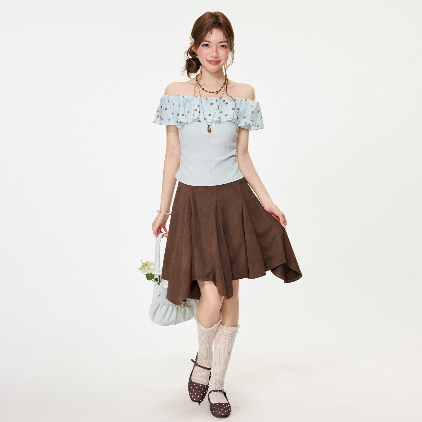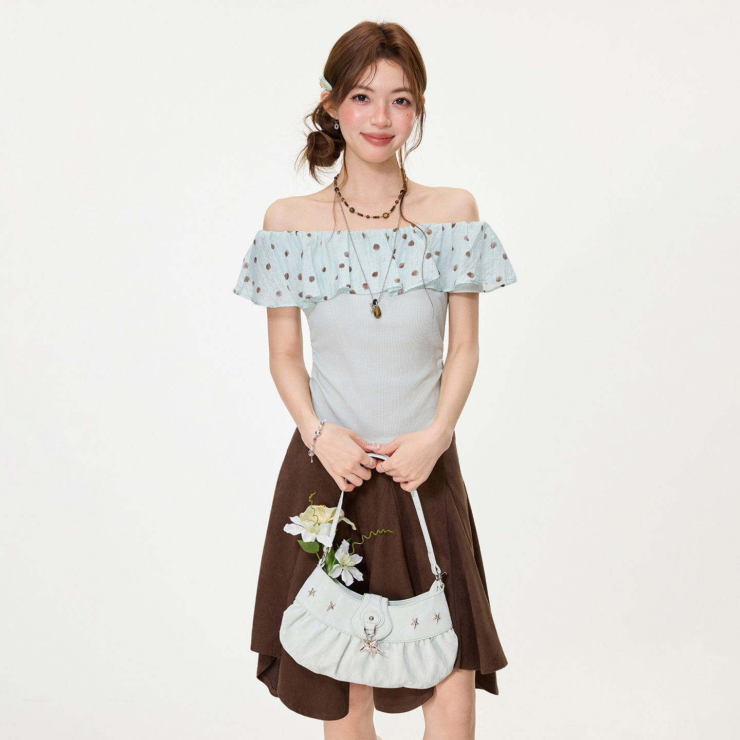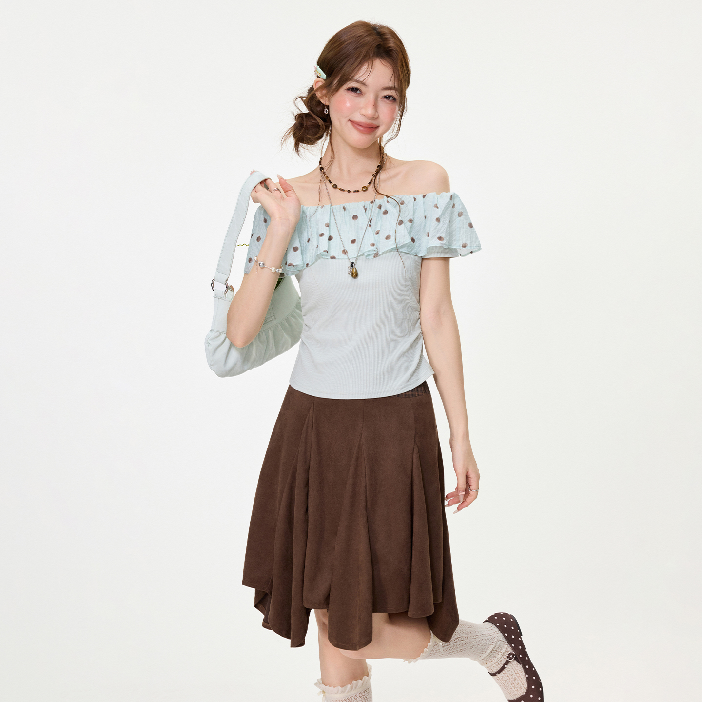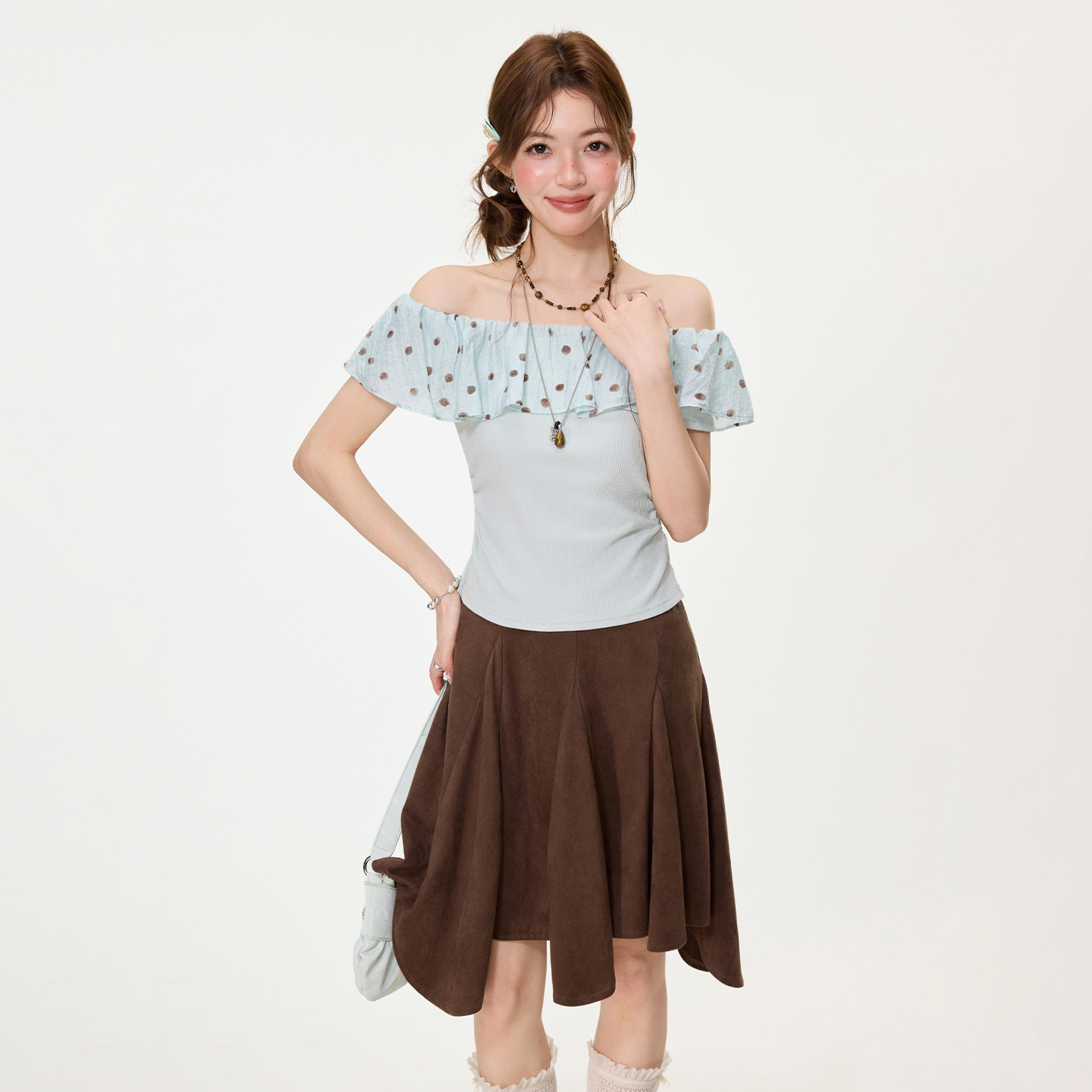 RY2767# 实拍实价高级感波点荷叶花边一字领露肩短袖t恤女夏季漂亮小上衣