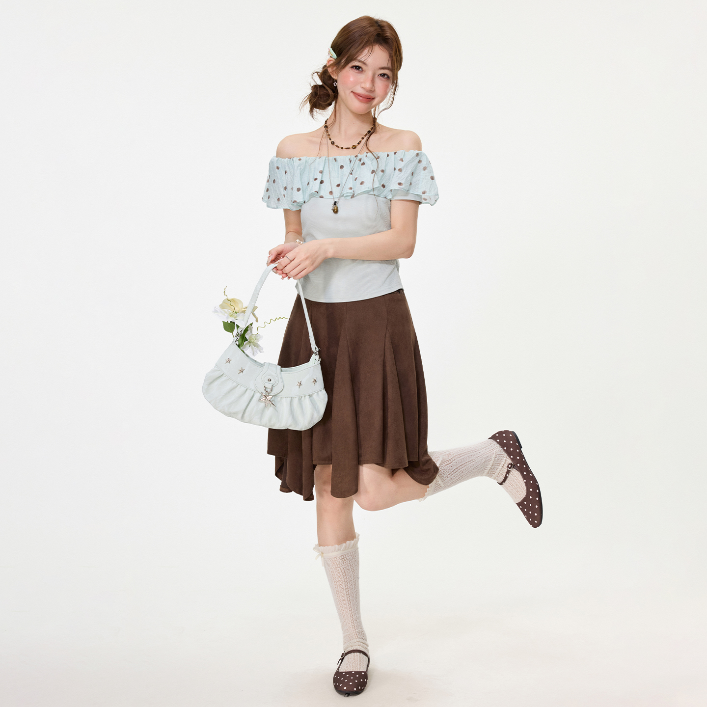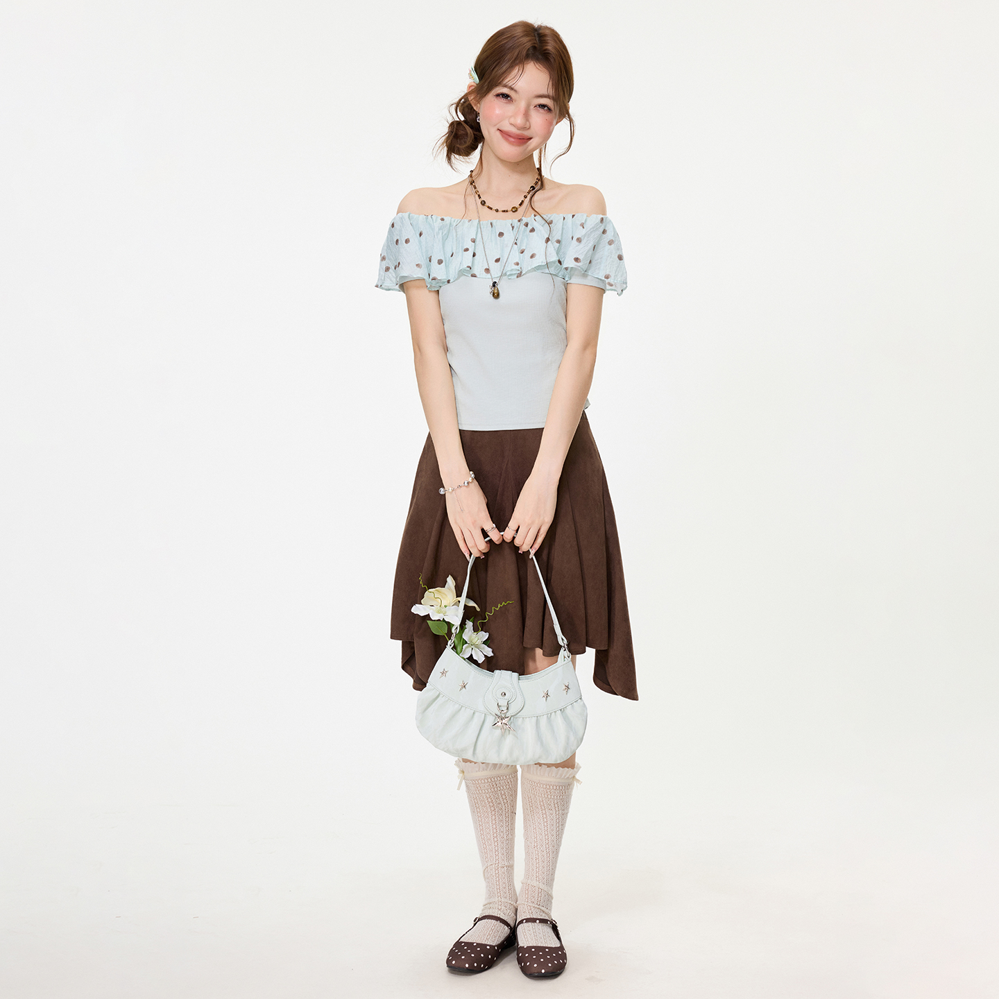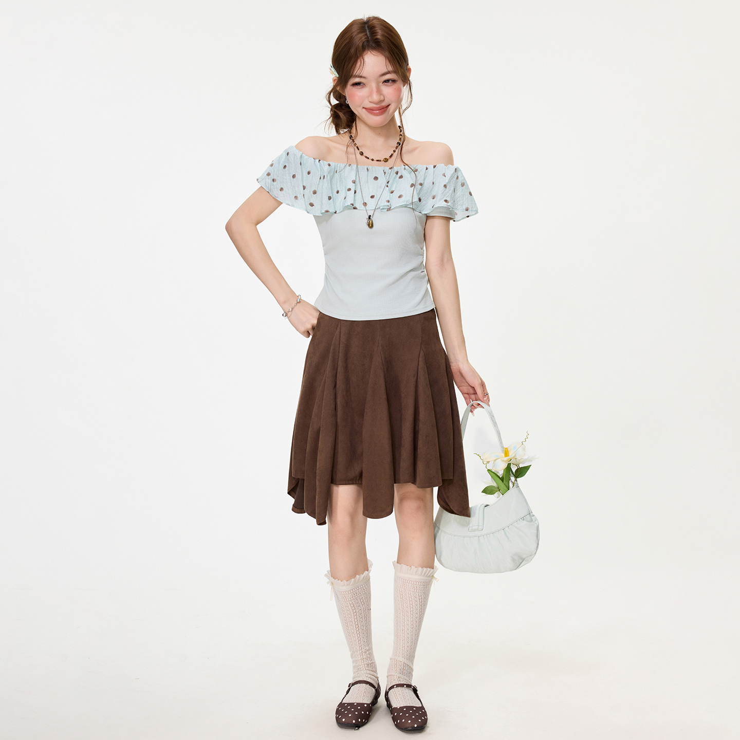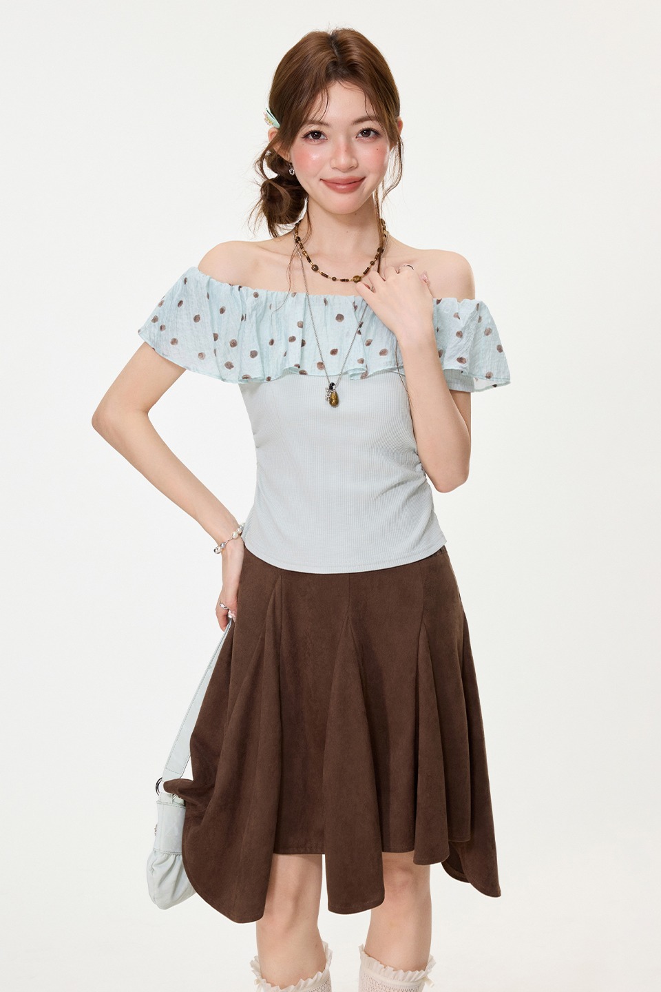RY2767# 实拍实价高级感波点荷叶花边一字领露肩短袖t恤女夏季漂亮小上衣