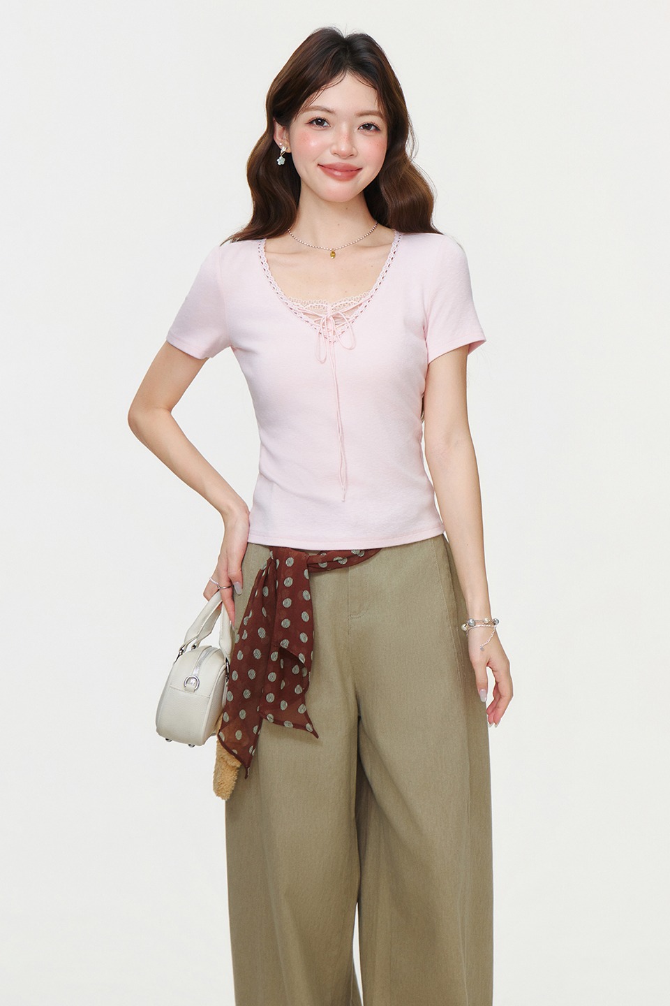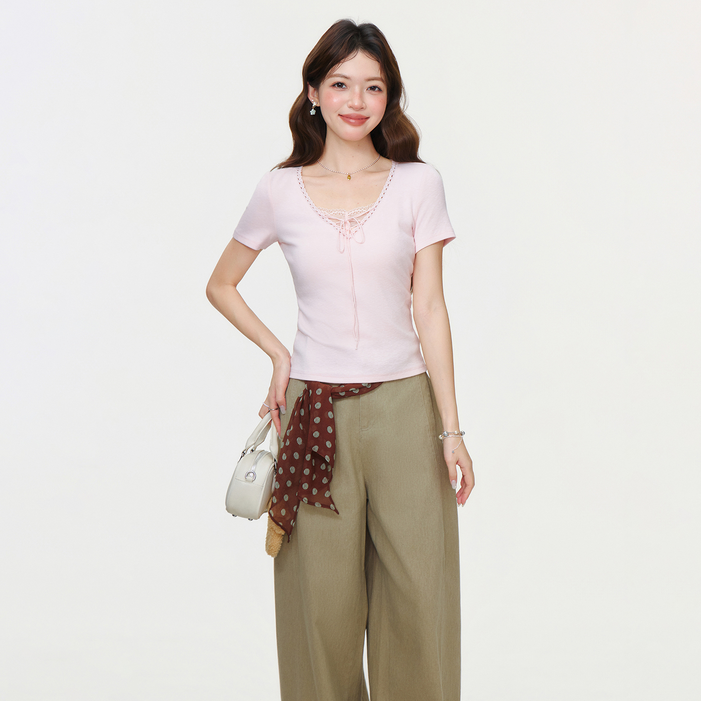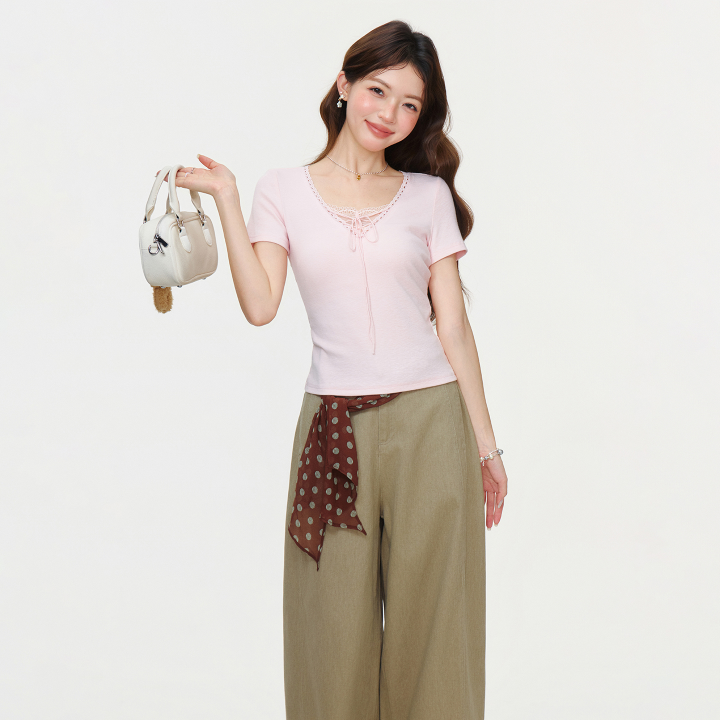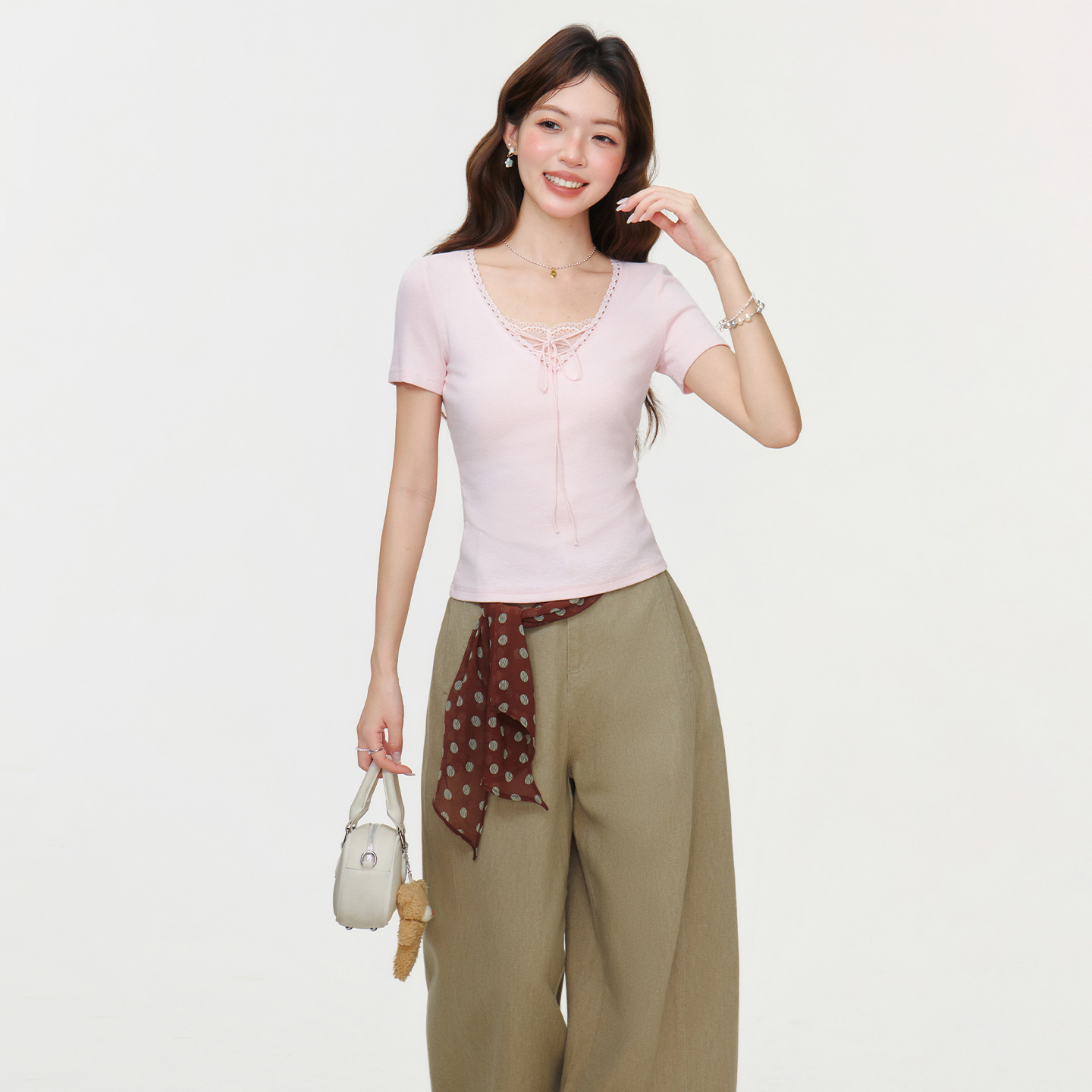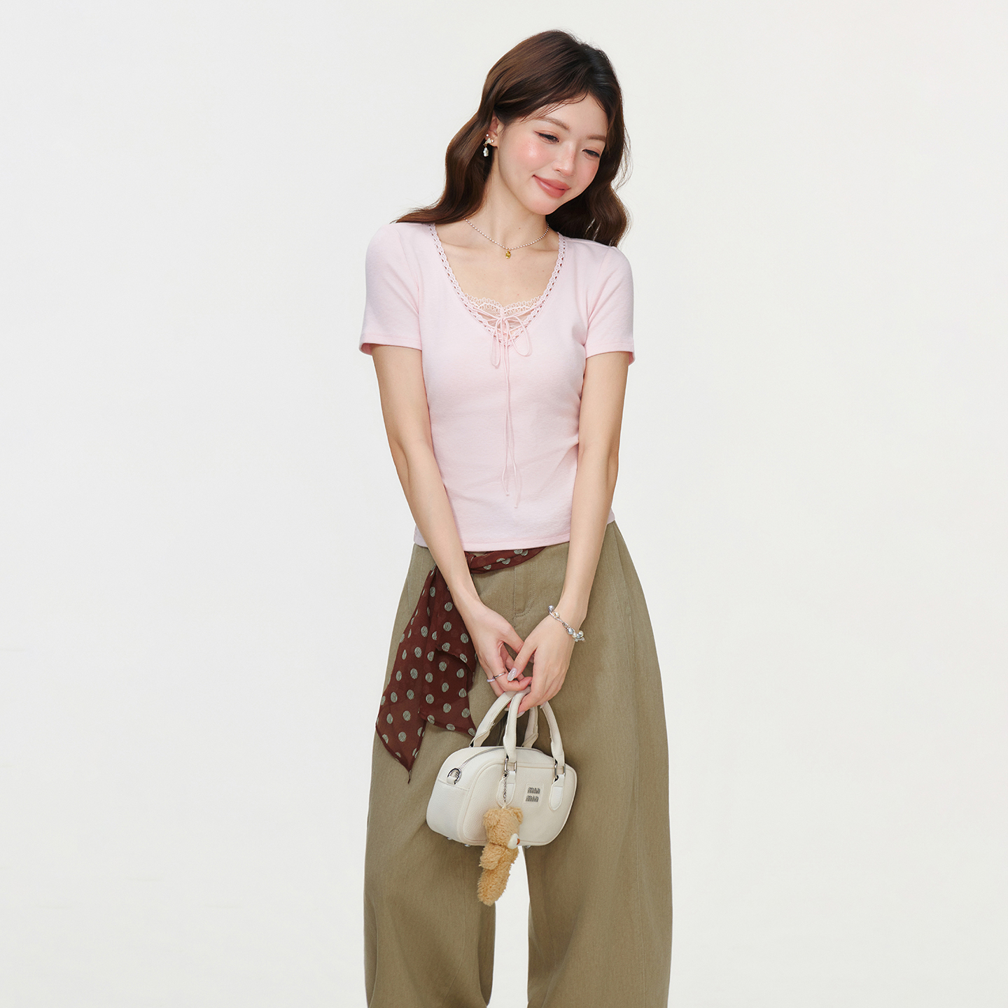 RY2769# 实拍实价芭蕾风韩系粉色v领蕾丝花边短袖T恤女夏季修身显瘦小上衣