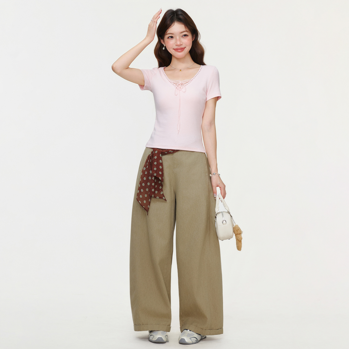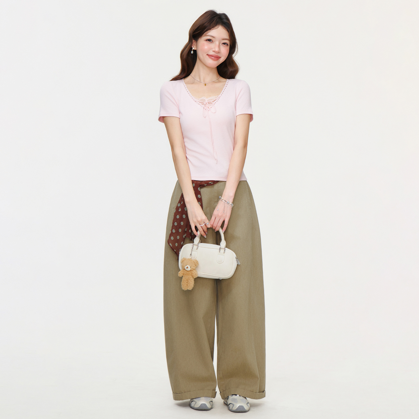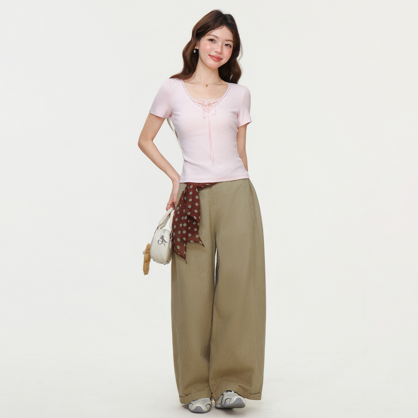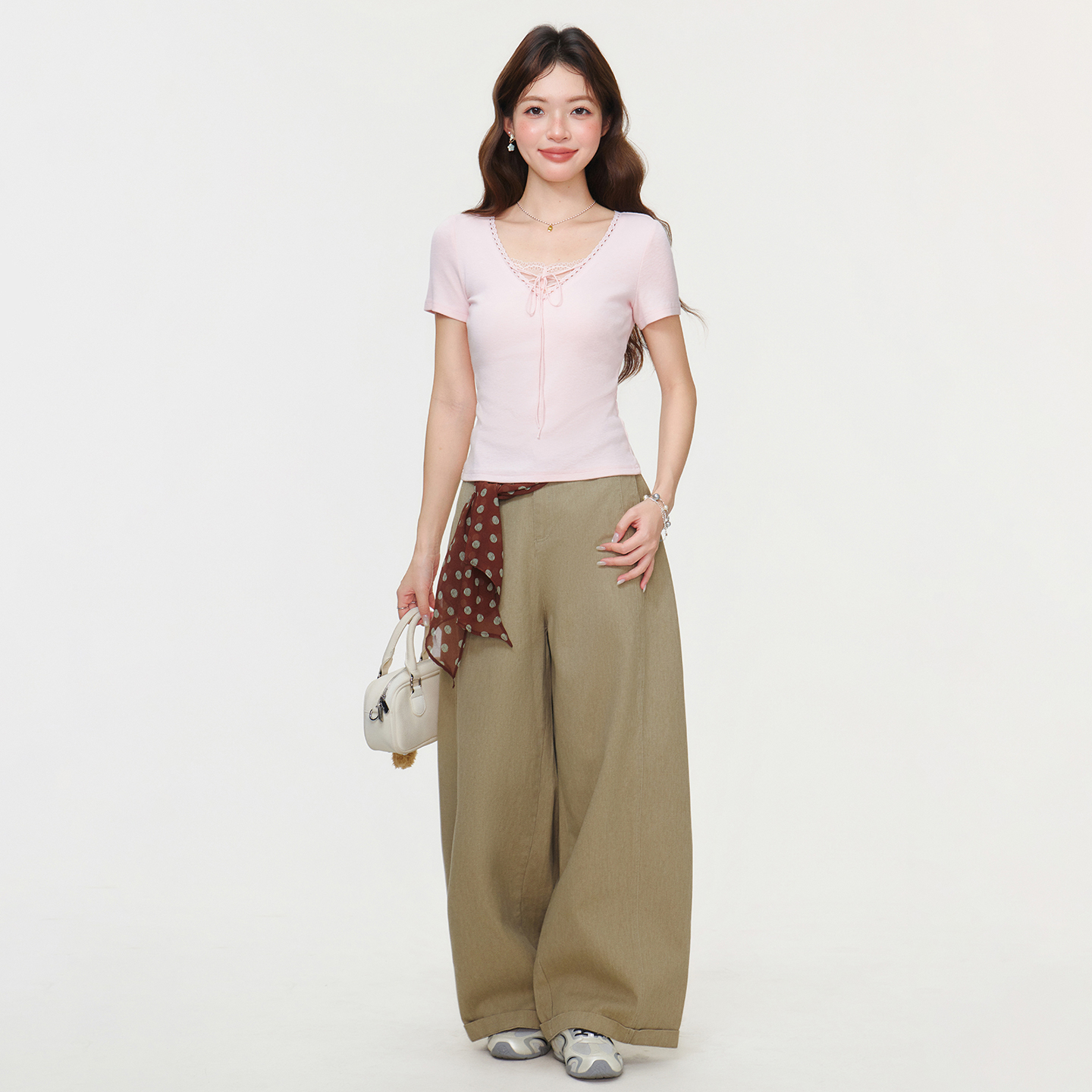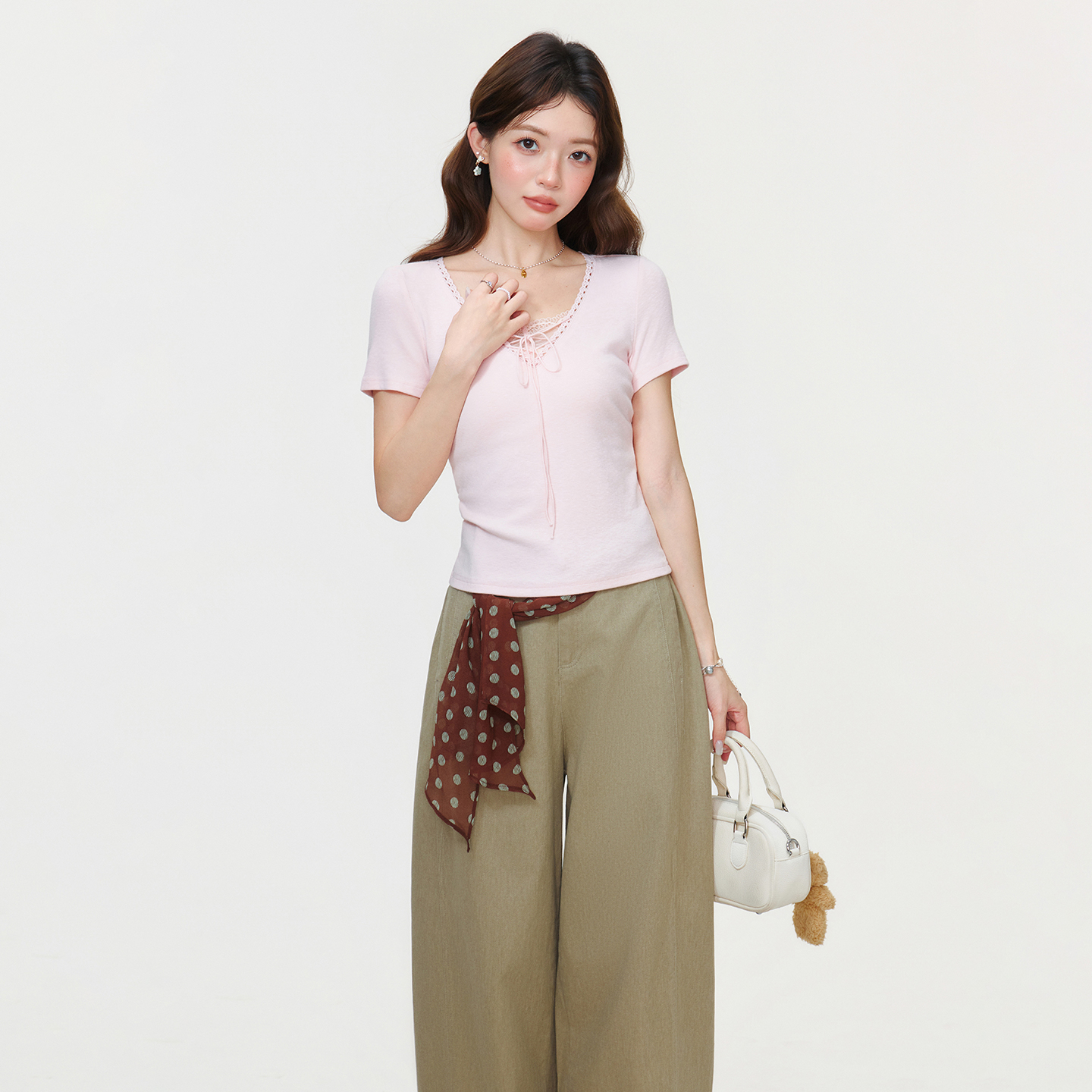 RY2769# 实拍实价芭蕾风韩系粉色v领蕾丝花边短袖T恤女夏季修身显瘦小上衣