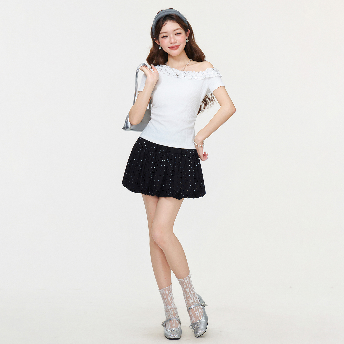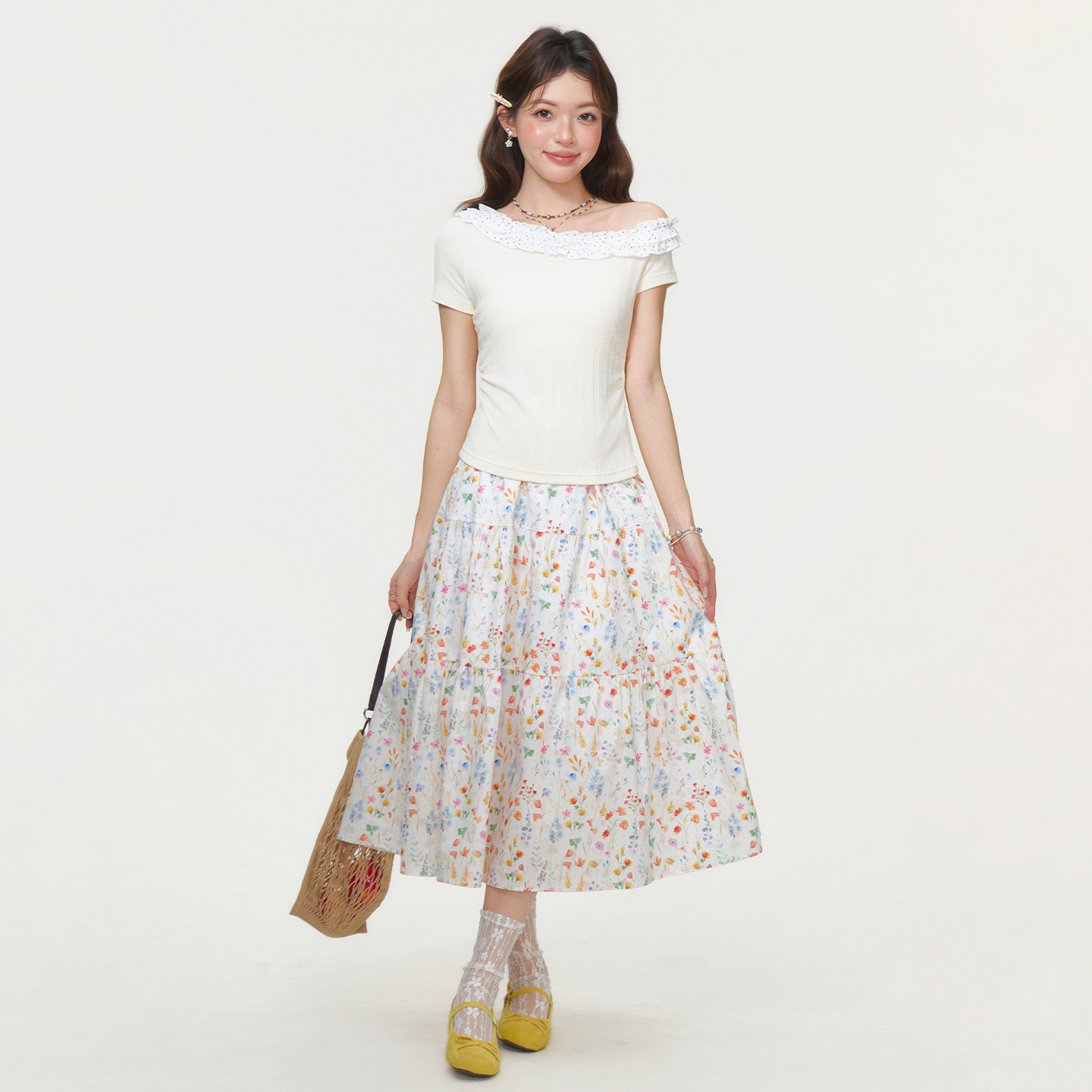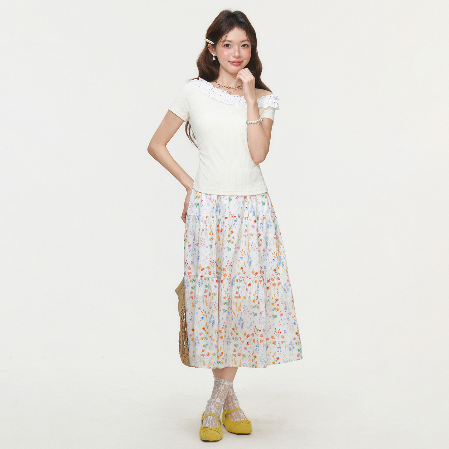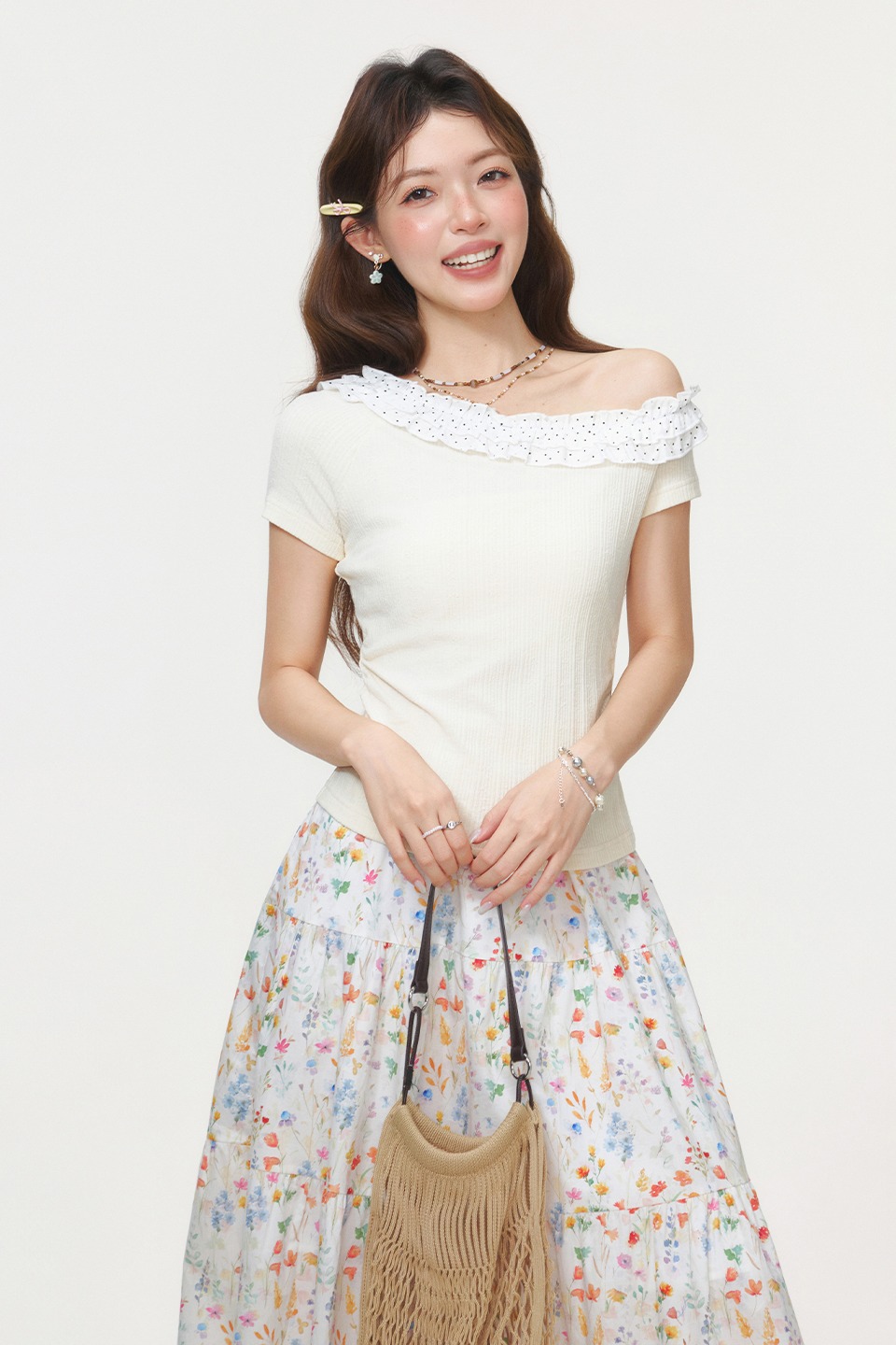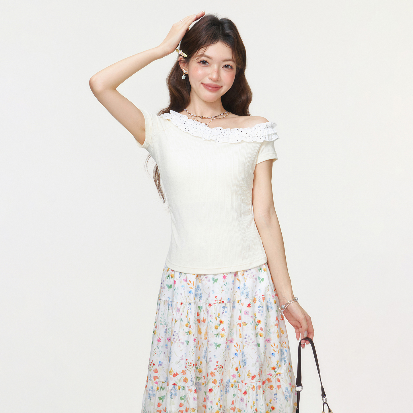 RY2771# 实拍实价韩系木耳边斜领露肩短袖T恤女2026夏季掐腰修身短款上衣