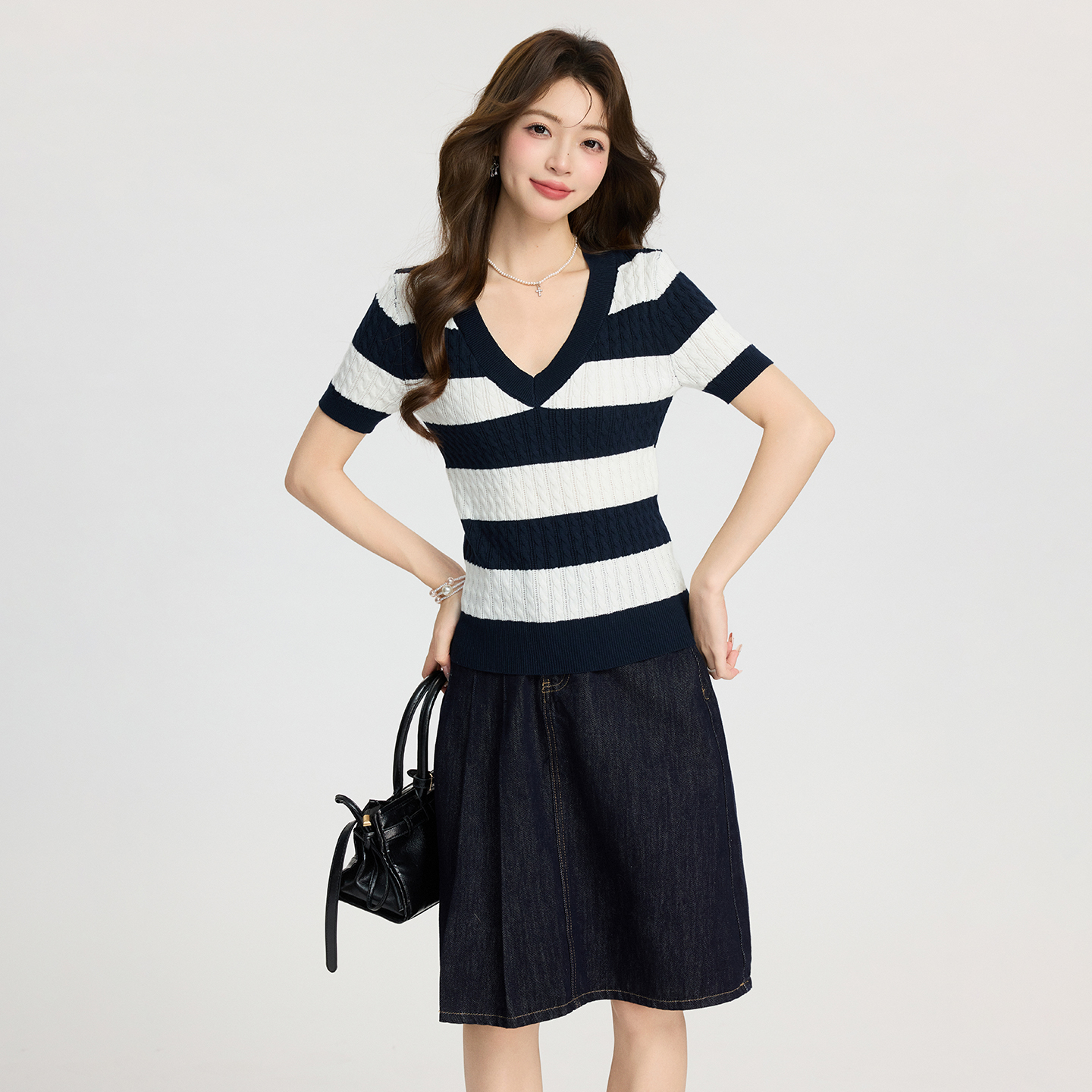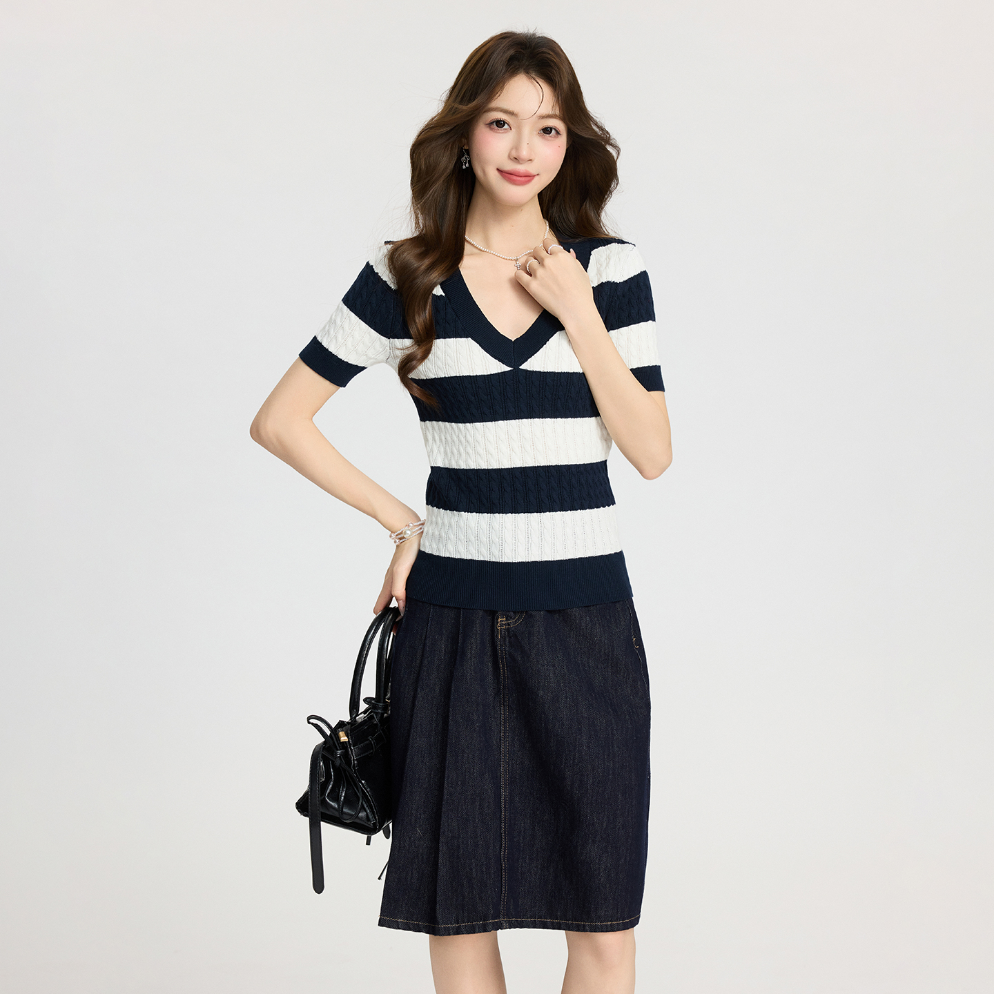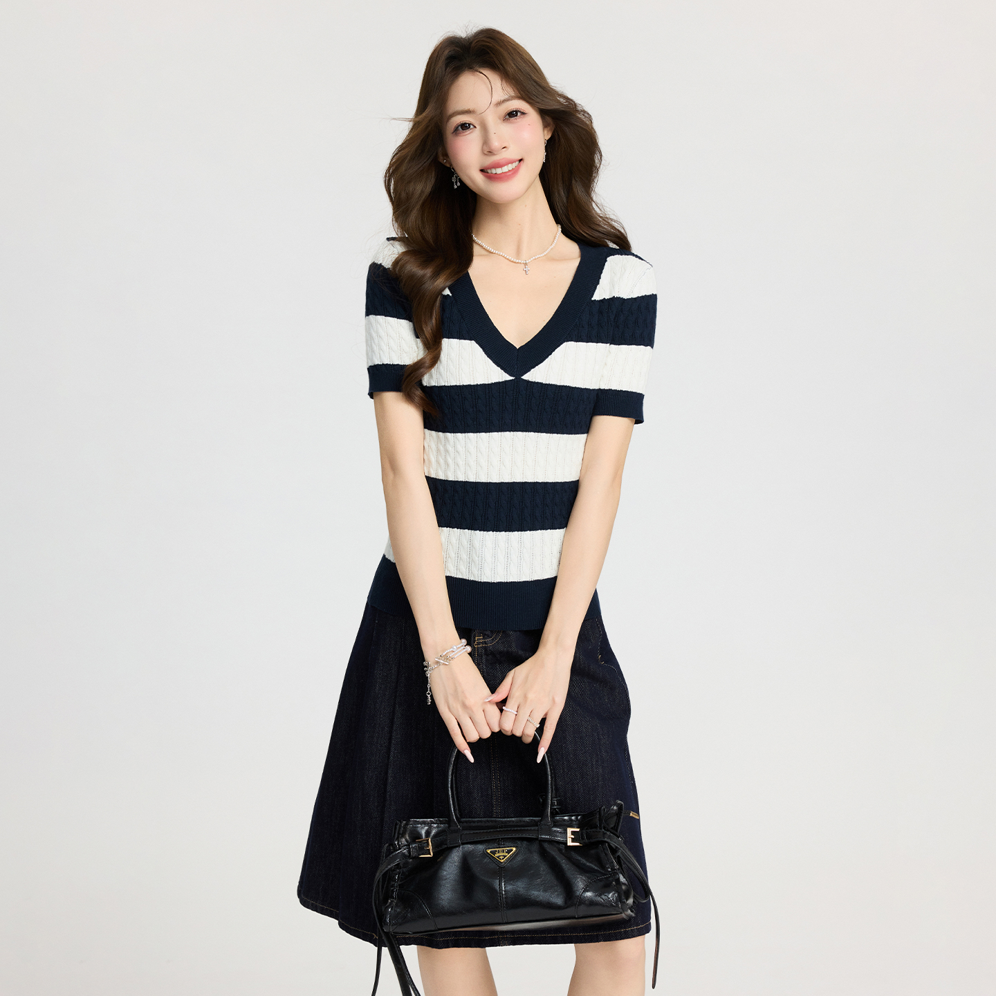 RY2775# 实拍实价韩系条纹V领短袖套头麻花针织衫女夏季撞色复古显瘦上衣