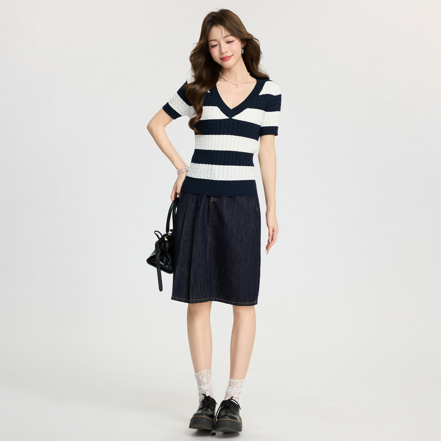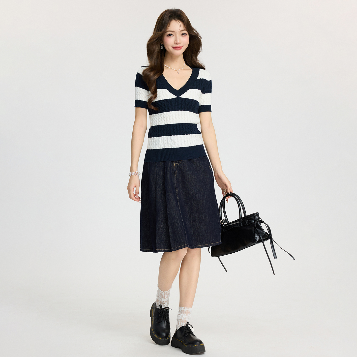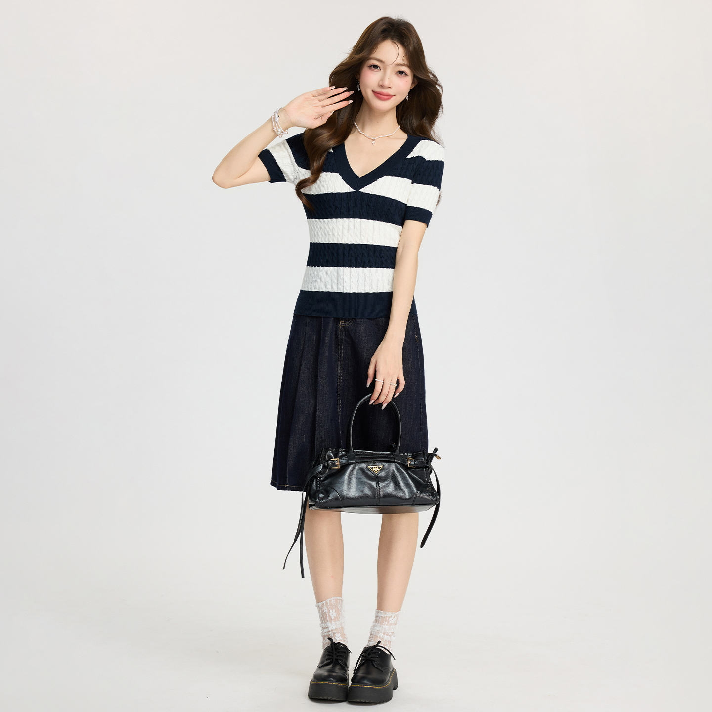RY2775# 实拍实价韩系条纹V领短袖套头麻花针织衫女夏季撞色复古显瘦上衣