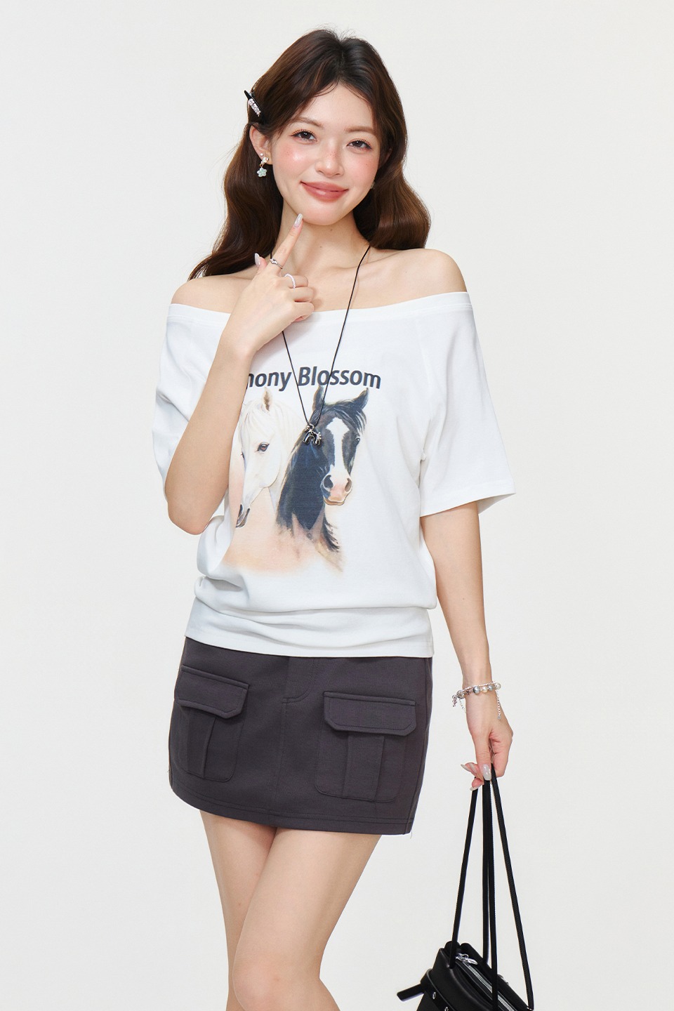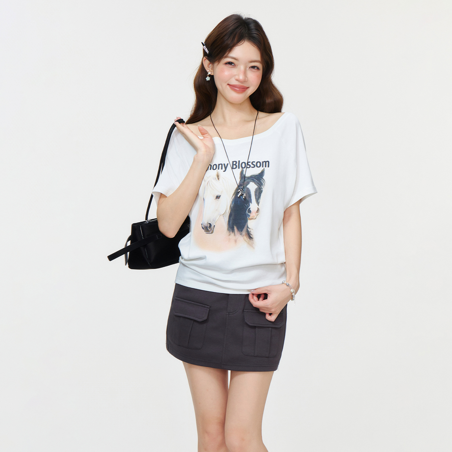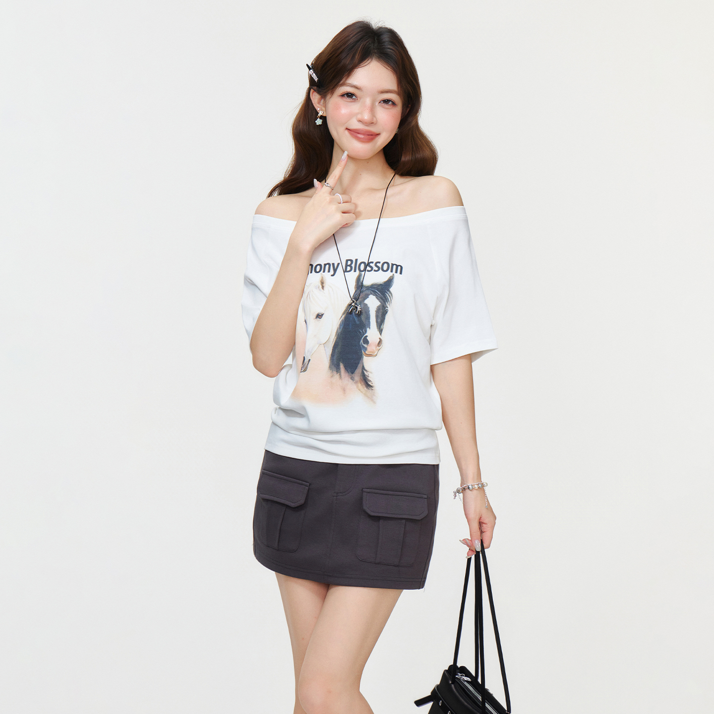 RY2777# 实拍实价设计感一字领露背小马印花短袖T恤女2026夏宽松显瘦上衣