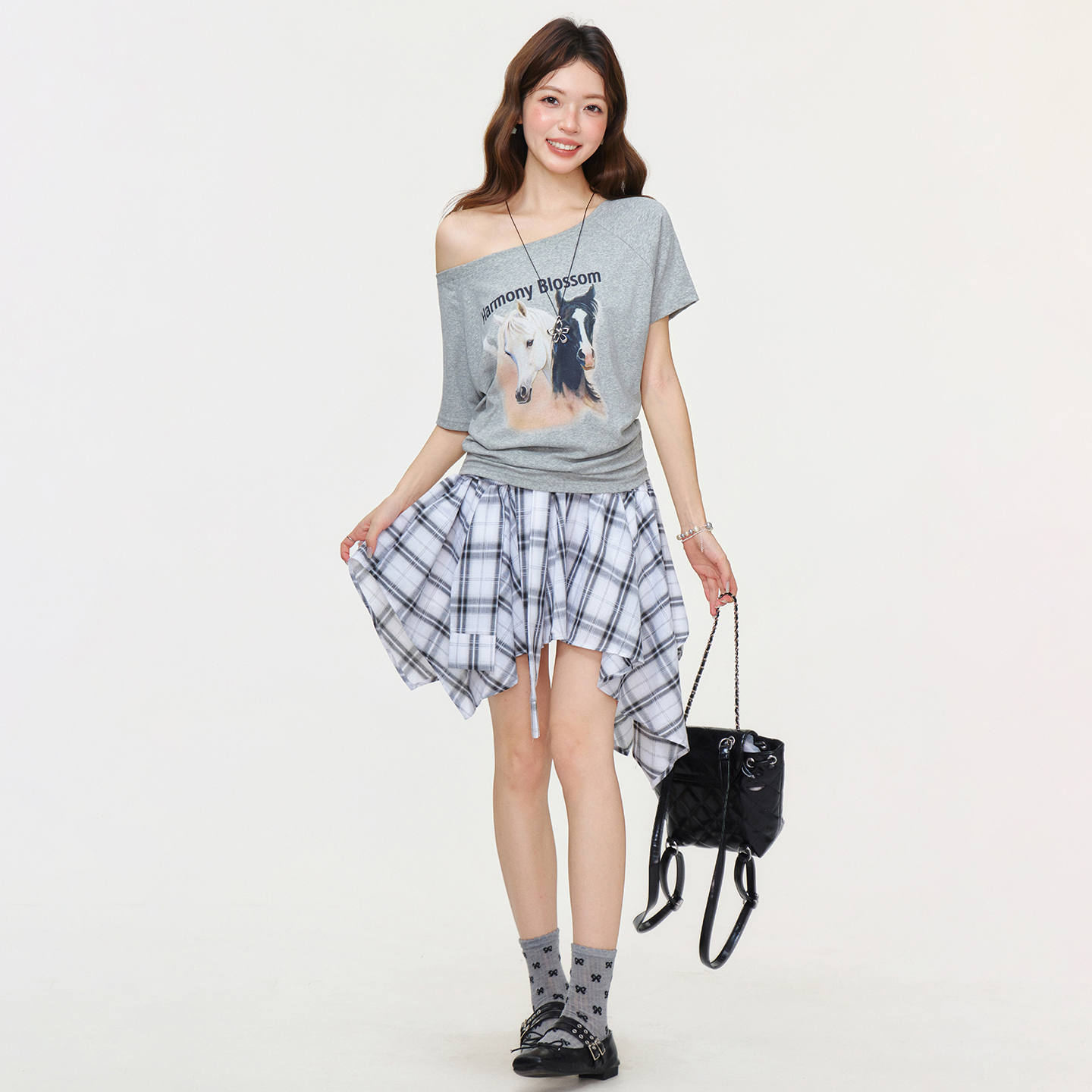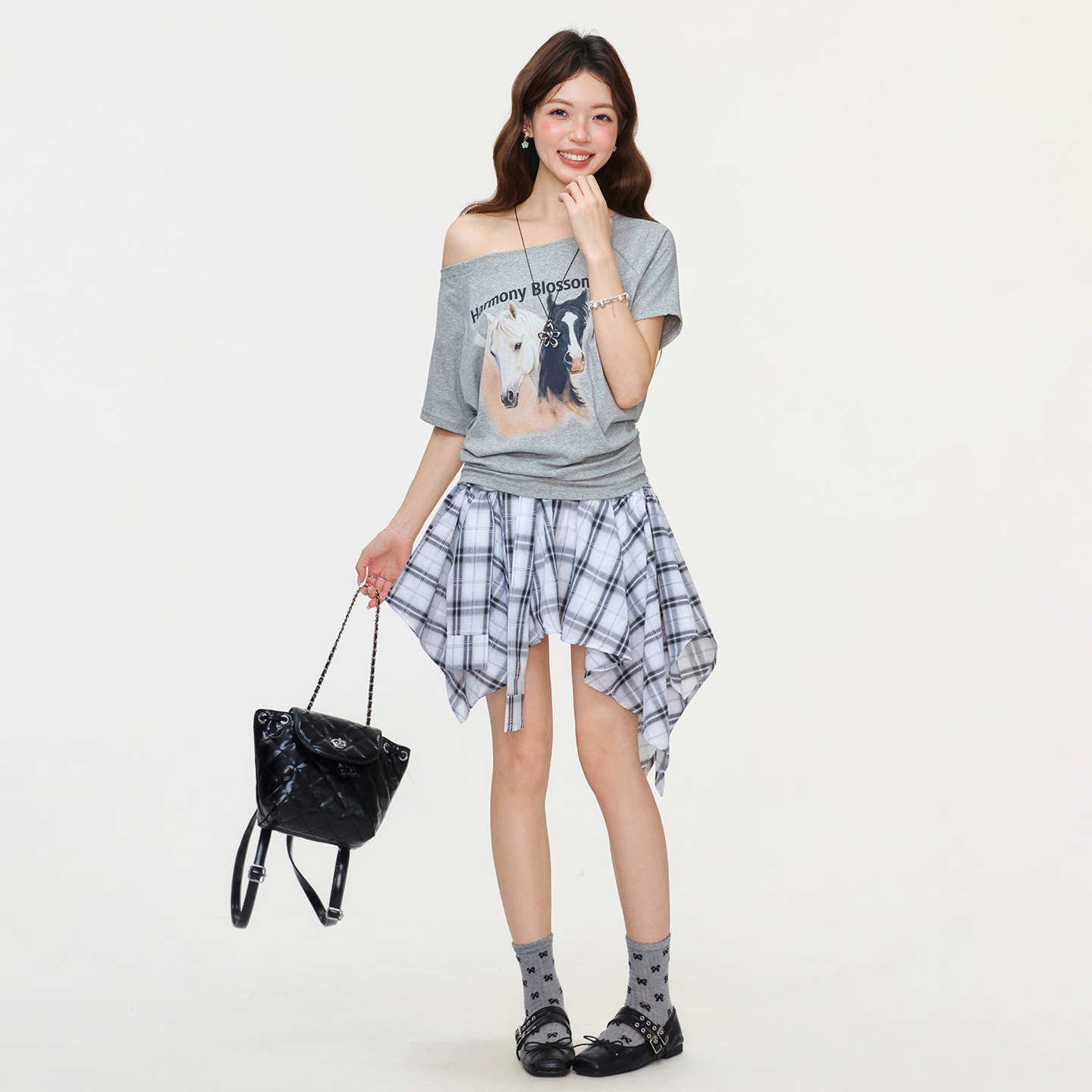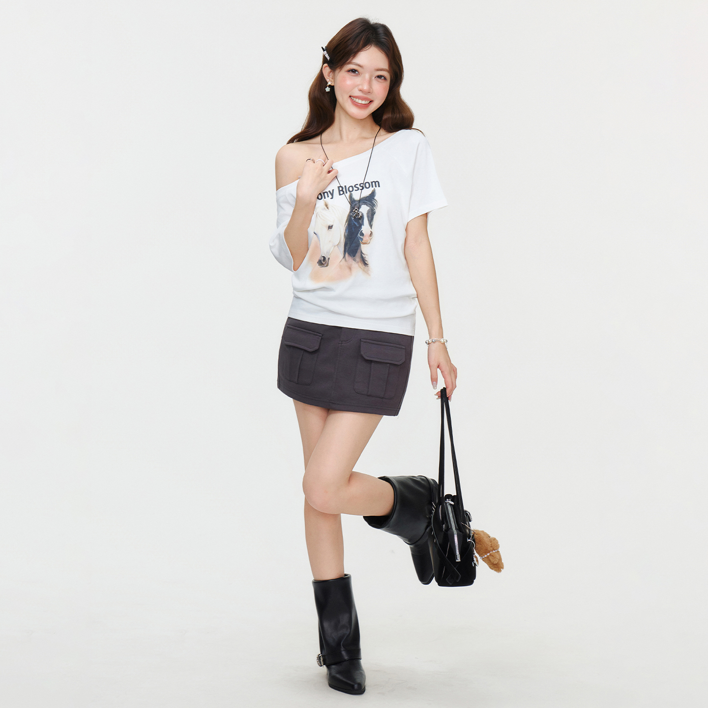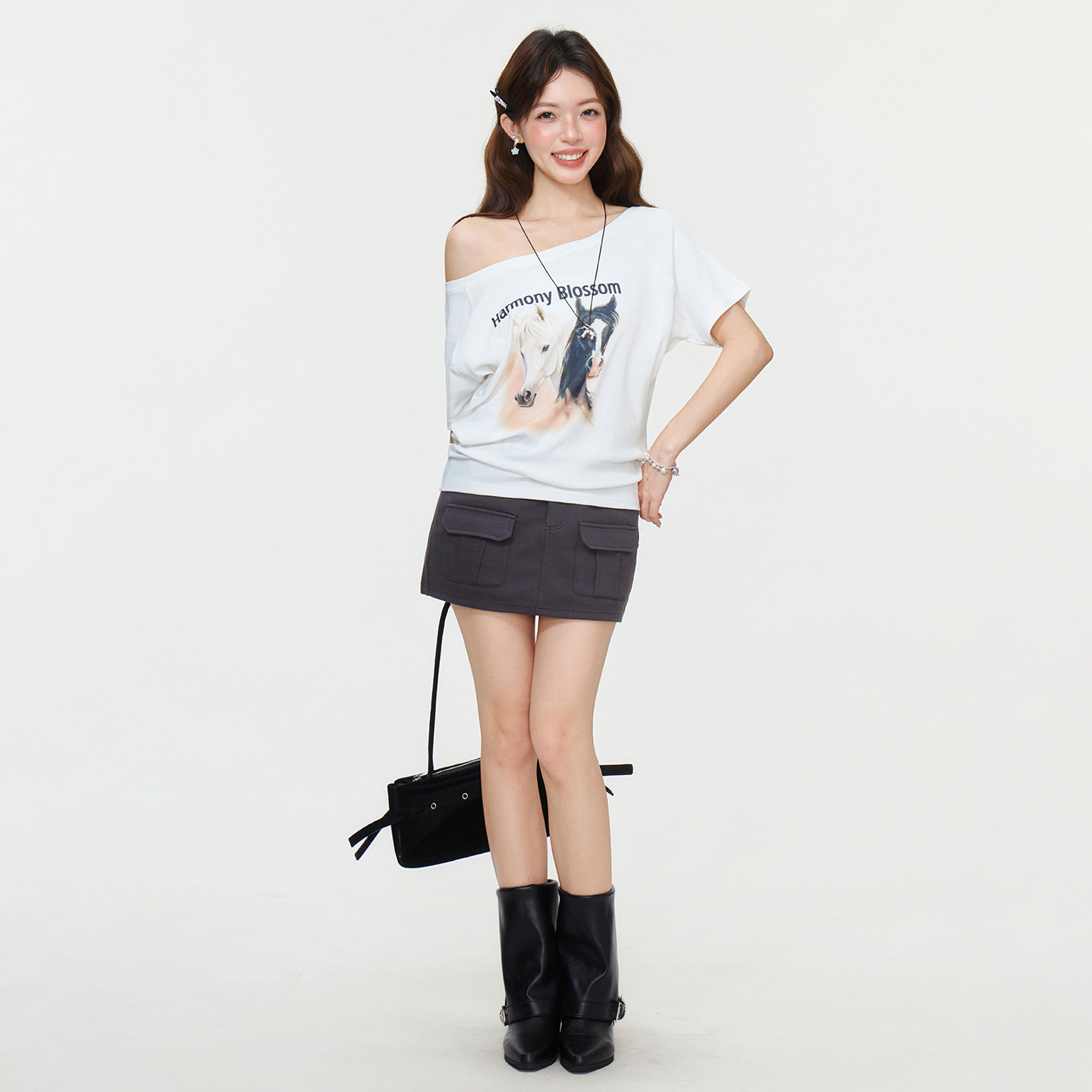 RY2777# 实拍实价设计感一字领露背小马印花短袖T恤女2026夏宽松显瘦上衣