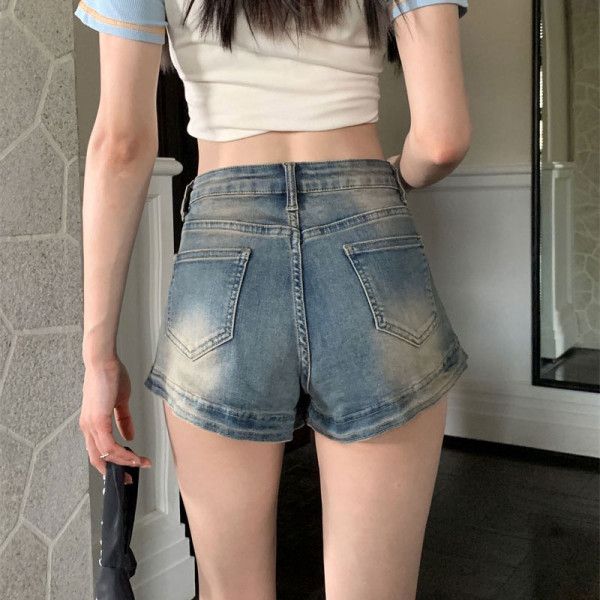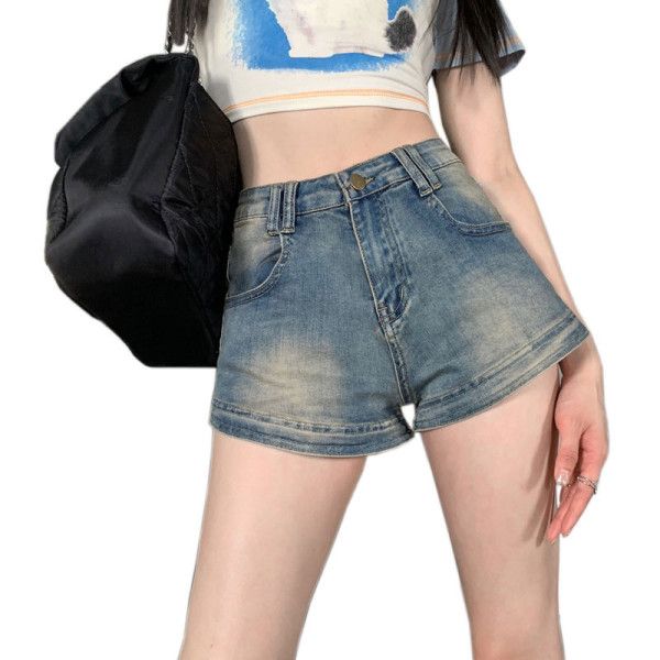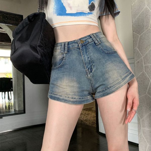 RY2783# 复古蓝色牛仔短裤女高腰水洗弹力a字热裤做旧子直筒修身显腿长潮