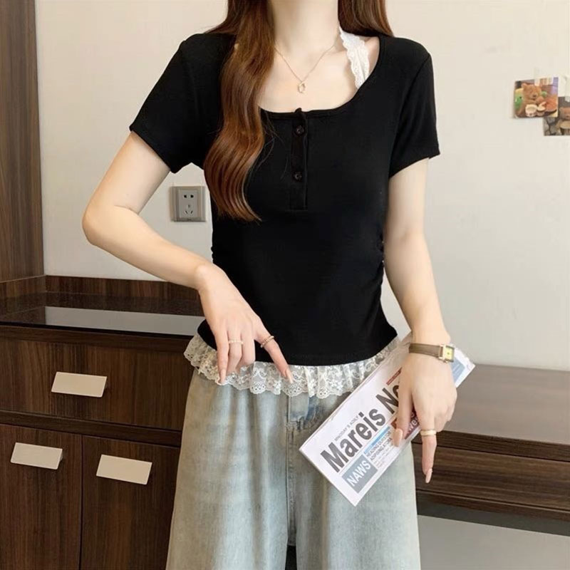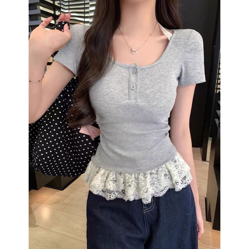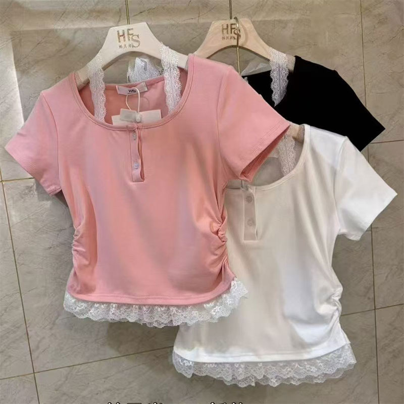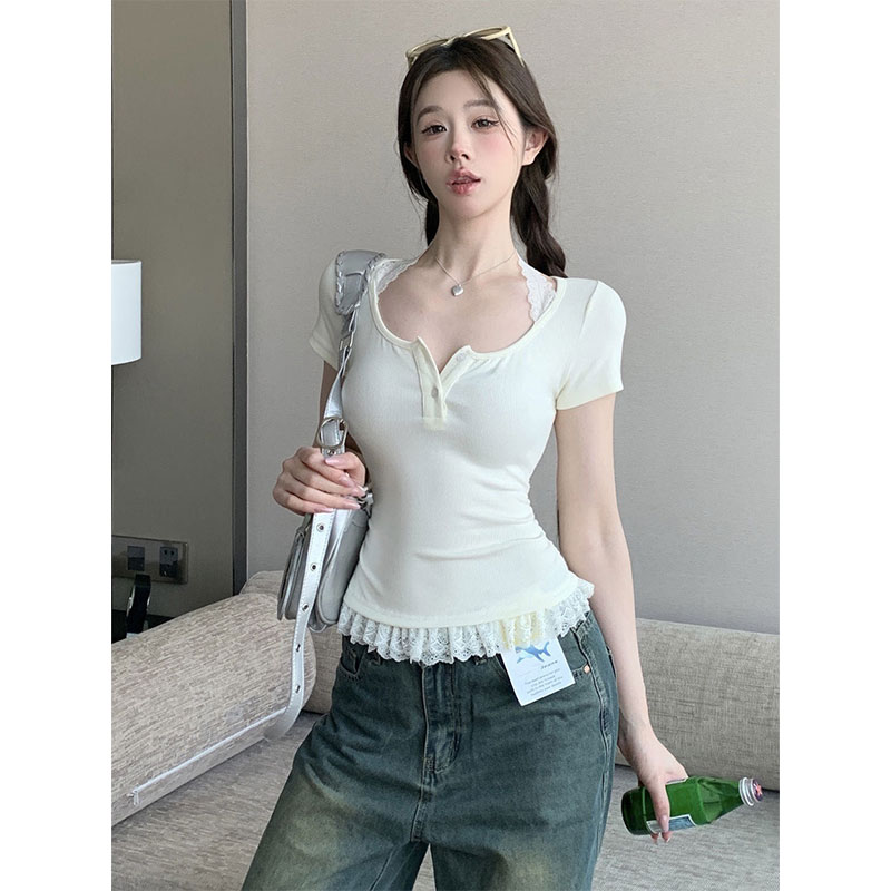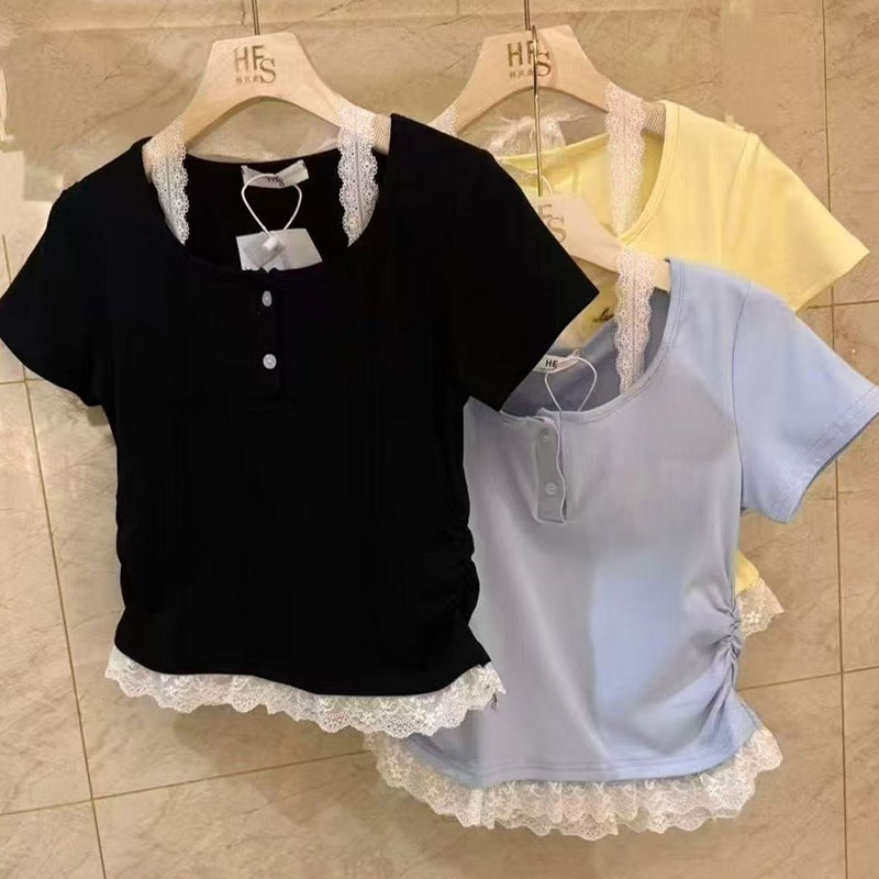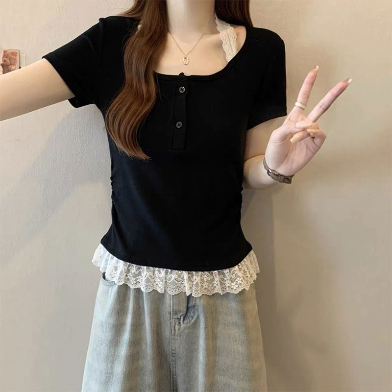RY2810# 纯欲风蕾丝挂脖假两件T恤女夏季韩系穿搭设计感小众气质上衣