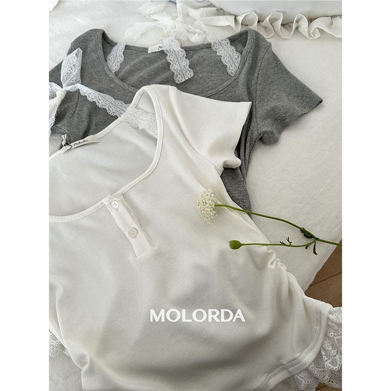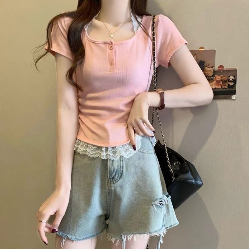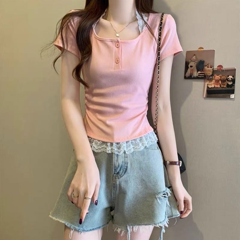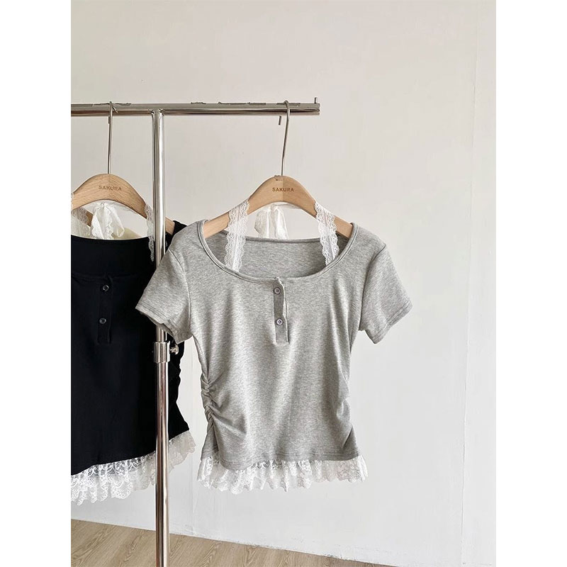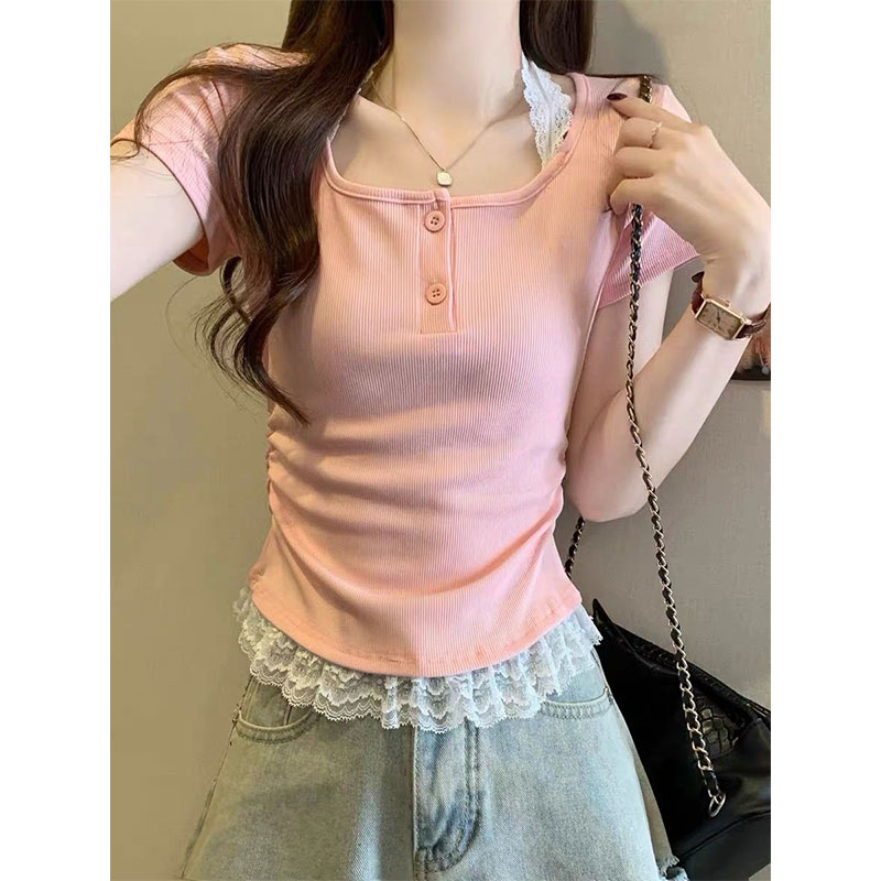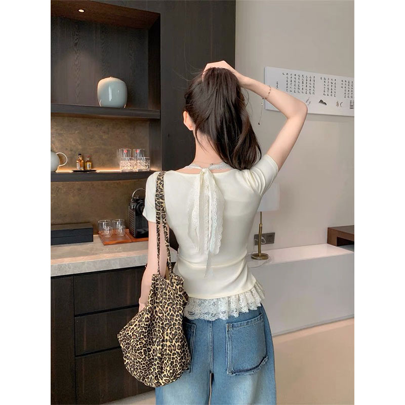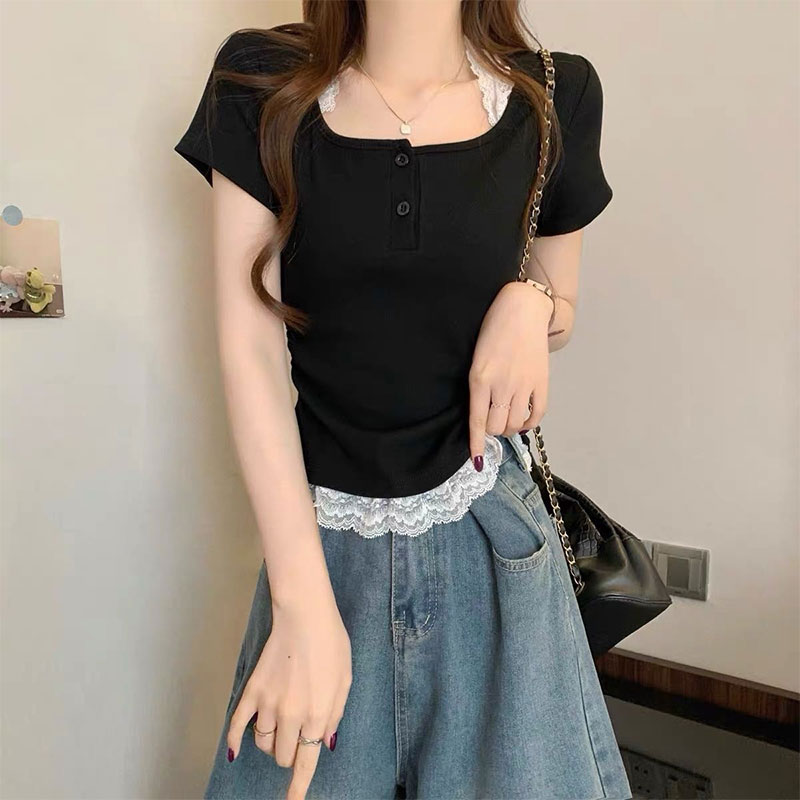 RY2810# 纯欲风蕾丝挂脖假两件T恤女夏季韩系穿搭设计感小众气质上衣