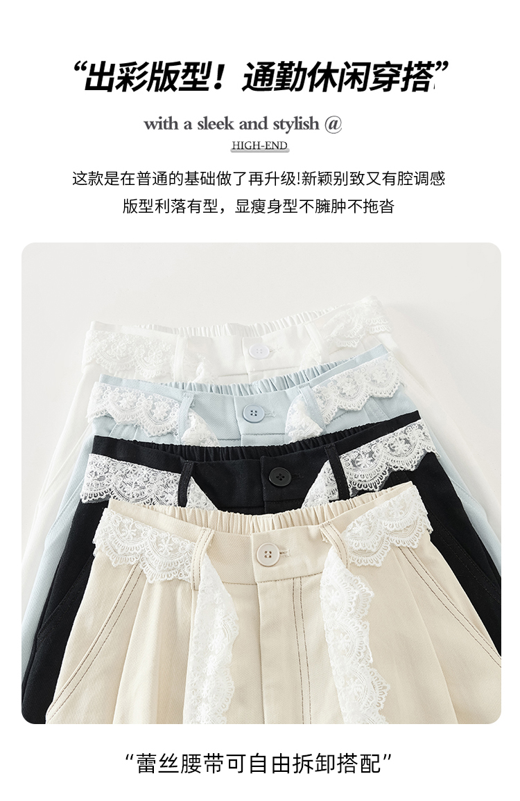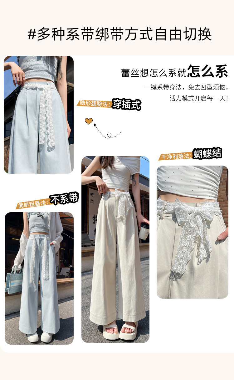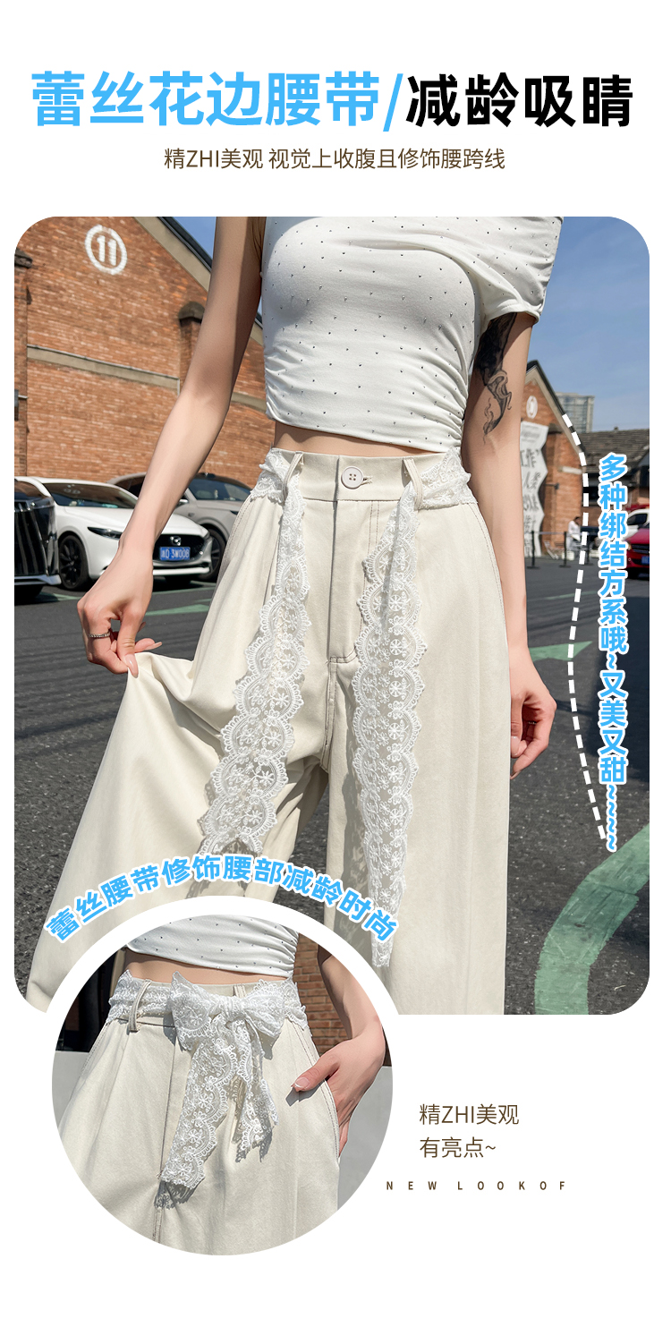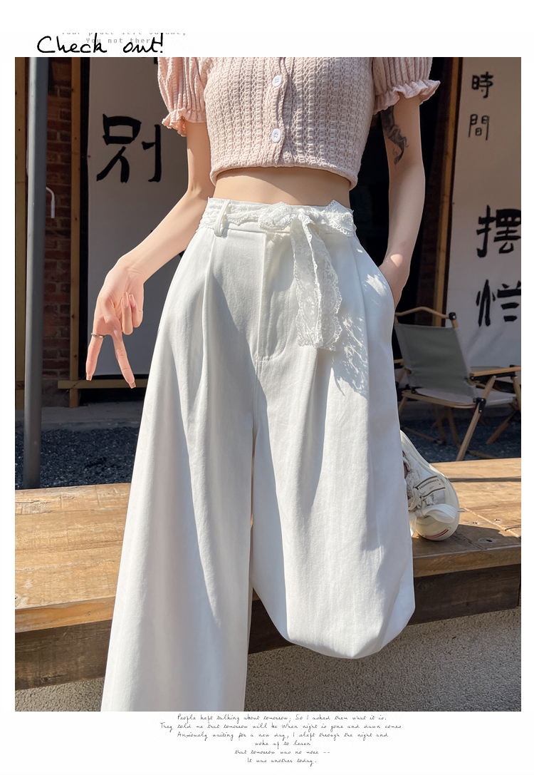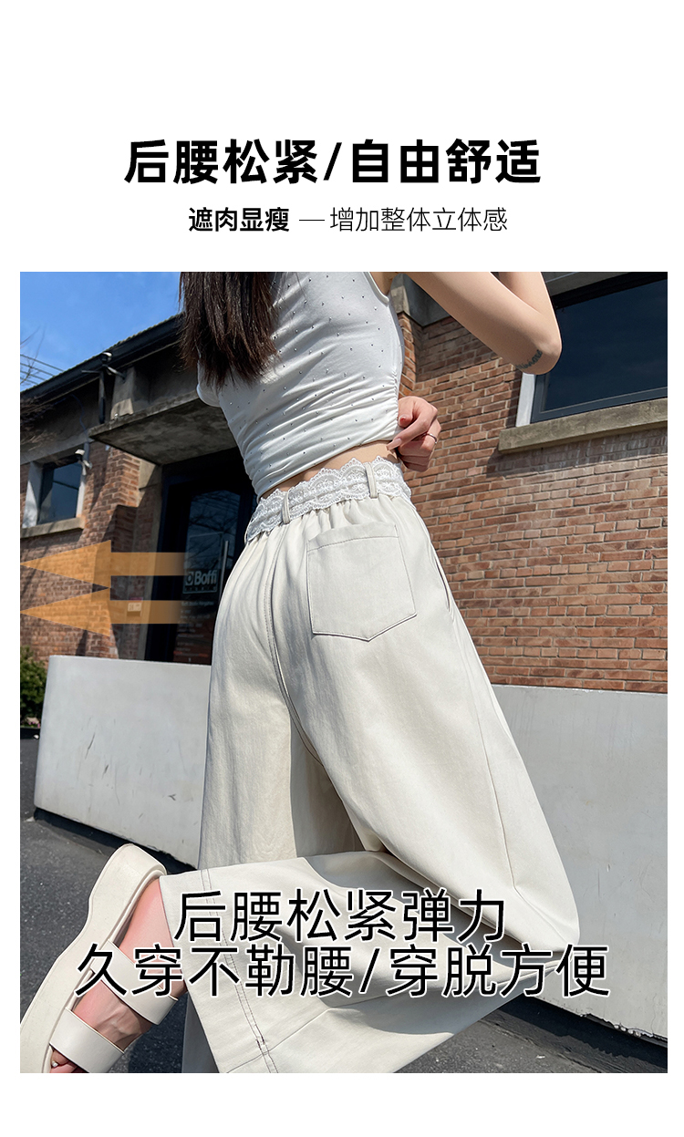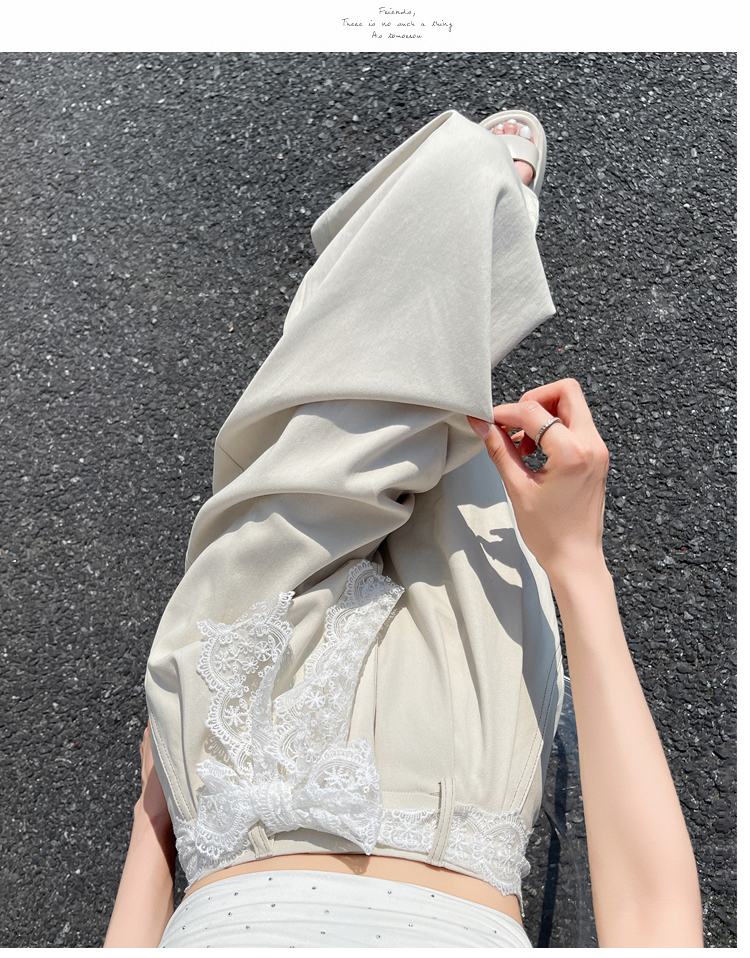 RY2814# 实拍蕾丝系带拼接洗水棉西装阔腿裤女夏季高腰宽松九分休闲直筒裤