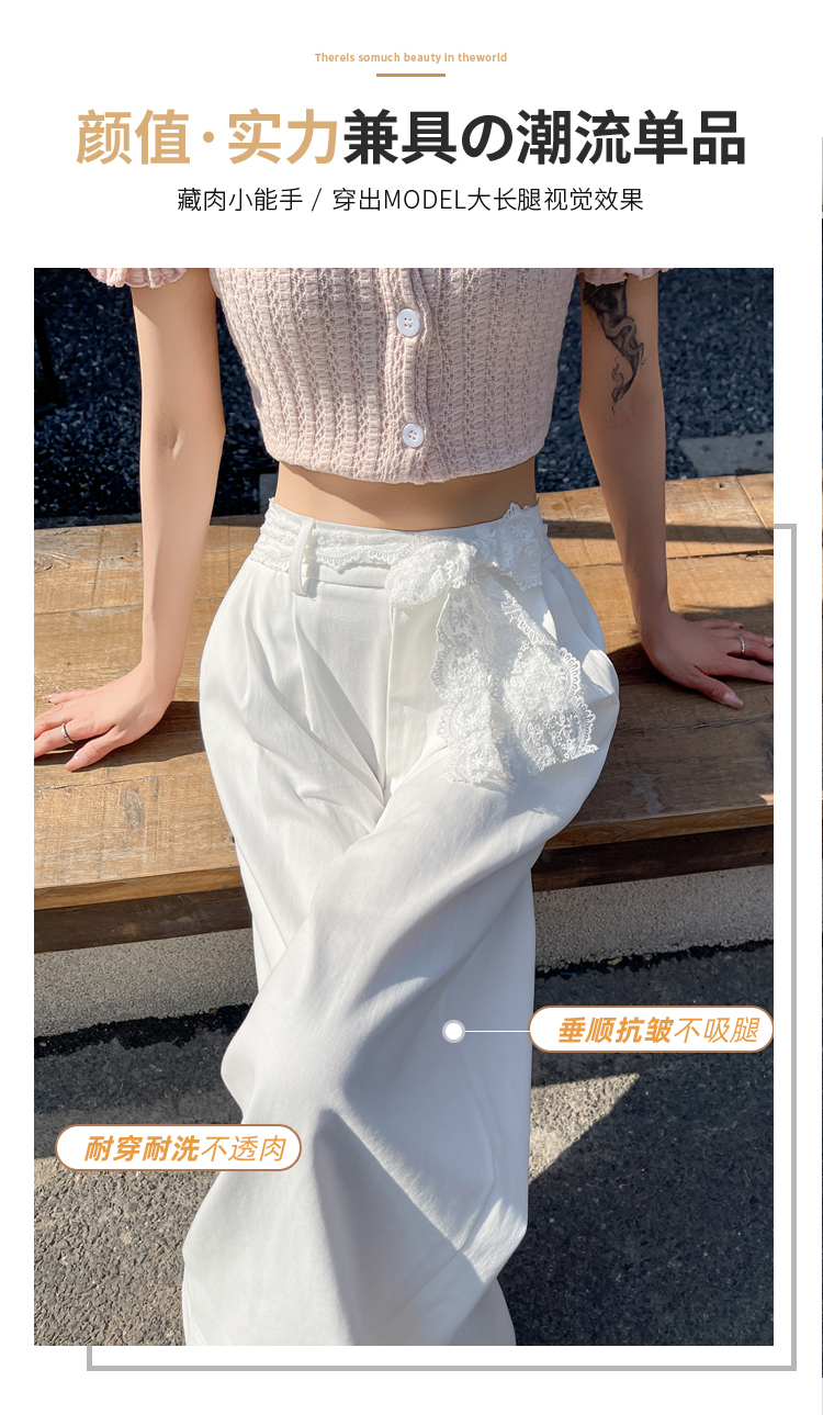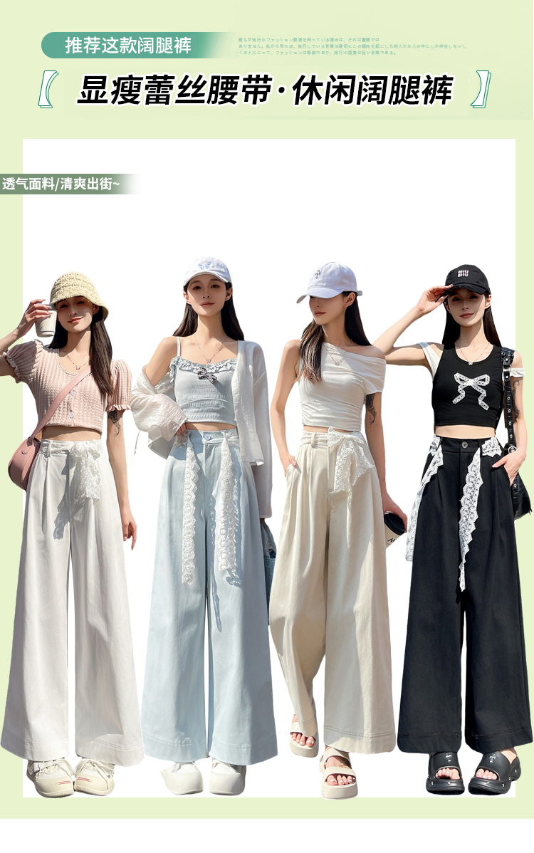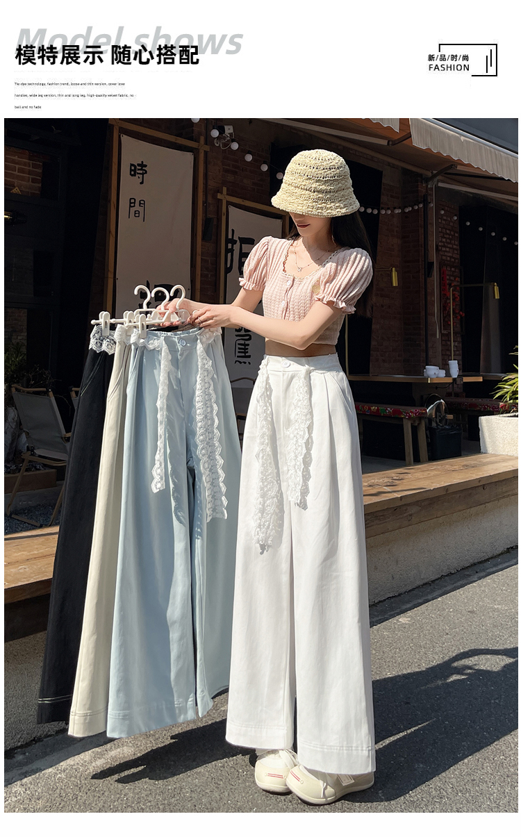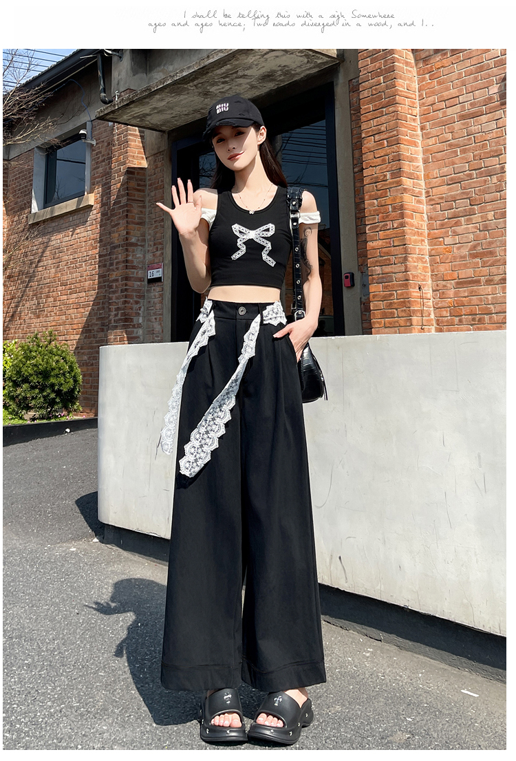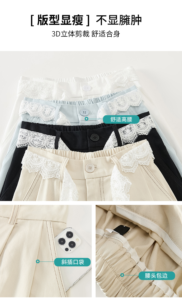 RY2814# 实拍蕾丝系带拼接洗水棉西装阔腿裤女夏季高腰宽松九分休闲直筒裤