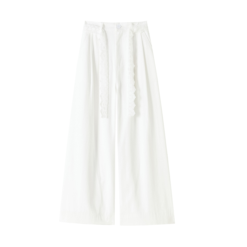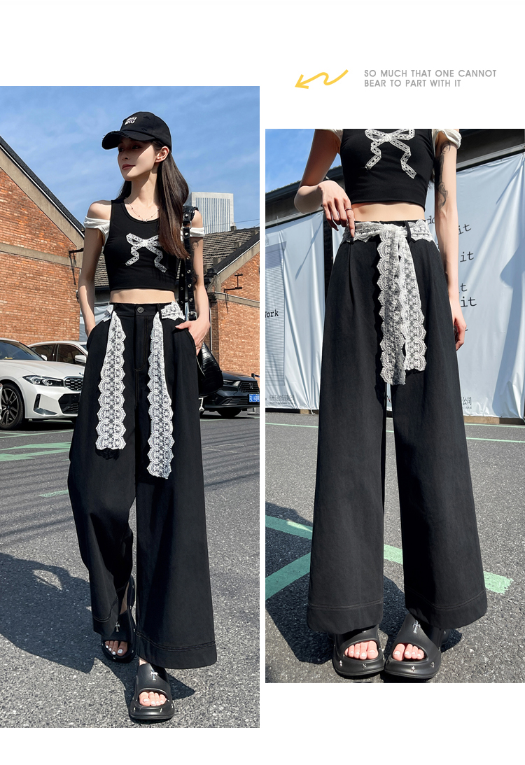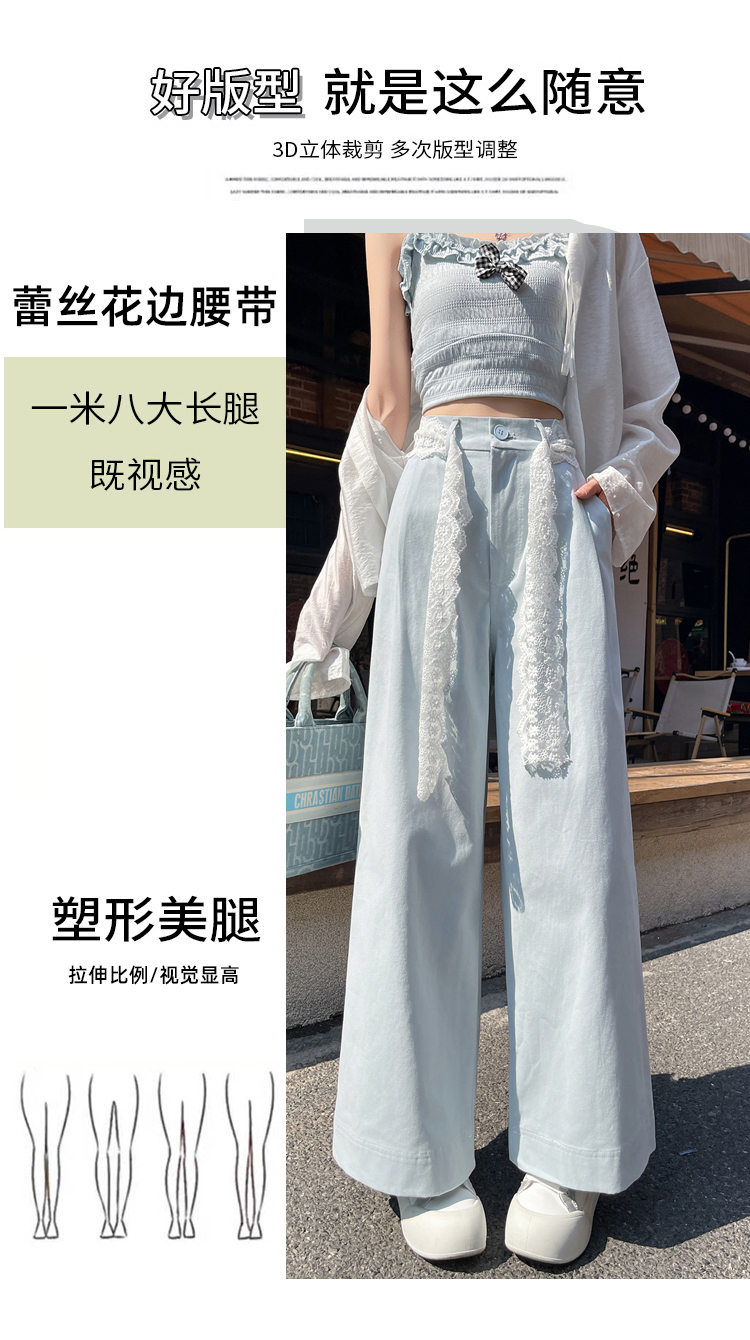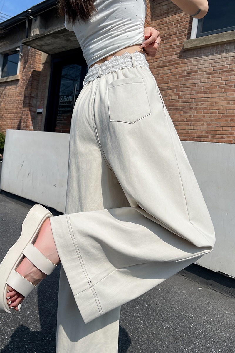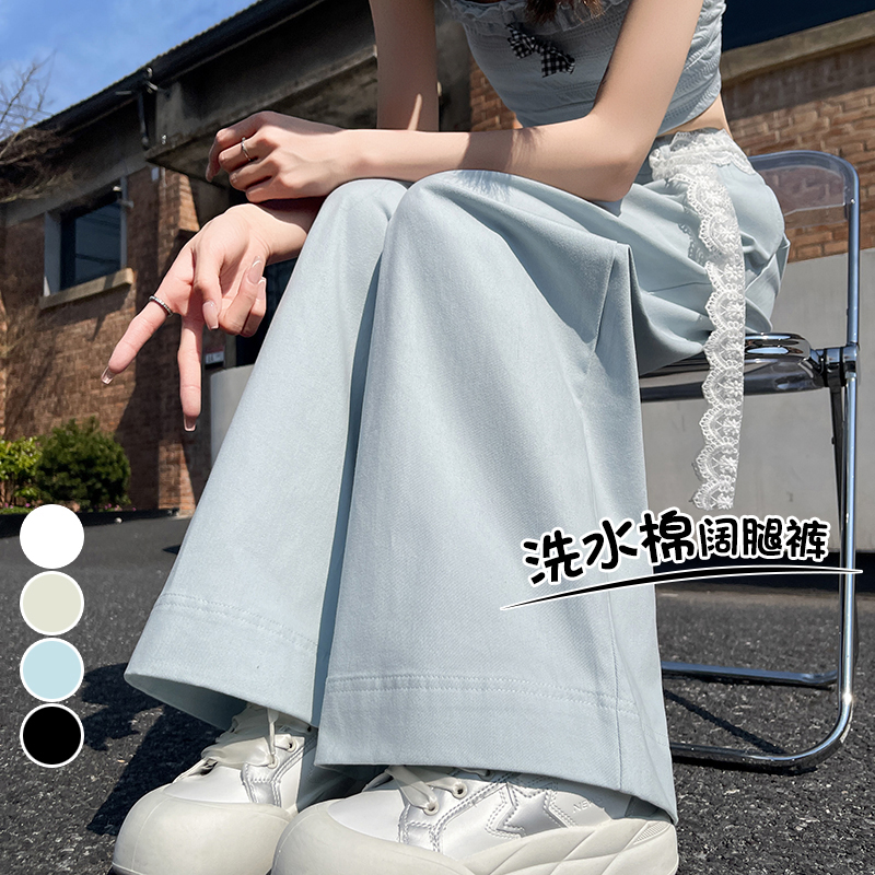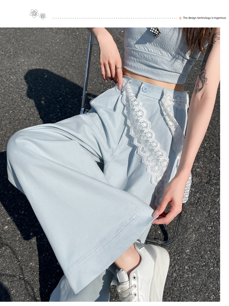 RY2814# 实拍蕾丝系带拼接洗水棉西装阔腿裤女夏季高腰宽松九分休闲直筒裤