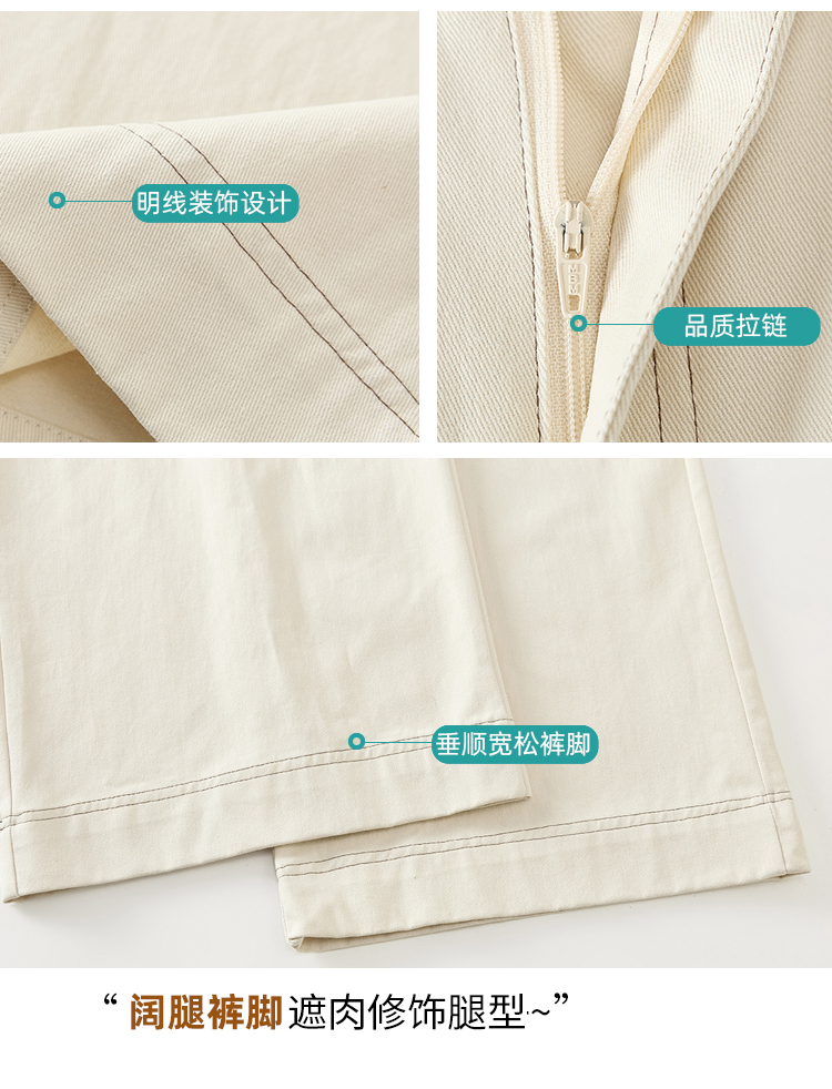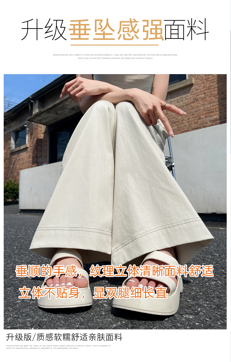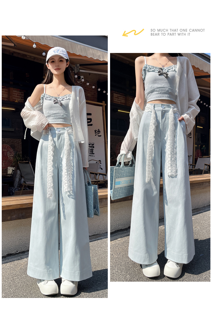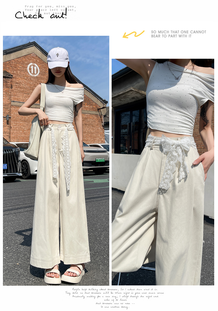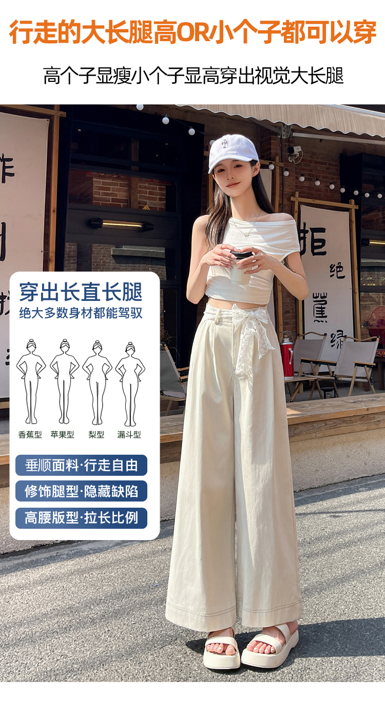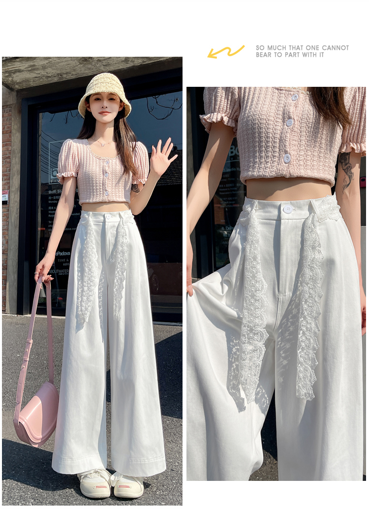 RY2814# 实拍蕾丝系带拼接洗水棉西装阔腿裤女夏季高腰宽松九分休闲直筒裤