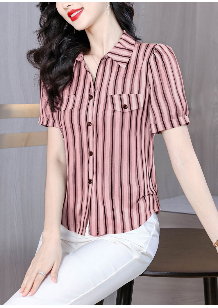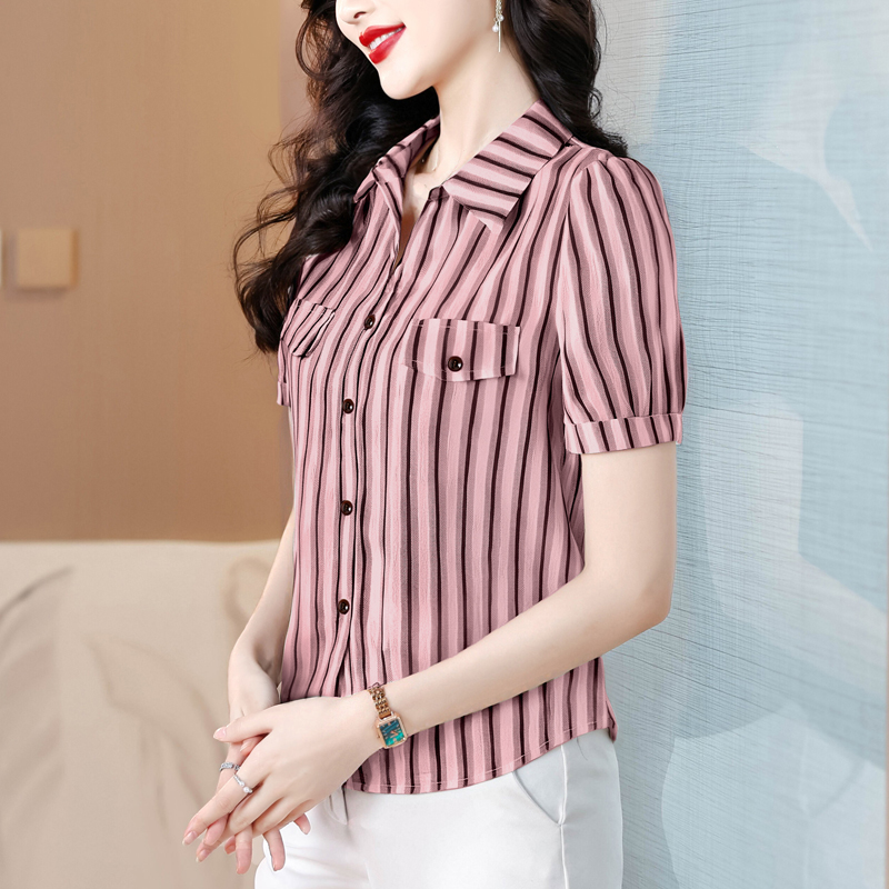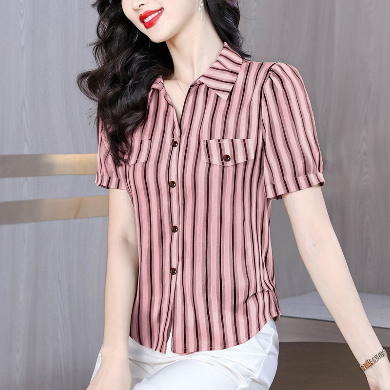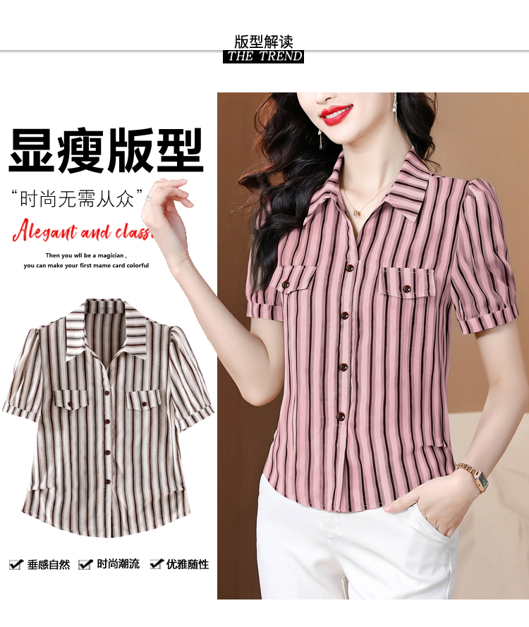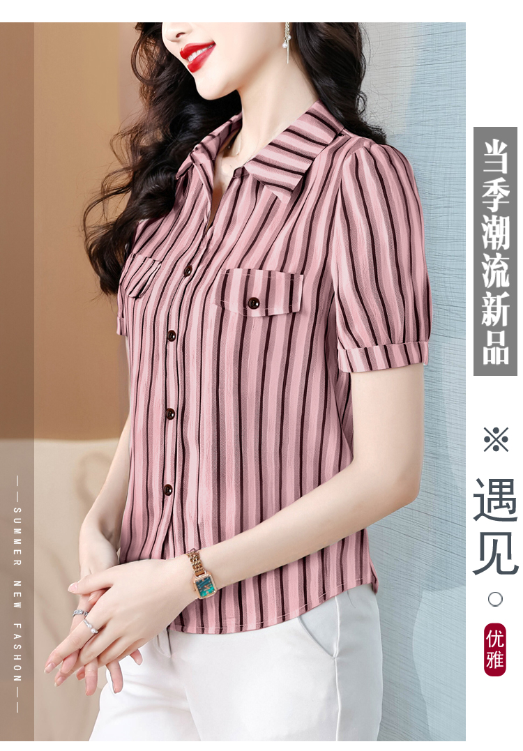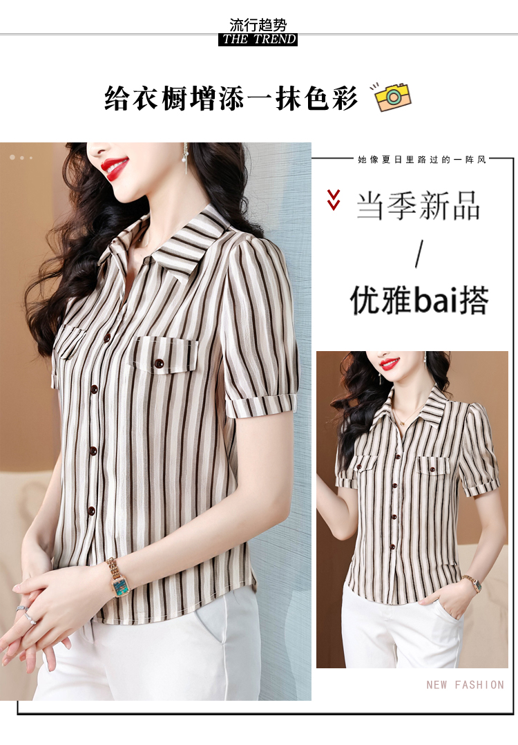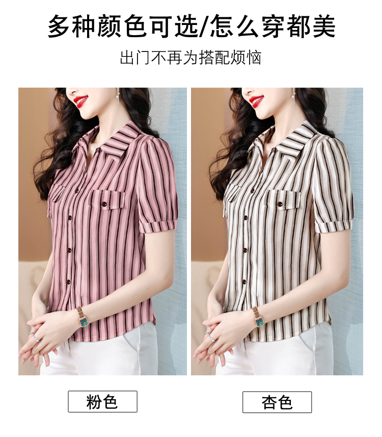 RY2828# 条纹半袖衬衫上衣洋气时尚夏季透气雪纺衫宽松百搭气质衬衣小衫