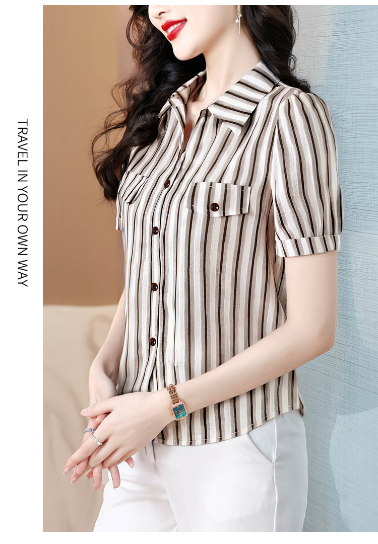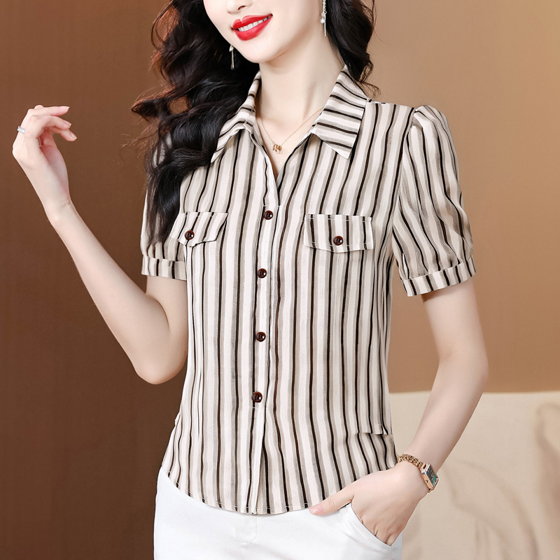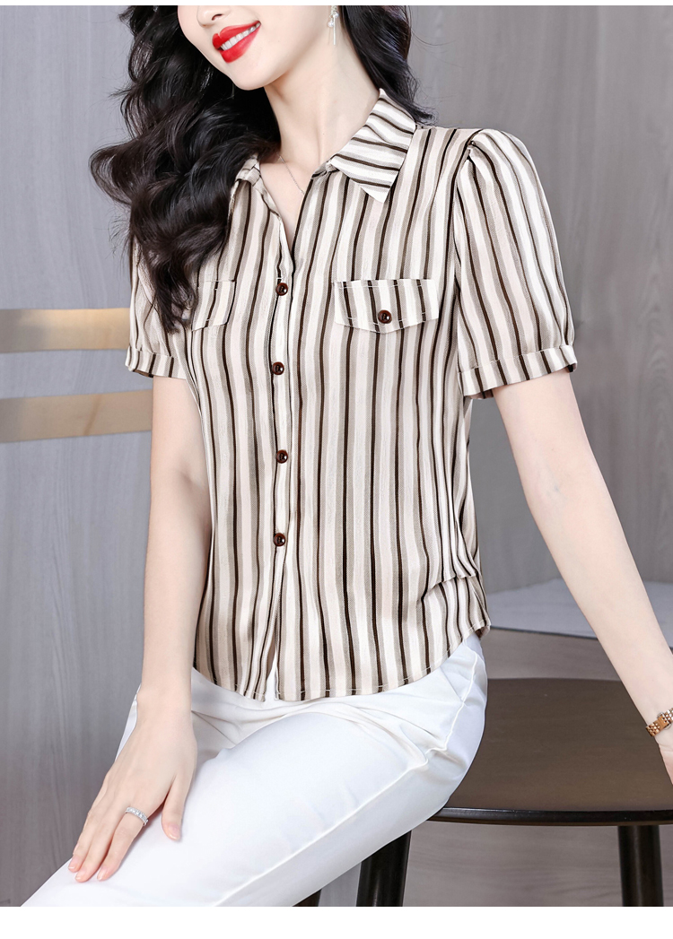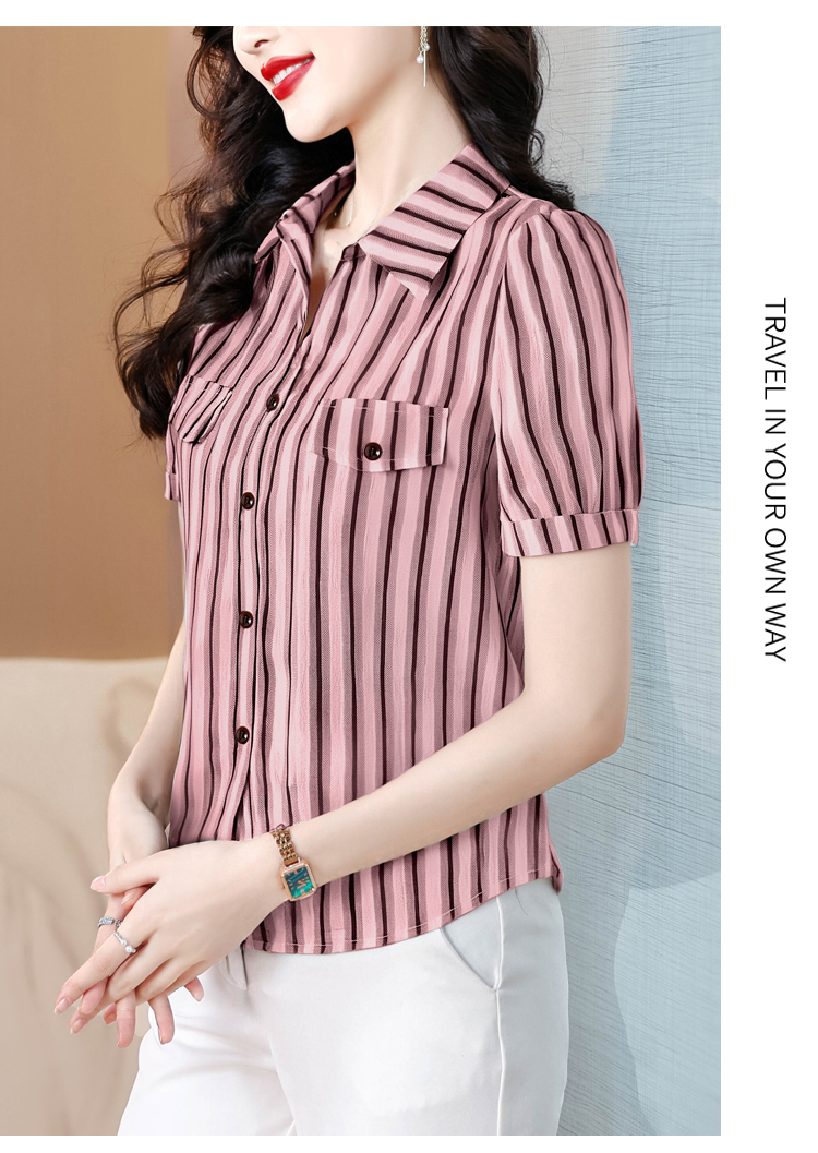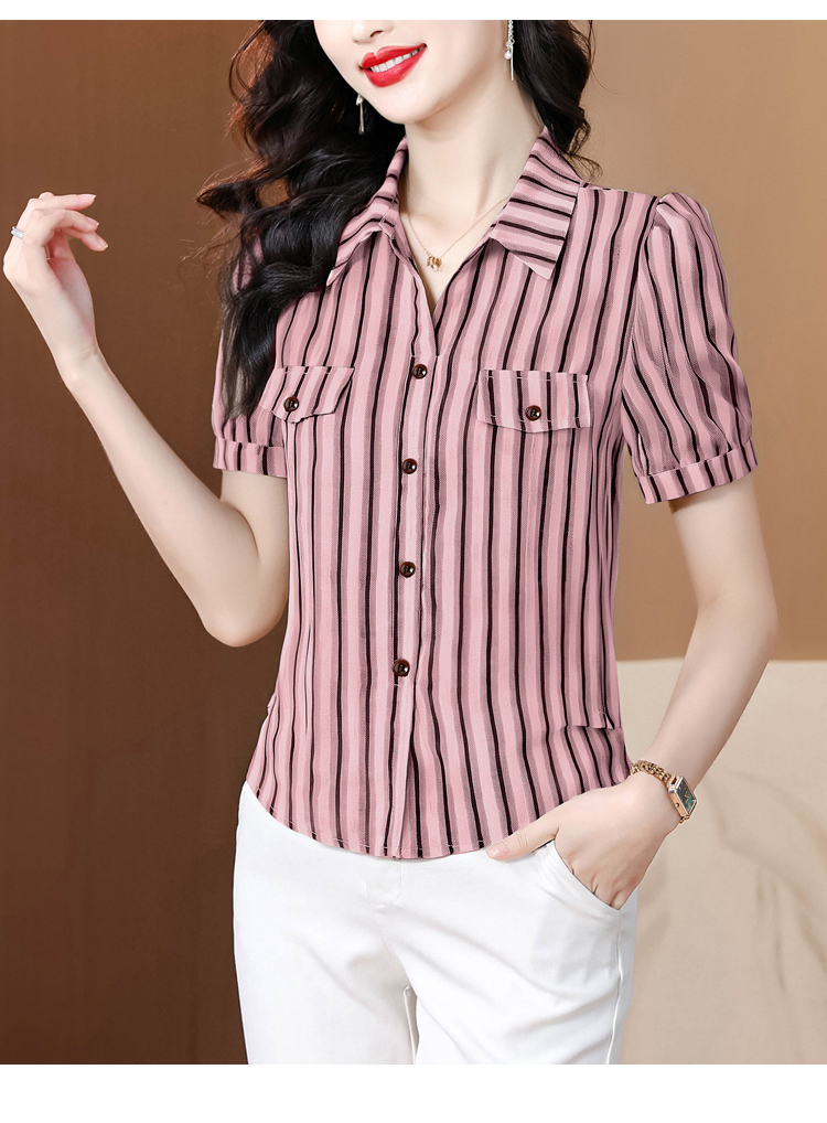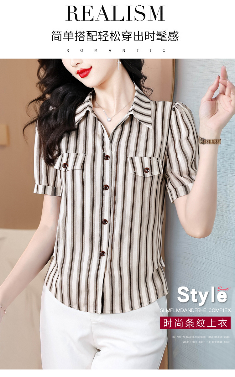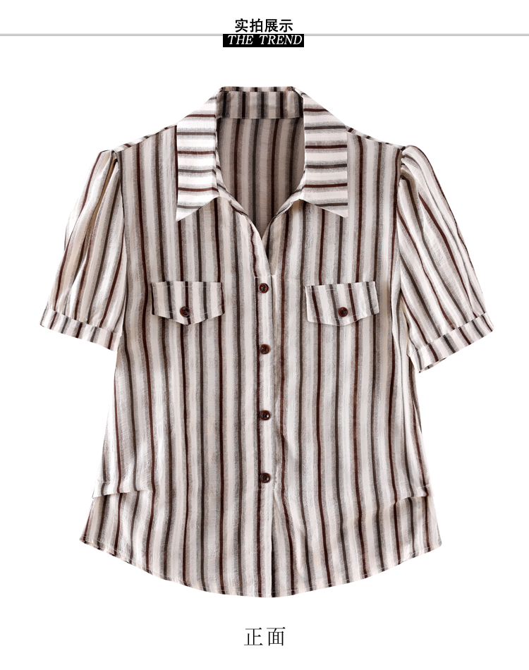 RY2828# 条纹半袖衬衫上衣洋气时尚夏季透气雪纺衫宽松百搭气质衬衣小衫